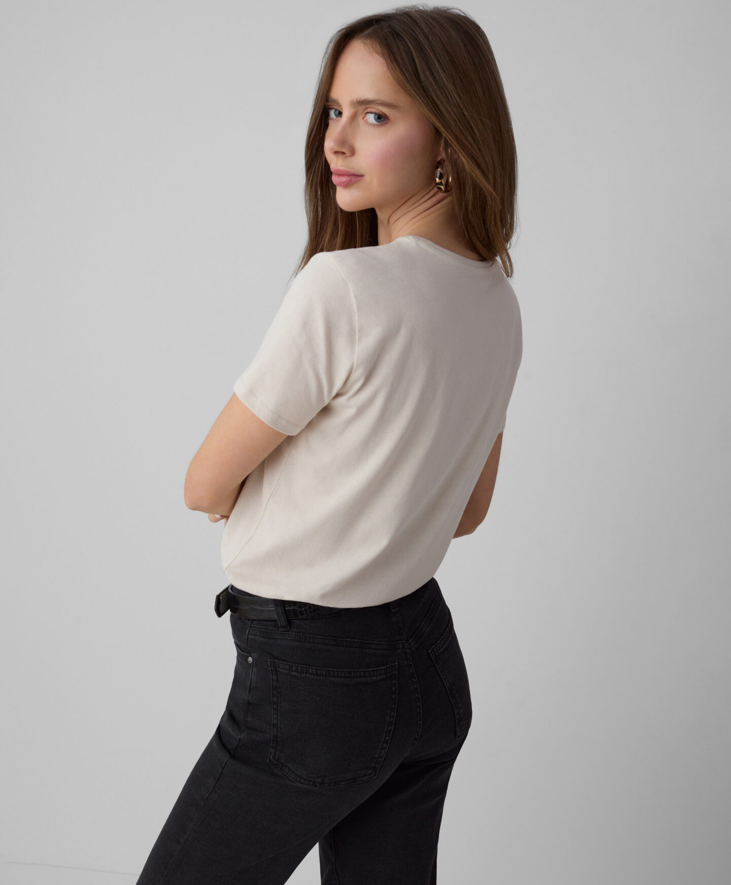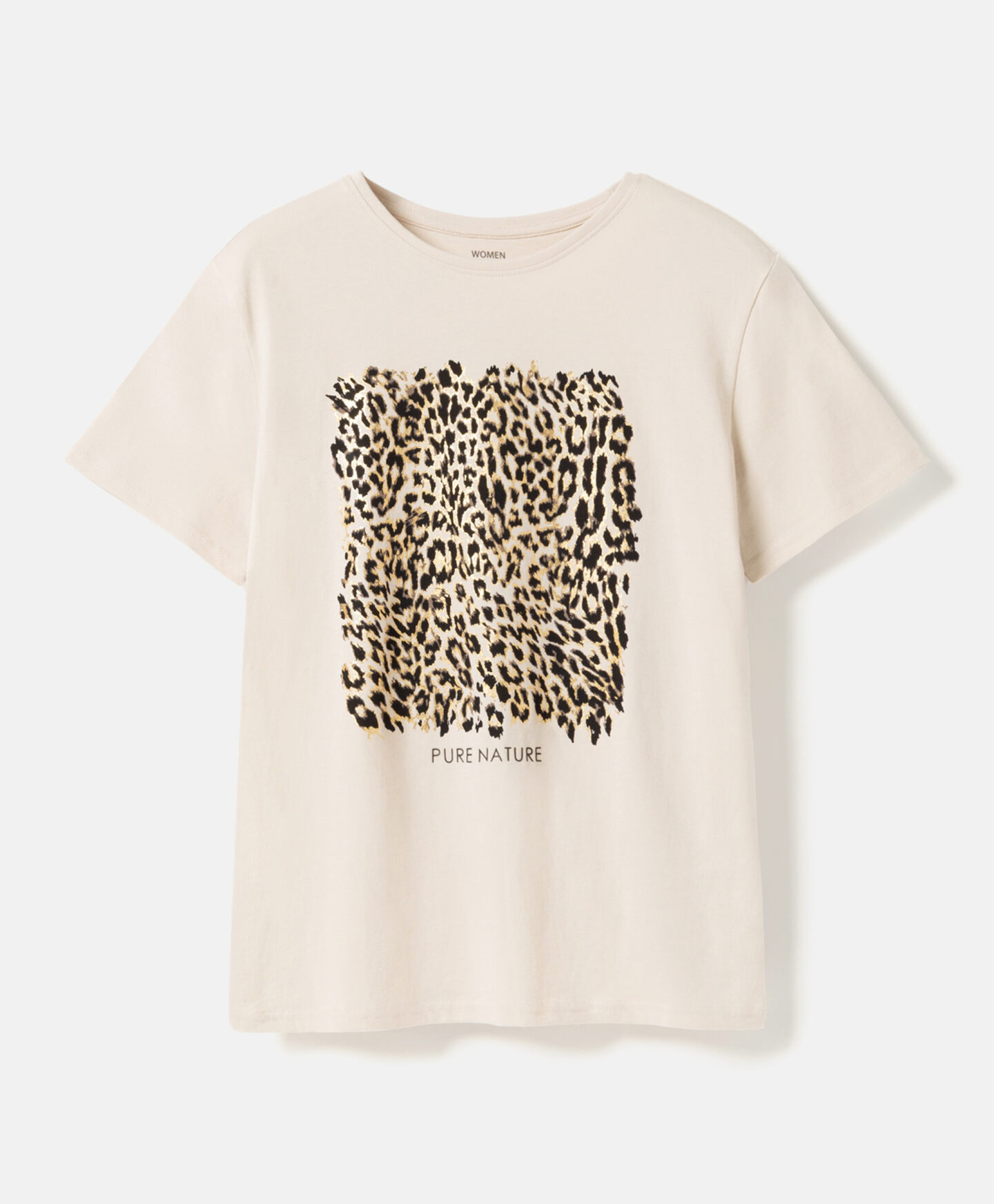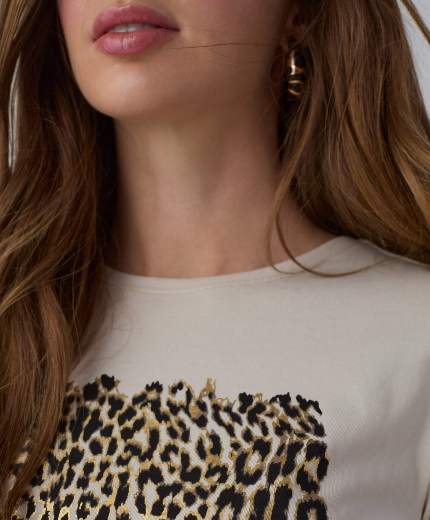 Bež majica s leopard uzorkom za žene, napravljena od 100% pamuka, daje sjaj svakom outfitu. Prirodni materijal nježan je prema koži i pruža potpunu udobnost. Majica se lako kombinuje. S trenerkama ili jeansom stvara svestran izgled, dok elegantni dodaci daju profinjen efekat.