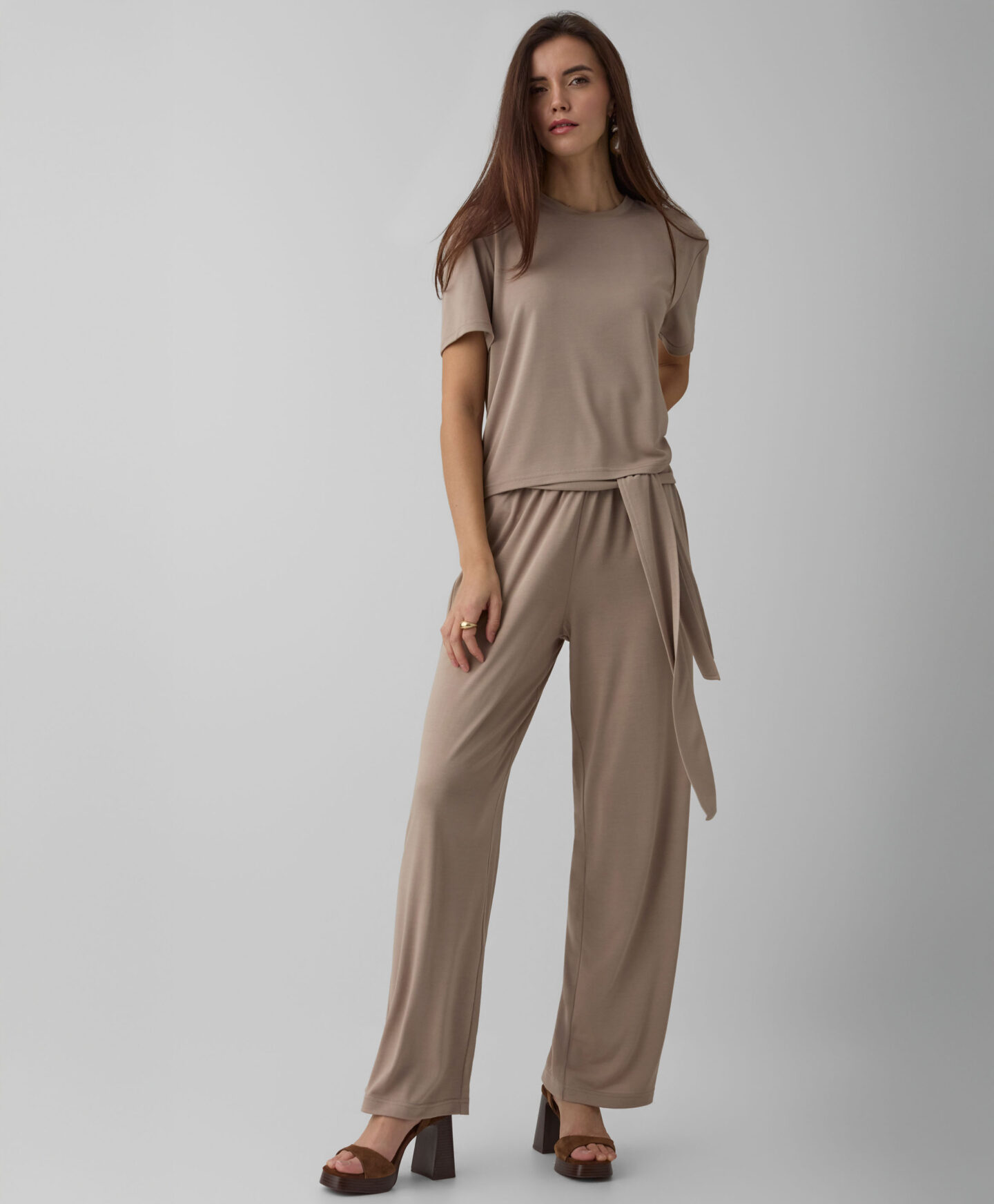 Bež majica kratkih rukava za žene čini komplet s hlačama s vezicom, ali se jednako lijepo kombinuje s većinom odjeće u garderobi. Klasičan kroj i bezvremenska boja nikada ne izlaze iz mode. Lagani materijal s dodatkom viskoze prijatan je na dodir i lagan za nošenje. Majica osigurava udobnost tokom cijelog dana. Dostupna u dvije varijante iz kolekcije.