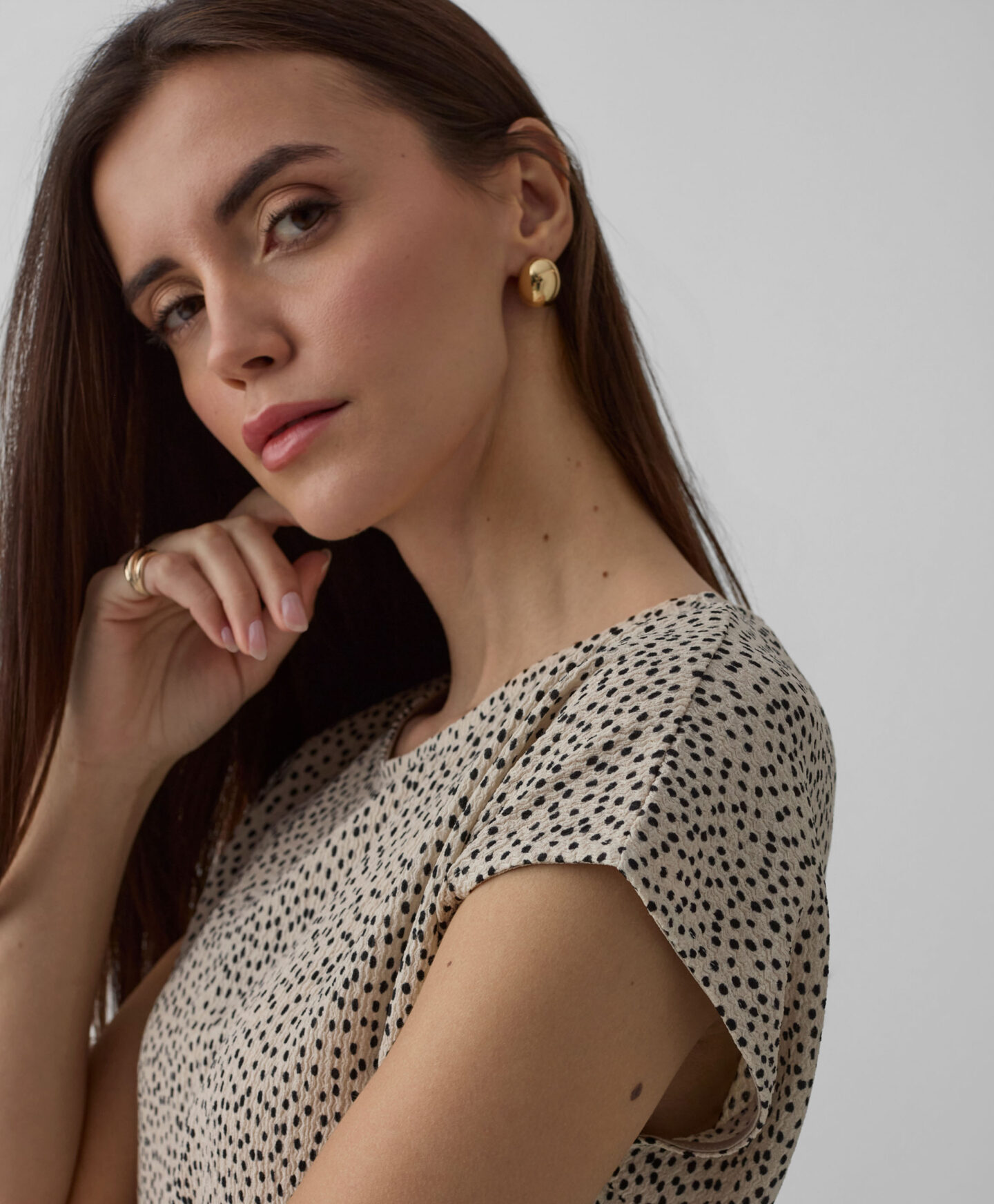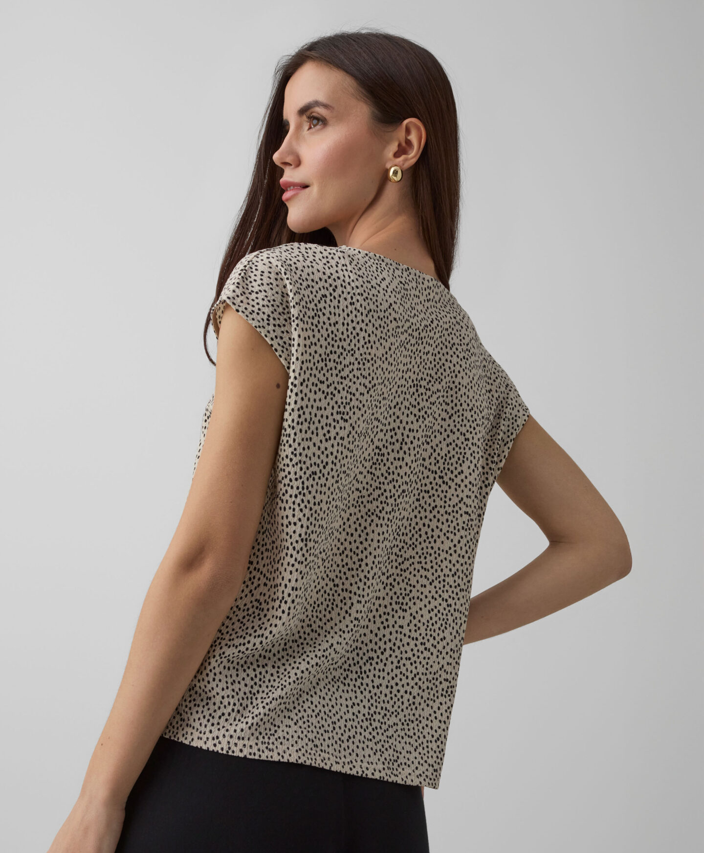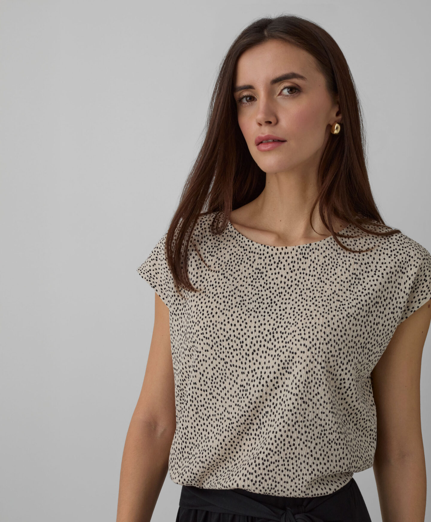 Bež naborana košulja za žene čini komplet sa suknjom iz kolekcije, ali se može lako kombinovati i s jeansom ili elegantnijim hlačama. Kratki rukavi čine je idealnom za slojevito oblačenje u prijelaznim periodima. Odlično se slaže sa sakoom ili jednostavnim kardiganom.