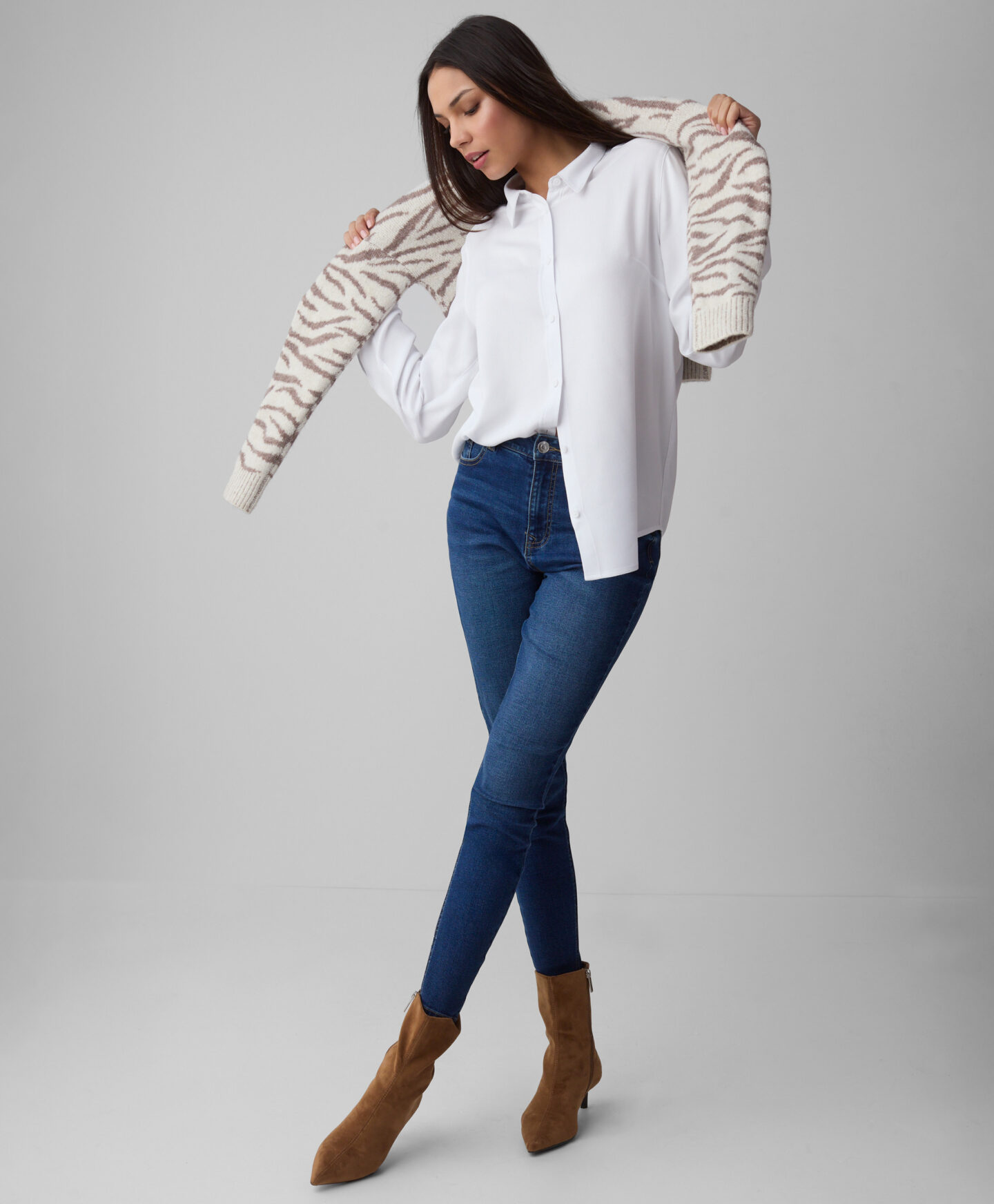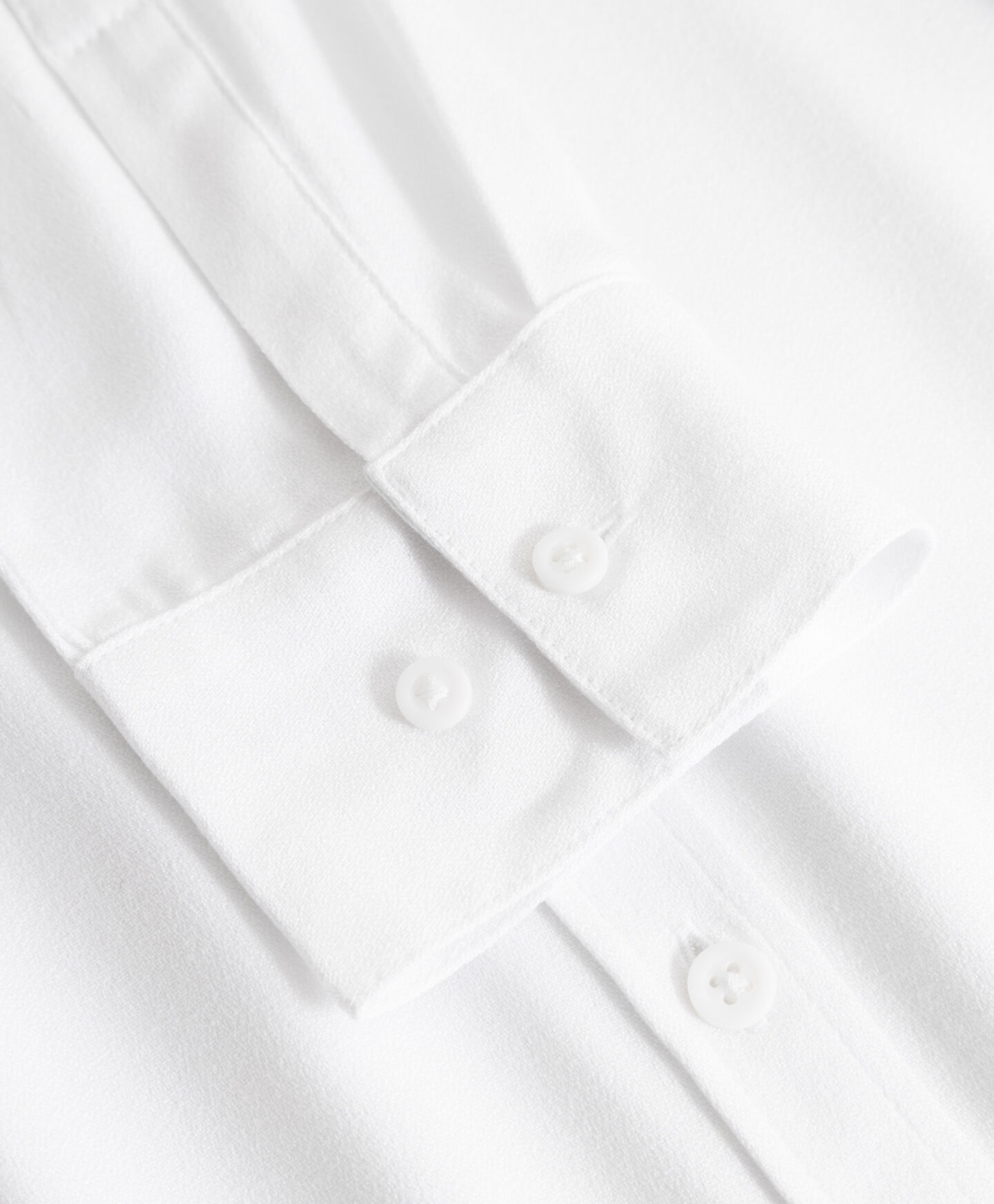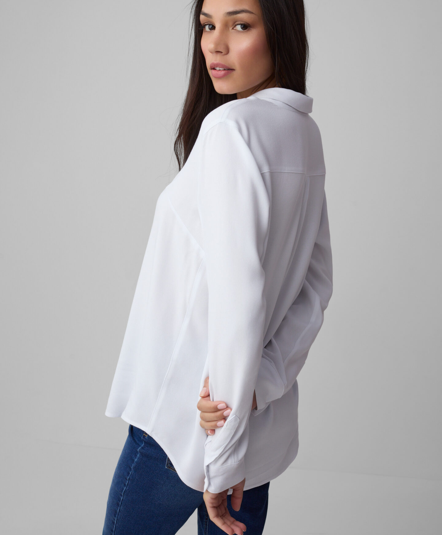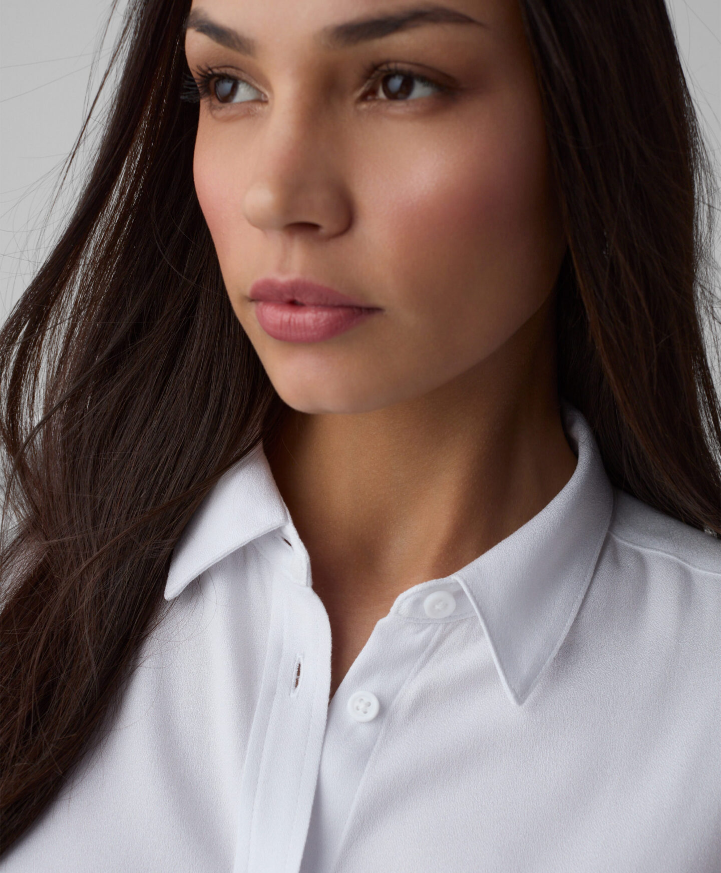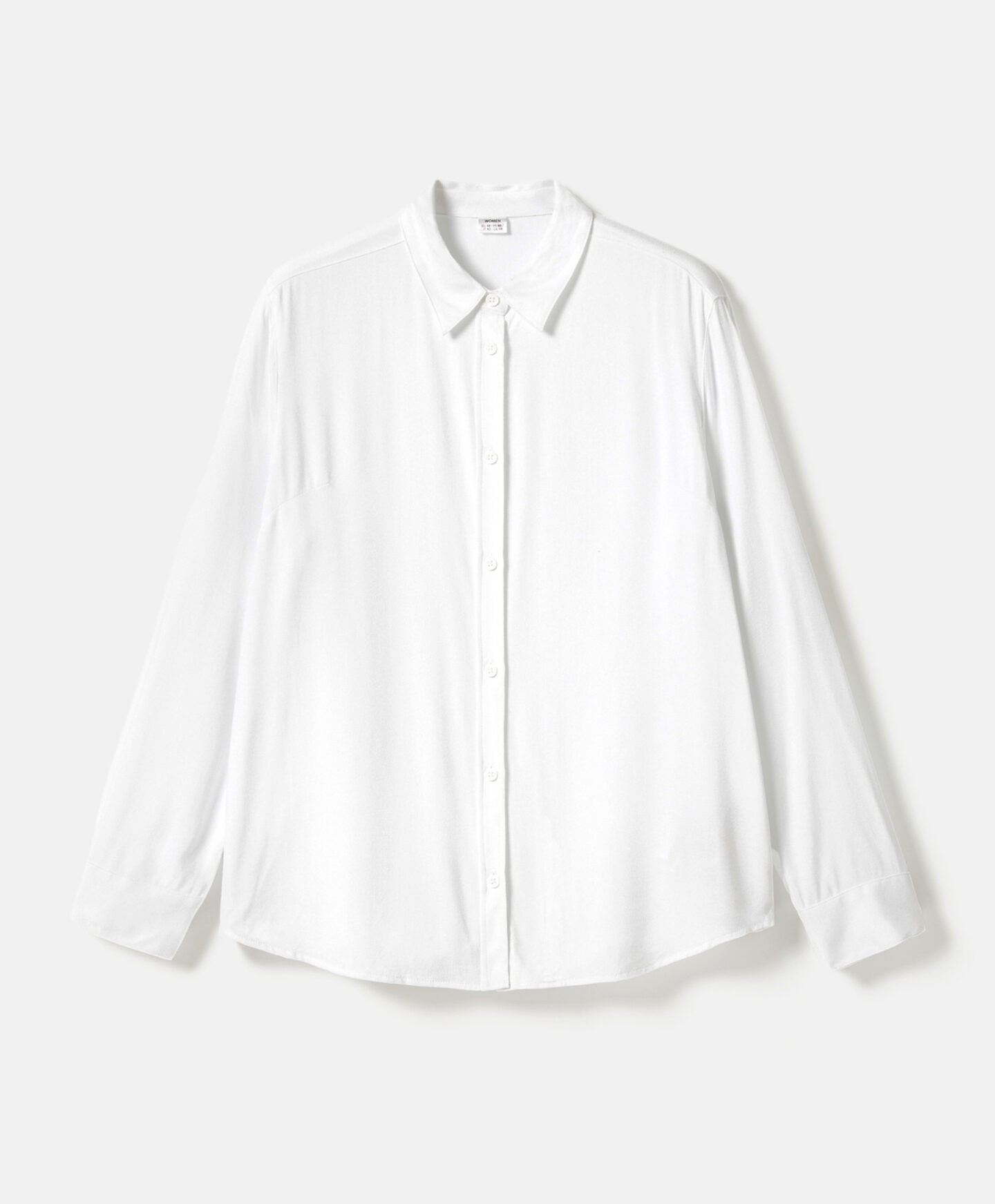 Bijela košulja za žene, napravljena od 100% viskoze, kombinuje udobnost i bezvremenski stil. Mekana je, prozračna i izuzetno prijatna na dodir. Klasičan kroj i elegantna bijela boja čine je vrlo svestranim komadom garderobe. Minimalistički dizajn odlično funkcioniše i u ležernim i u formalnim kombinacijama.
