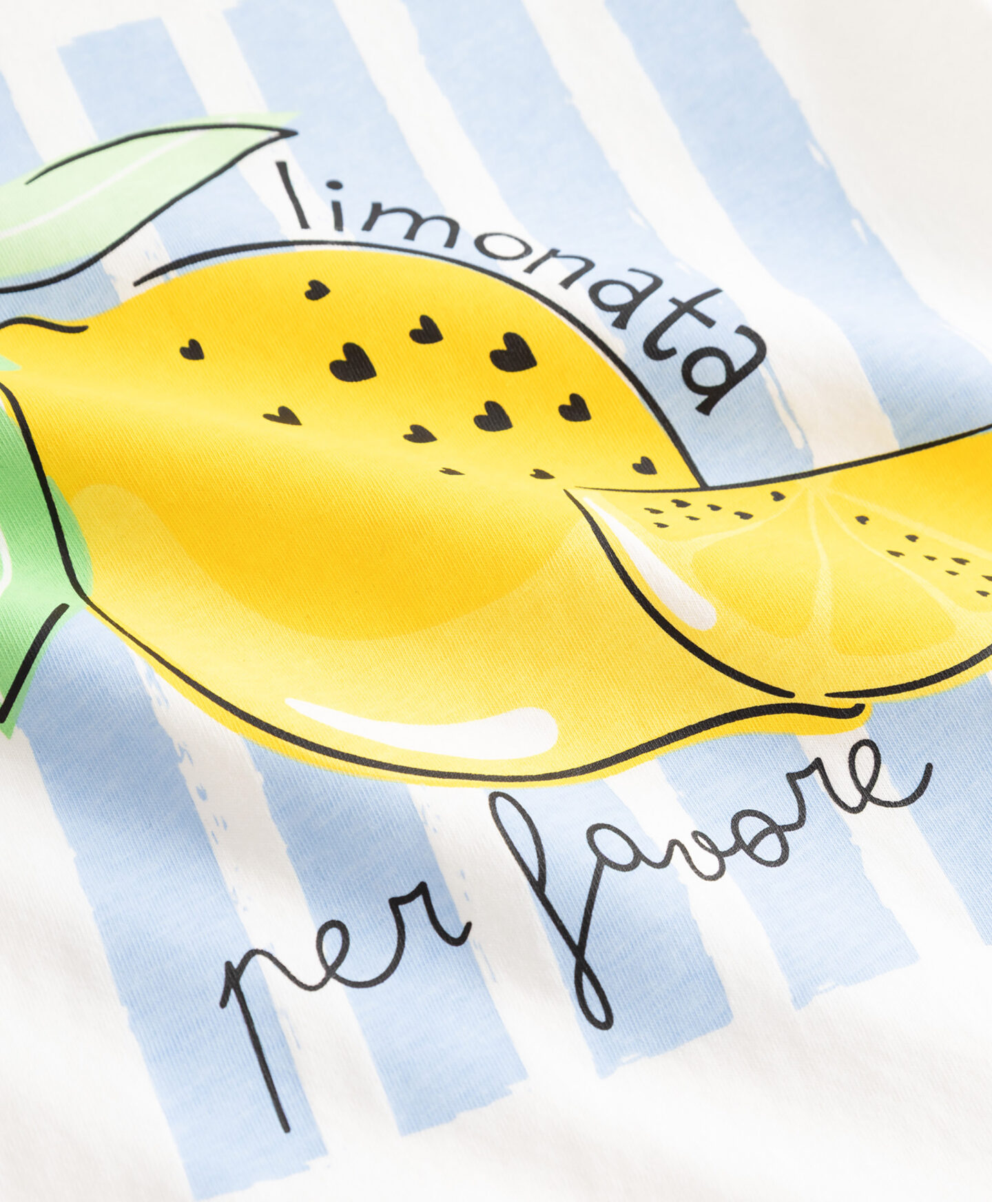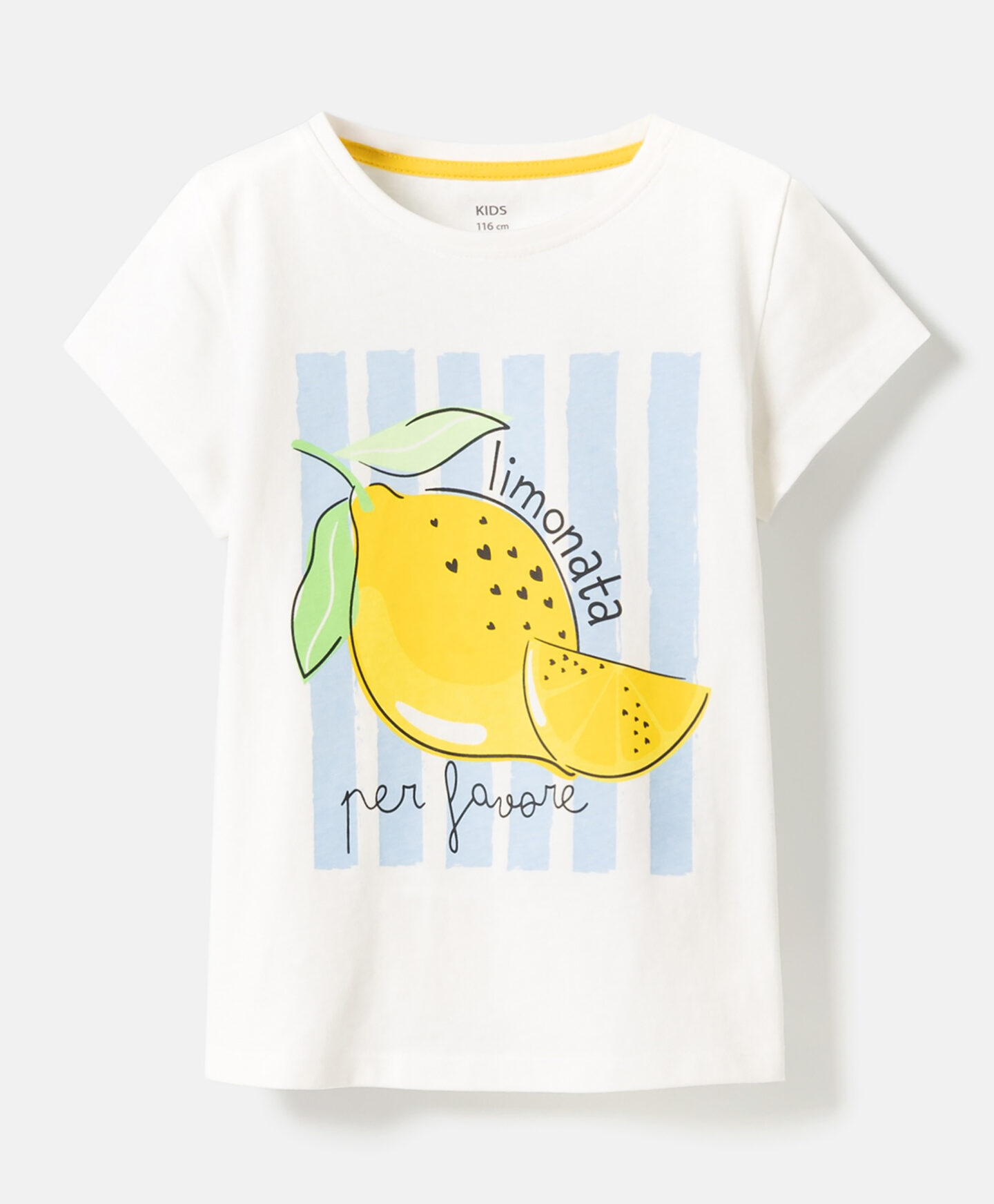 Bijela majica za djevojčice, napravljena od 100% pamuka, pravi je hit ove sezone. Mekani pamuk omogućava koži da diše i pruža udobnost. Motiv limuna privlači pažnju i daje poseban šarm svakom outfitu.