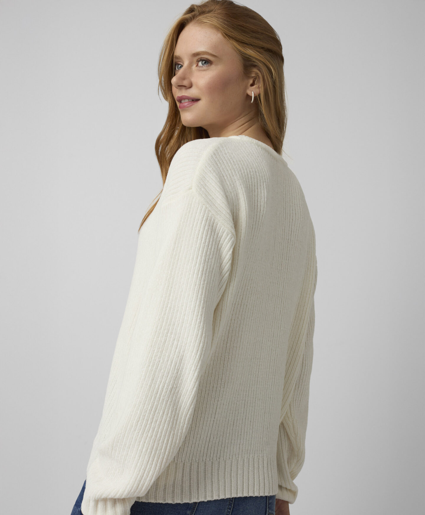 Bijeli džemper za žene, napravljen od mekanog chenille materijala, odlično se kombinuje i s ležernim i s elegantnijim kombinacijama. Mekan je na dodir i pruža maksimalnu udobnost. U ponudi su dostupne dvije boje.