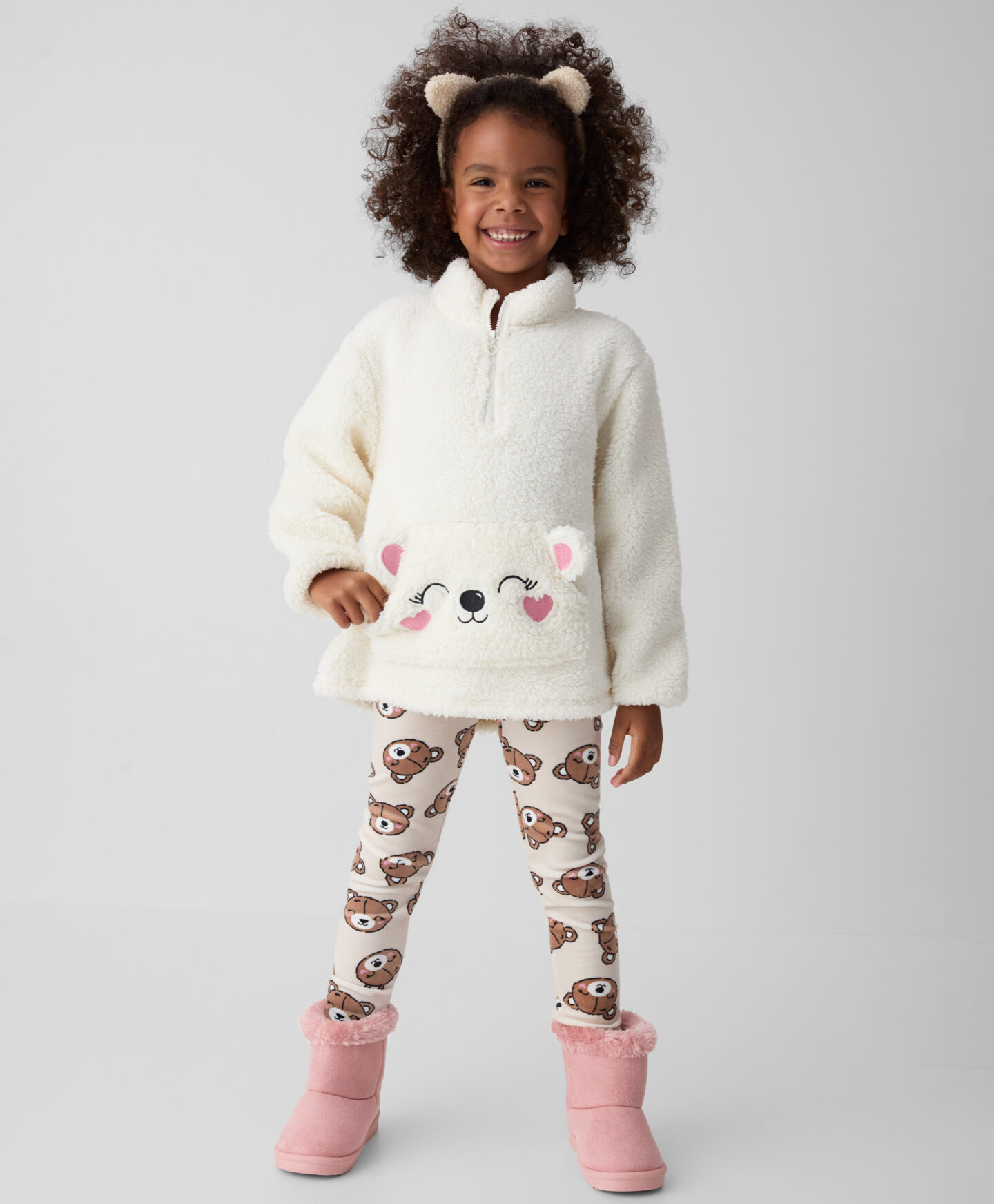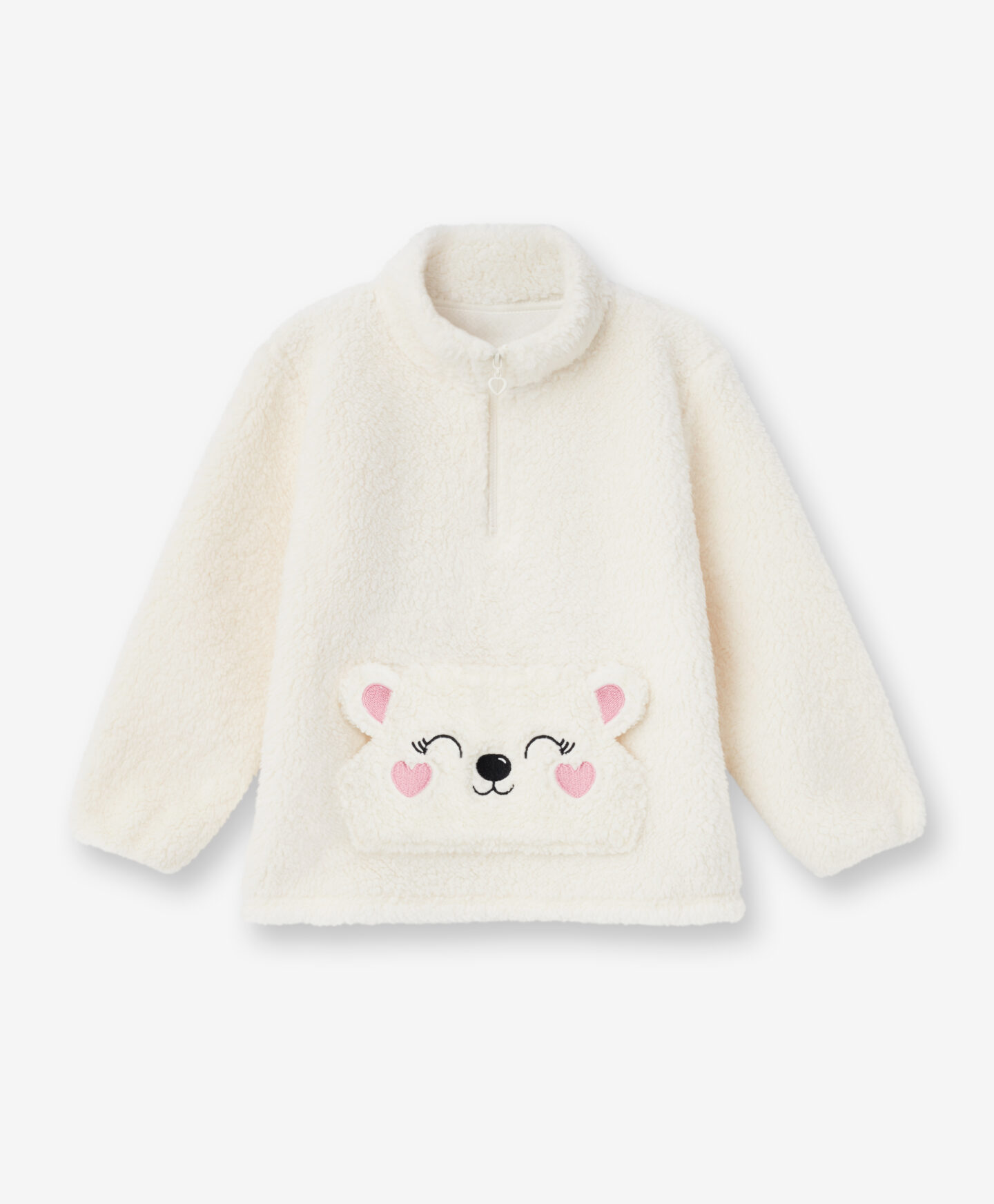 Bijeli sherpa gornji dio trenerke za djevojčice savršen je za male ljubiteljice udobnosti. Kopčanje na vratu olakšava oblačenje i presvlačenje, dok kengur džep s medvjedićem i 3D detaljima grije ruke. Širi kroj i mekani materijal pružaju udobnost i toplinu. Odličan izbor za zimske večeri kod kuće ili igre napolju.
