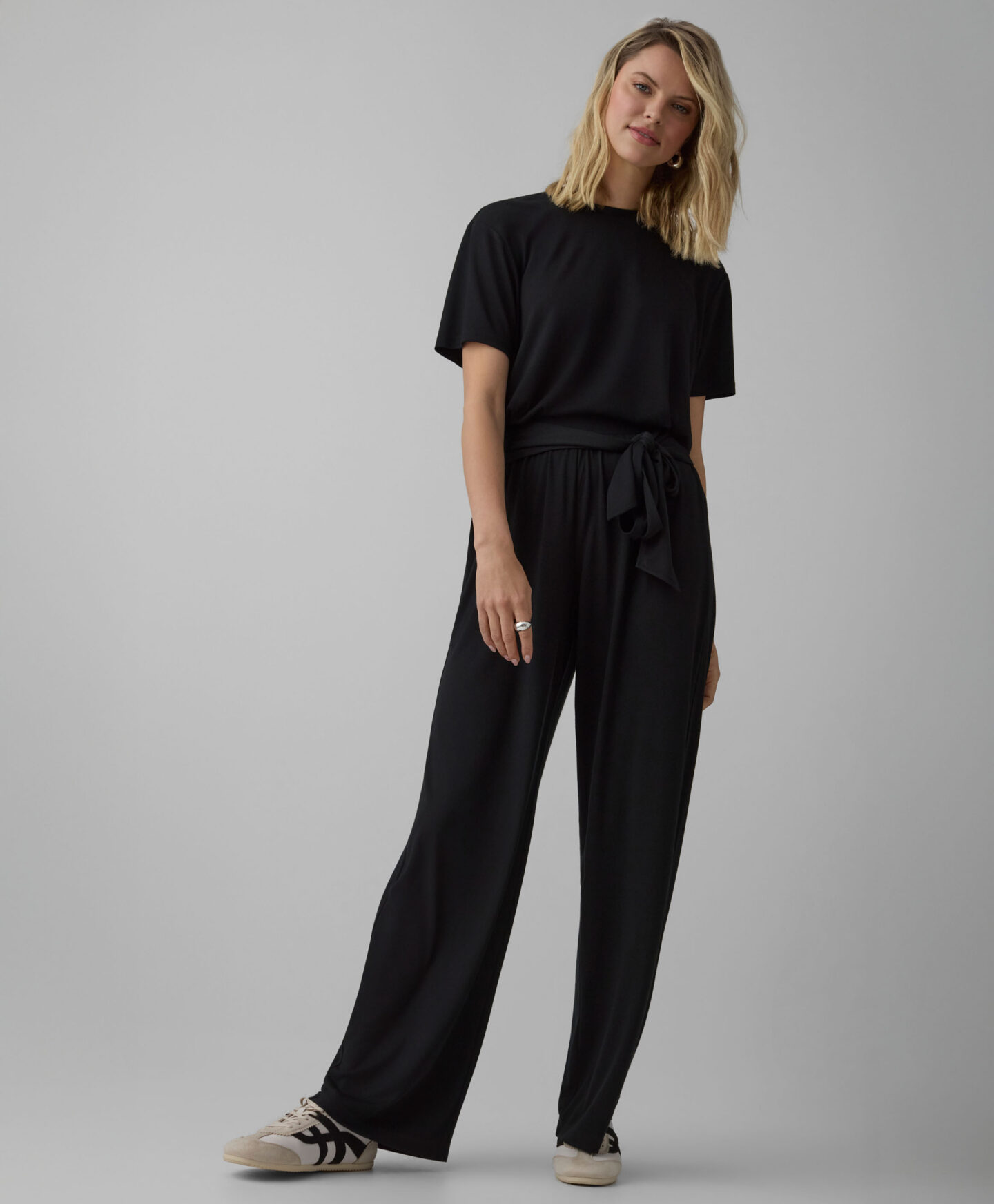 Crna majica kratkih rukava za žene čini komplet s hlačama s vezicom, ali se jednako dobro kombinuje s većinom odjeće u garderobi. Klasičan kroj i bezvremenska boja nikada ne izlaze iz mode. Lagani materijal s dodatkom viskoze prijatan je na dodir i osigurava udobnost tokom cijelog dana. U ponudi su dostupna dva dizajna.