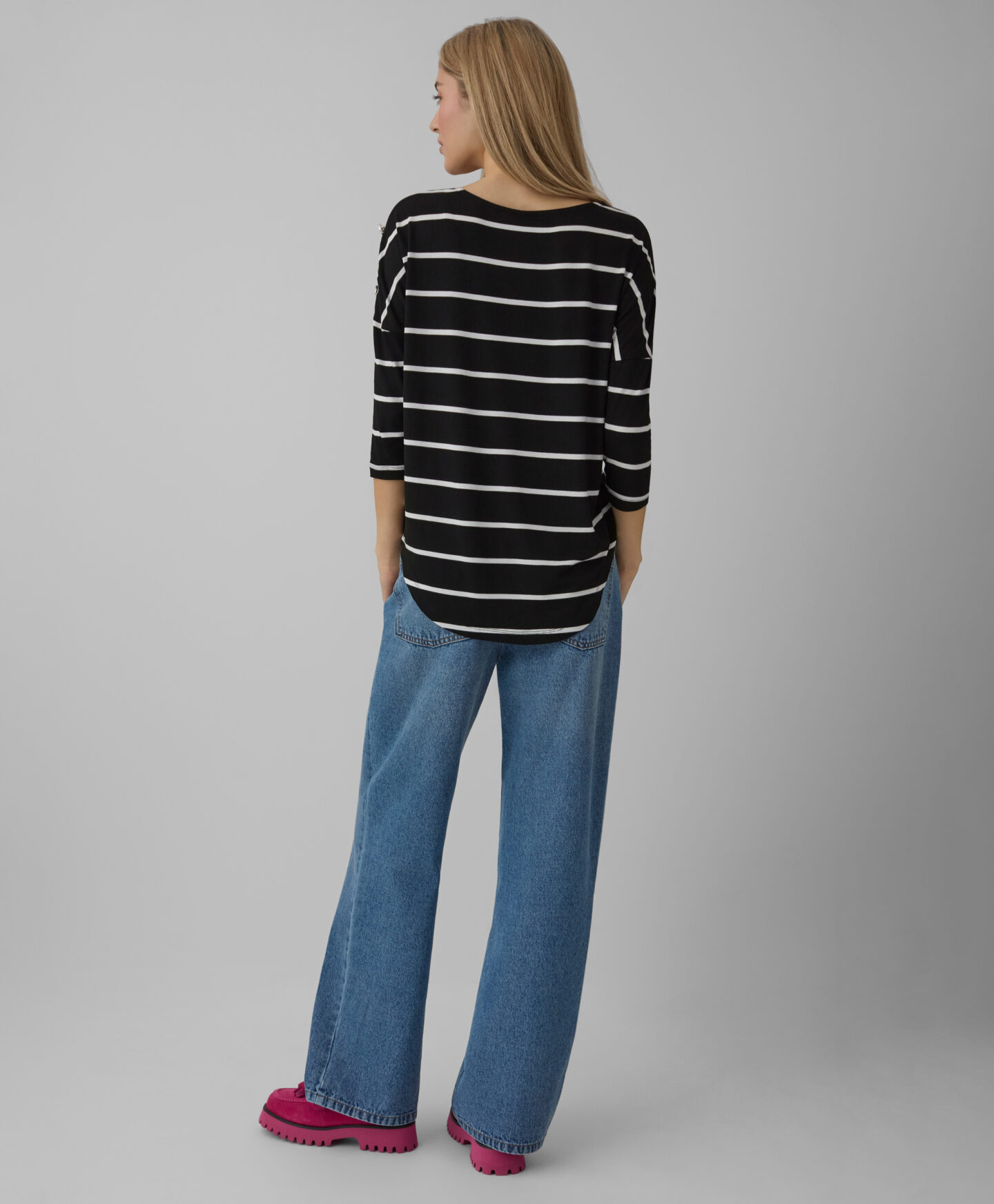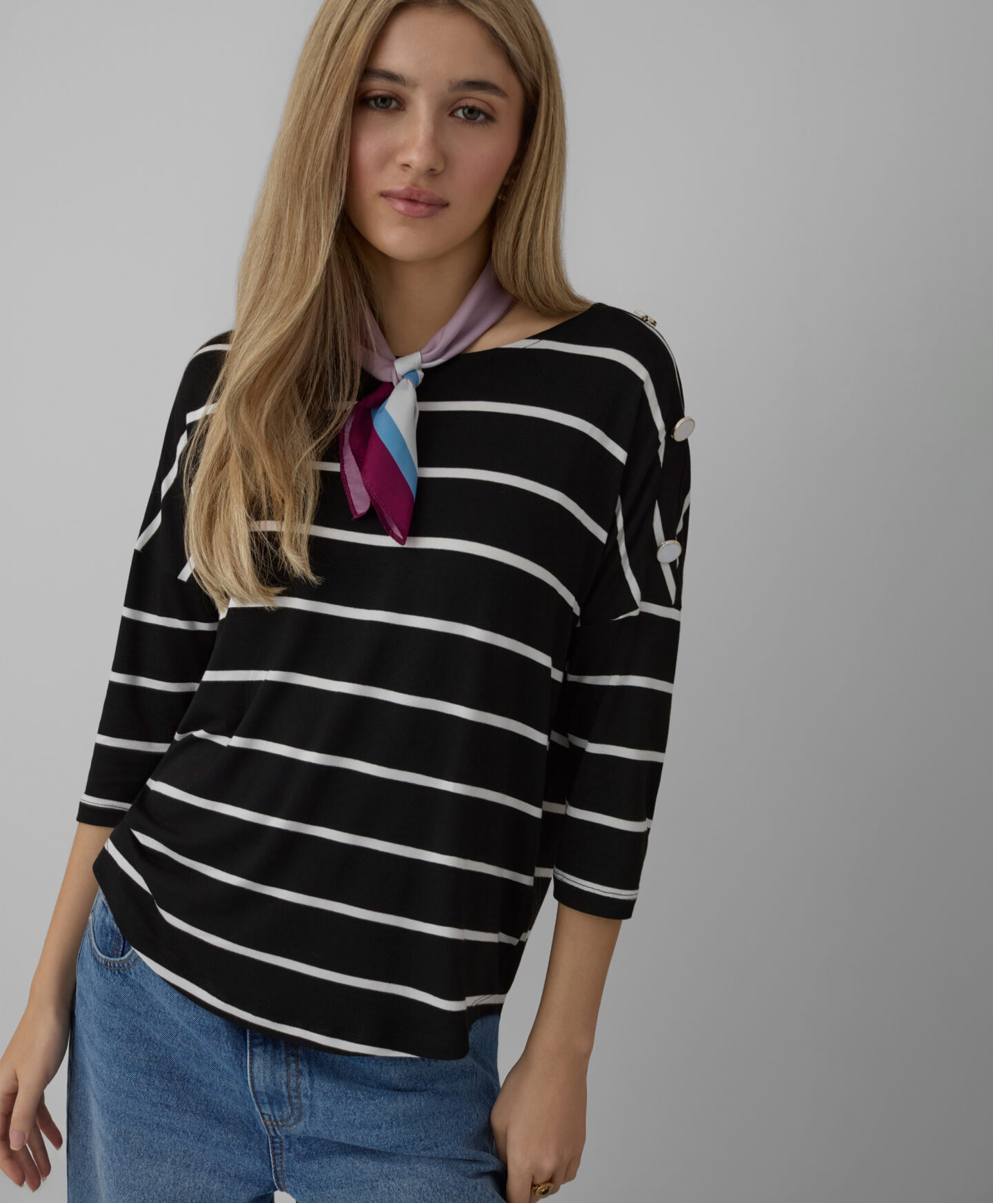 Crna prugasta majica za žene, s visokim udjelom viskoze, dizajnirana je za žene koje cijene stil i udobnost. Opušten kroj i univerzalna boja čine je odličnim dodatkom garderobi. Idealna je za svakodnevno nošenje, posao ili posebne prilike. U ponudi su dostupne dvije boje.