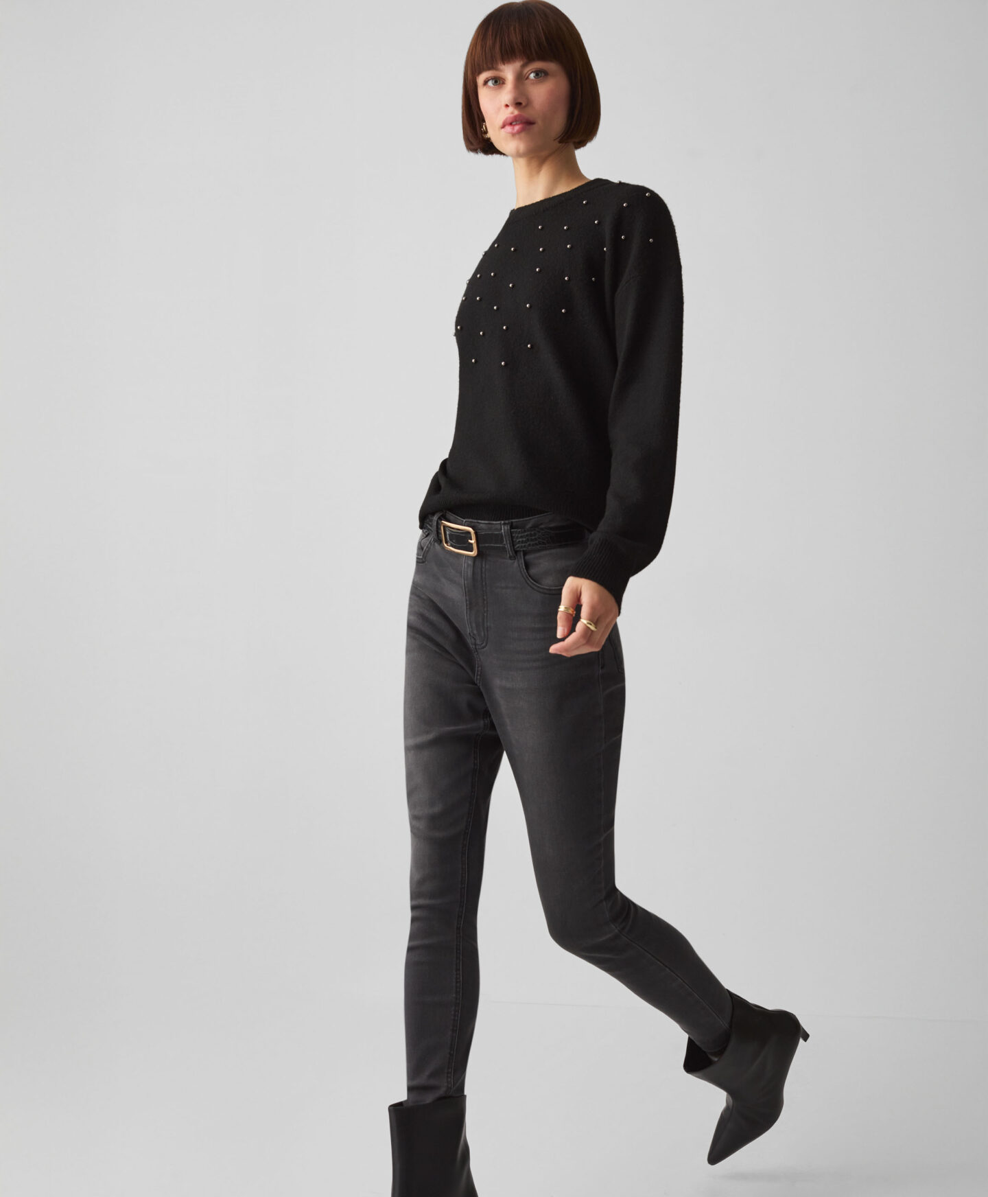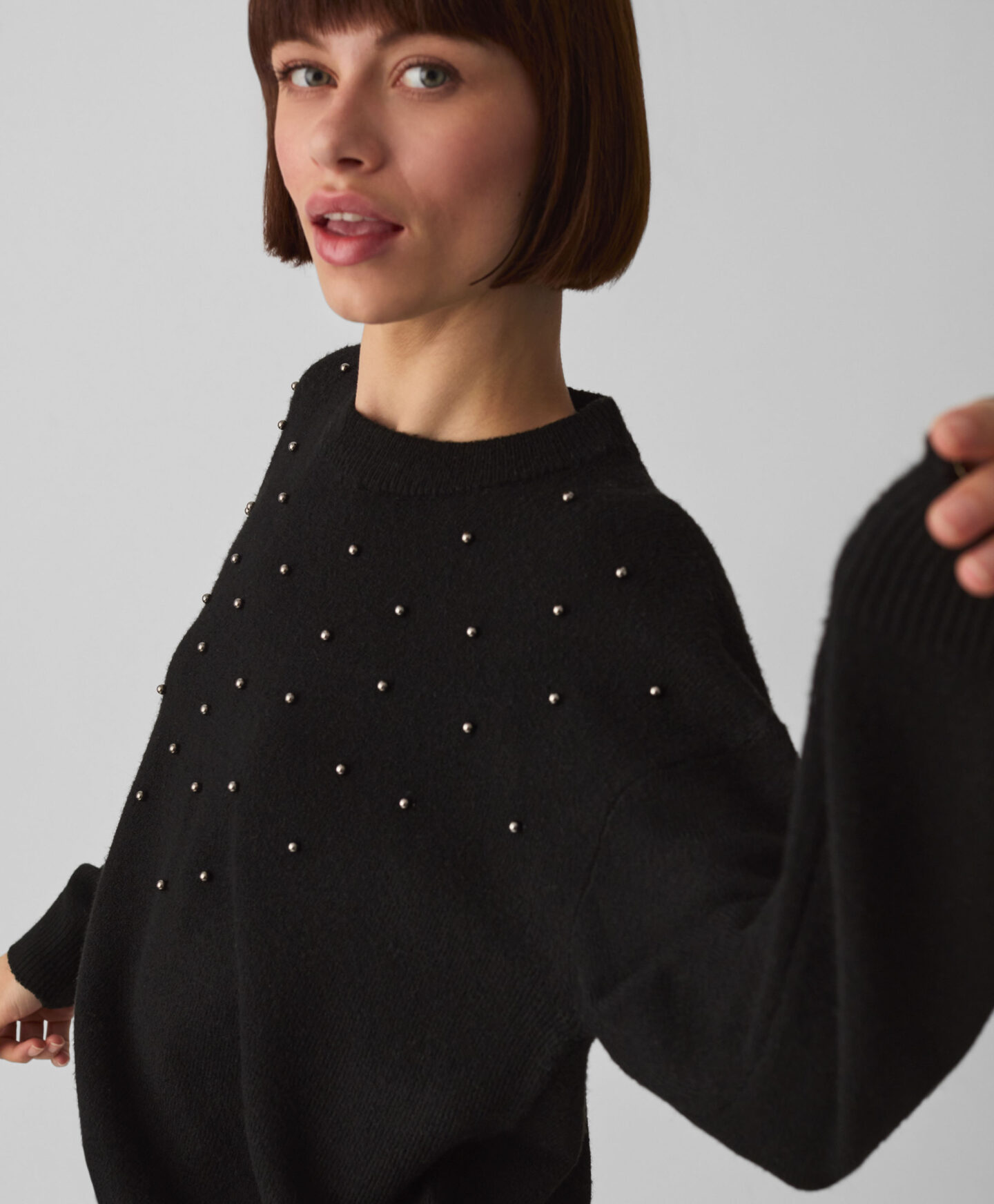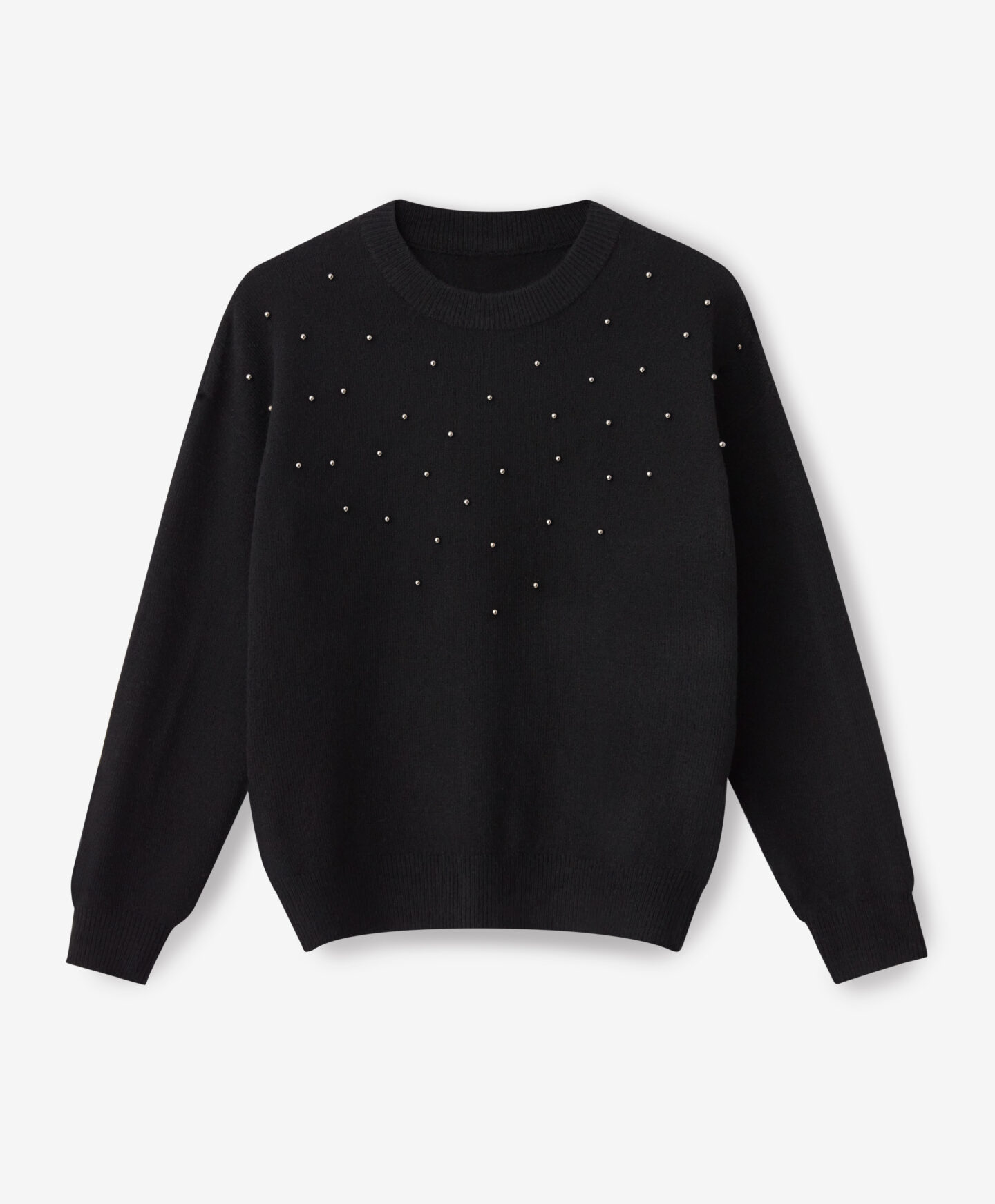 Crni džemper s biserima za žene elegantan je izbor za svaki dan. Topao je, mekan i ukrašen sitnim biserima sprijeda. Odlično se uklapa uz suknju, haljinu ili hlače, a savršen je i za poslovne i za svečanije kombinacije. U ponudi su dostupne dvije boje.