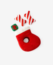 Crveni poklon set za kućne ljubimce nudi razne dodatke koji obogaćuju svakodnevne aktivnosti psa. Mekane kosti u uzorku slatkiša i mala igračka savršene su za žvakanje, dok čizmica u prazničnim bojama služi kao praktična torbica za igračke.