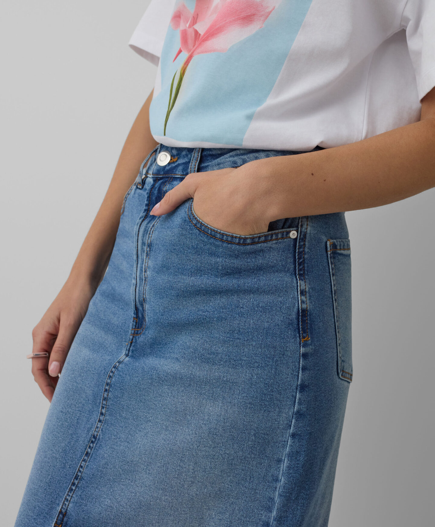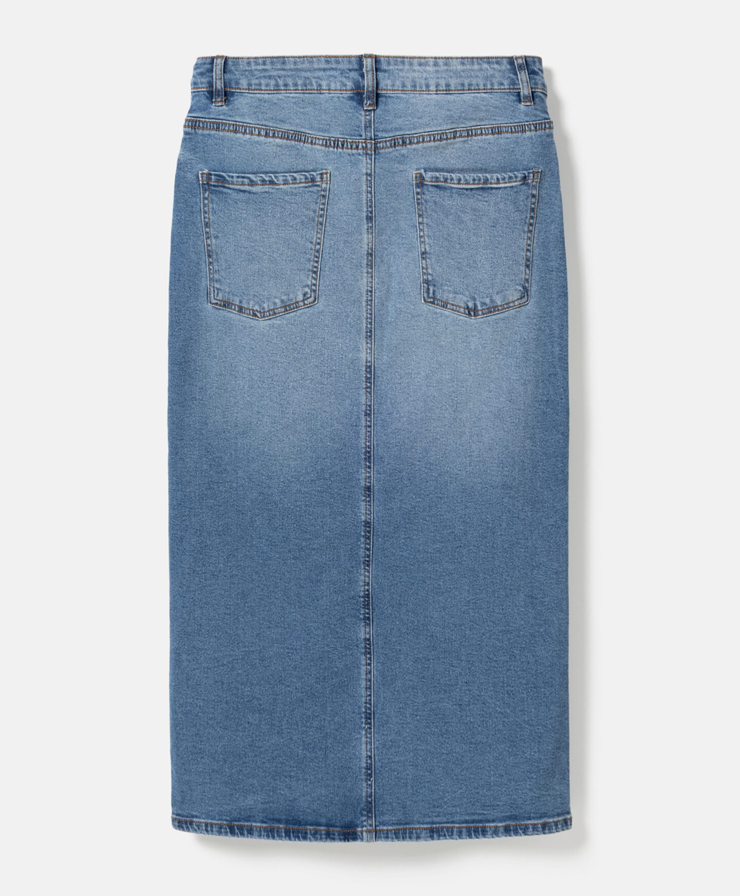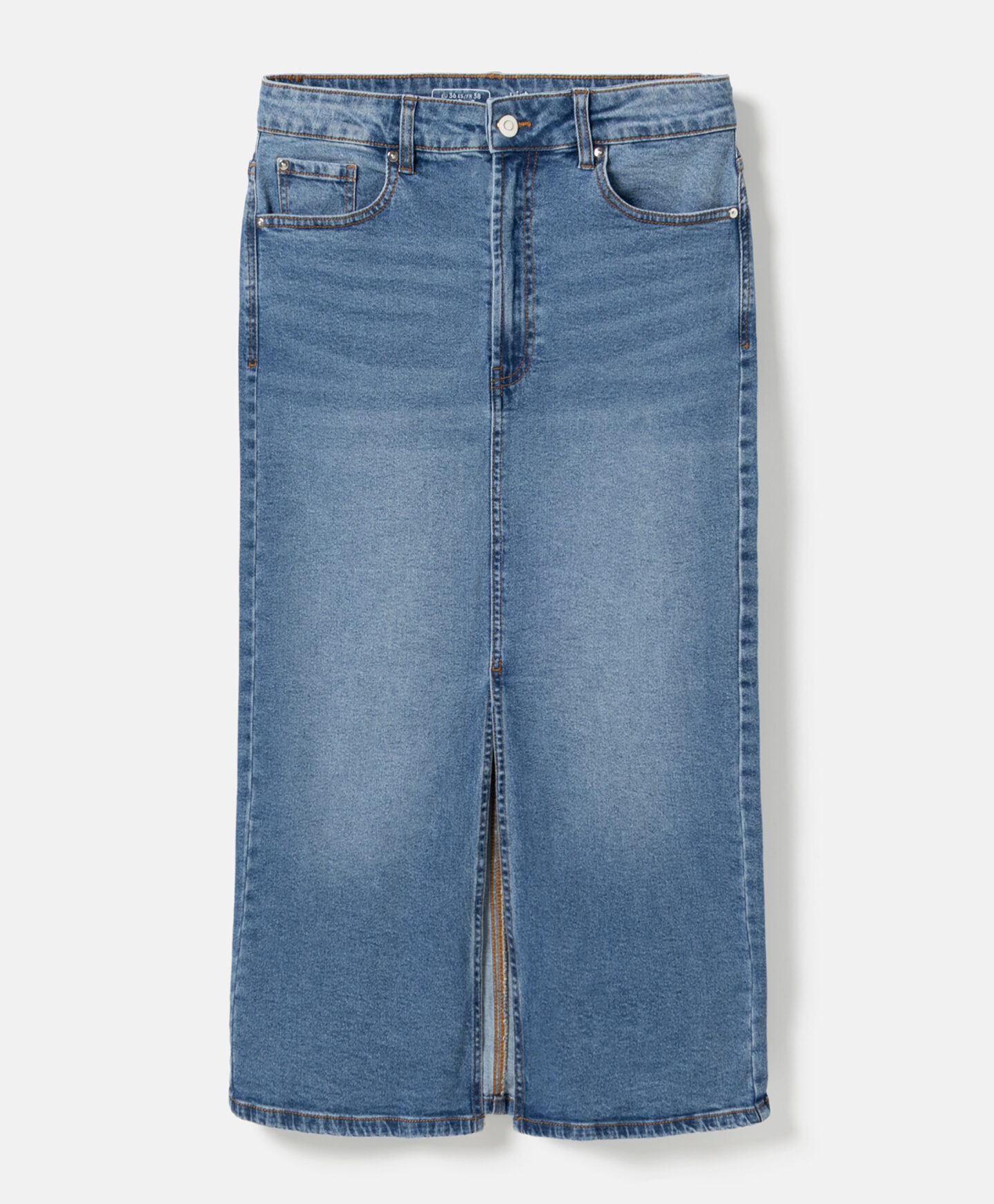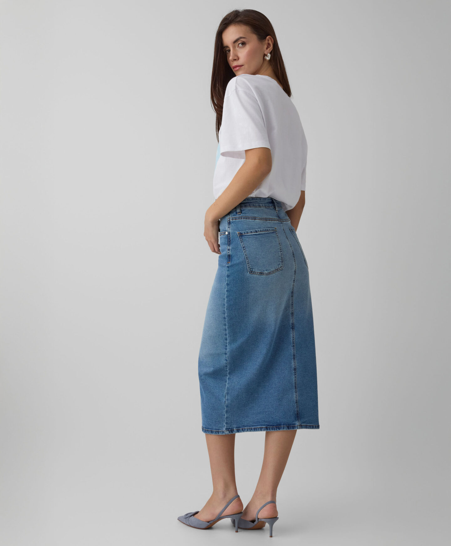 Denim suknja za žene, s prednjim prorezom, lijepo ističe figuru. Bezvremenski denim odlično se slaže s klasičnim majicama, ali i elegantnijim košuljama. Jednako dobro se kombinuje s ležernim patikama za opušteni izgled ili s potpeticama za elegantan stil. Midi dužina čini suknju pogodnom za razne prilike.