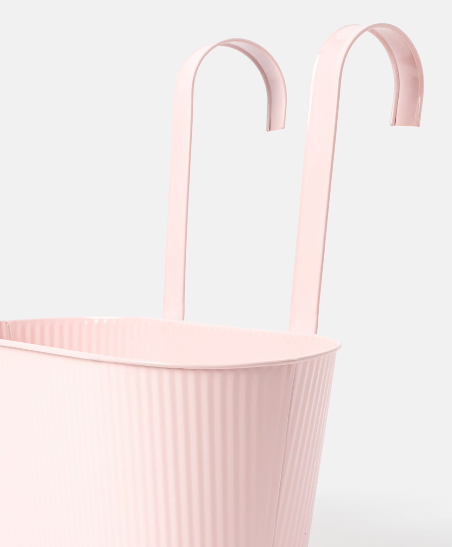 Duga roza viseća navlaka za saksiju s rebrastim zidovima privlači pažnju svojim proljetnim dizajnom. Praktične kuke omogućavaju postavljanje na balkonsku ogradu ili drvenu površinu, maksimalno iskorištavajući prostor. U ponudi su dostupni različiti uzorci.