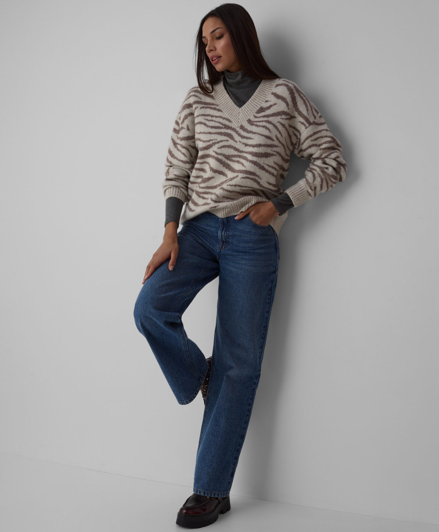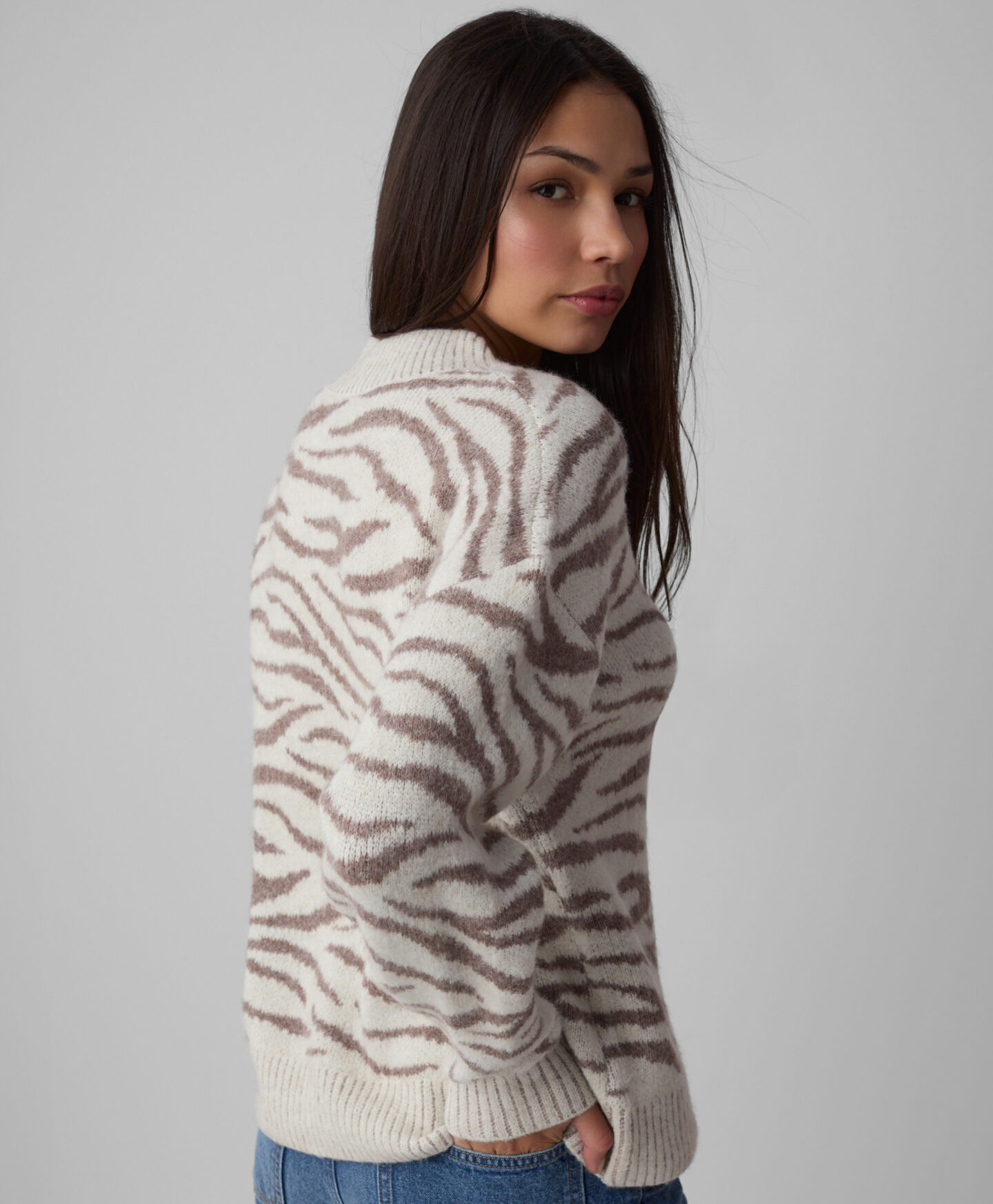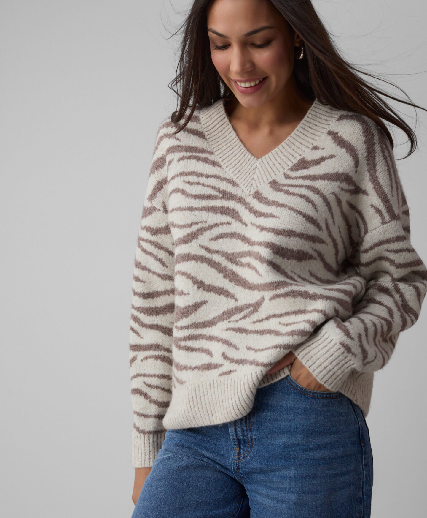 Džemper sa zebra uzorkom za žene idealan je izbor za svaku ženu koja želi da se istakne u masi. Mekan je, topao i savršen za hladnije zimske dane. Odlično izgleda samostalno ili preko ležernih majica i klasičnih košulja.