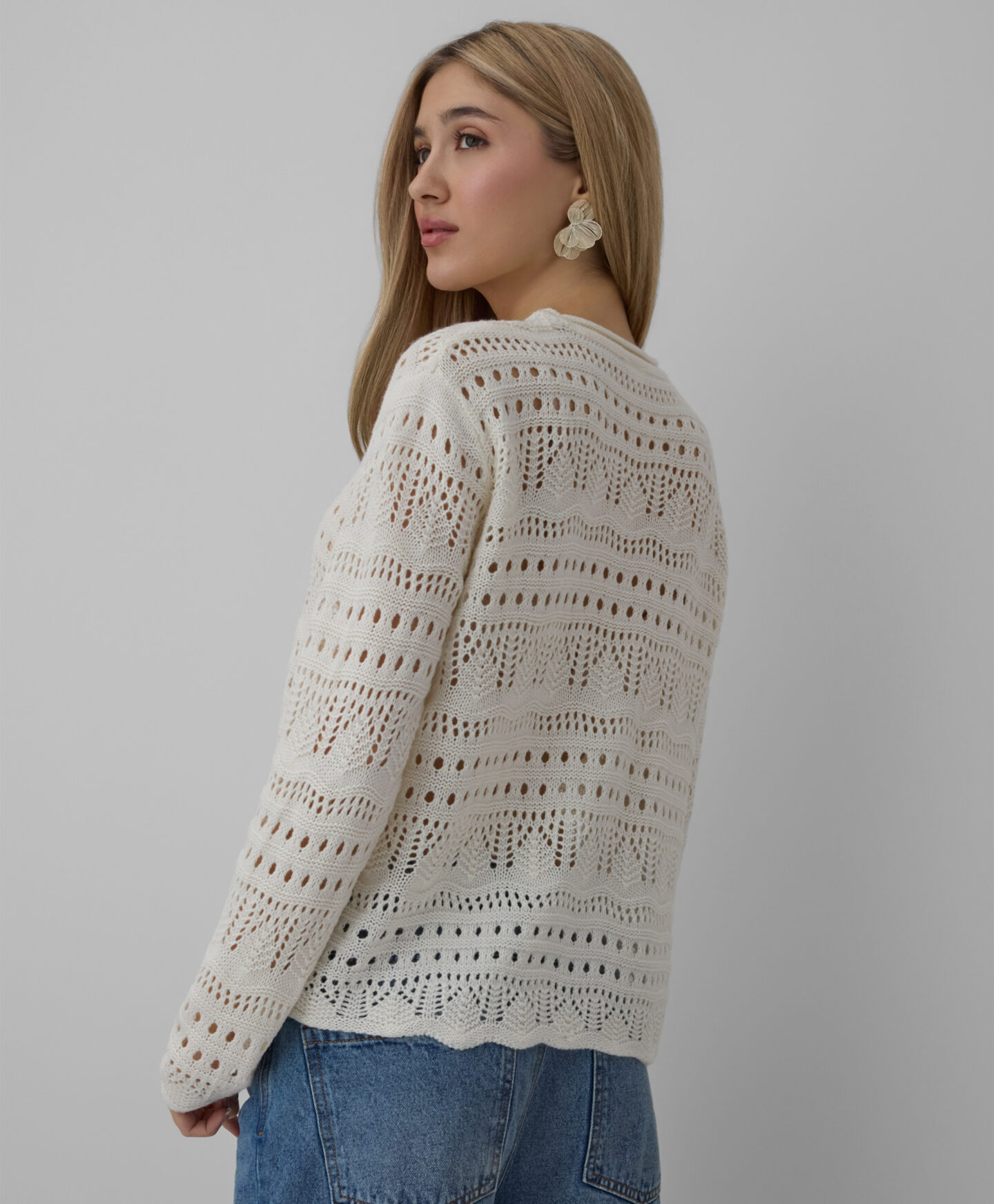 Džemper s čipkom za žene privući će pažnju svake romantične duše. Ležerni kroj i prozračan materijal daju mu poseban šarm, dok čipkasti uzorak unosi lakoću u svaku kombinaciju. Može se nositi uz jeans i elegantne hlače.