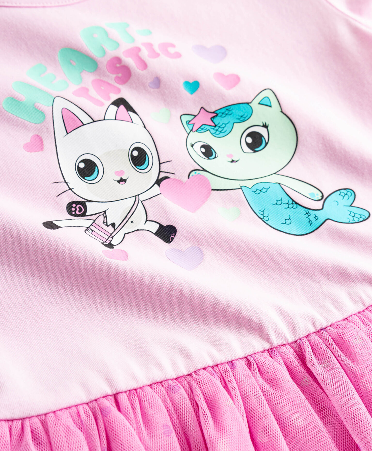 Gabby’s Dollhouse haljina za djevojčice ima donji dio od tila koji joj daje lagan i bajkovit izgled. Print s omiljenim crtanim likovima na prednjoj strani privlači pažnju i čini haljinu posebnim komadom. Ovo je gotova kombinacija za vrtić ili porodične proslave.