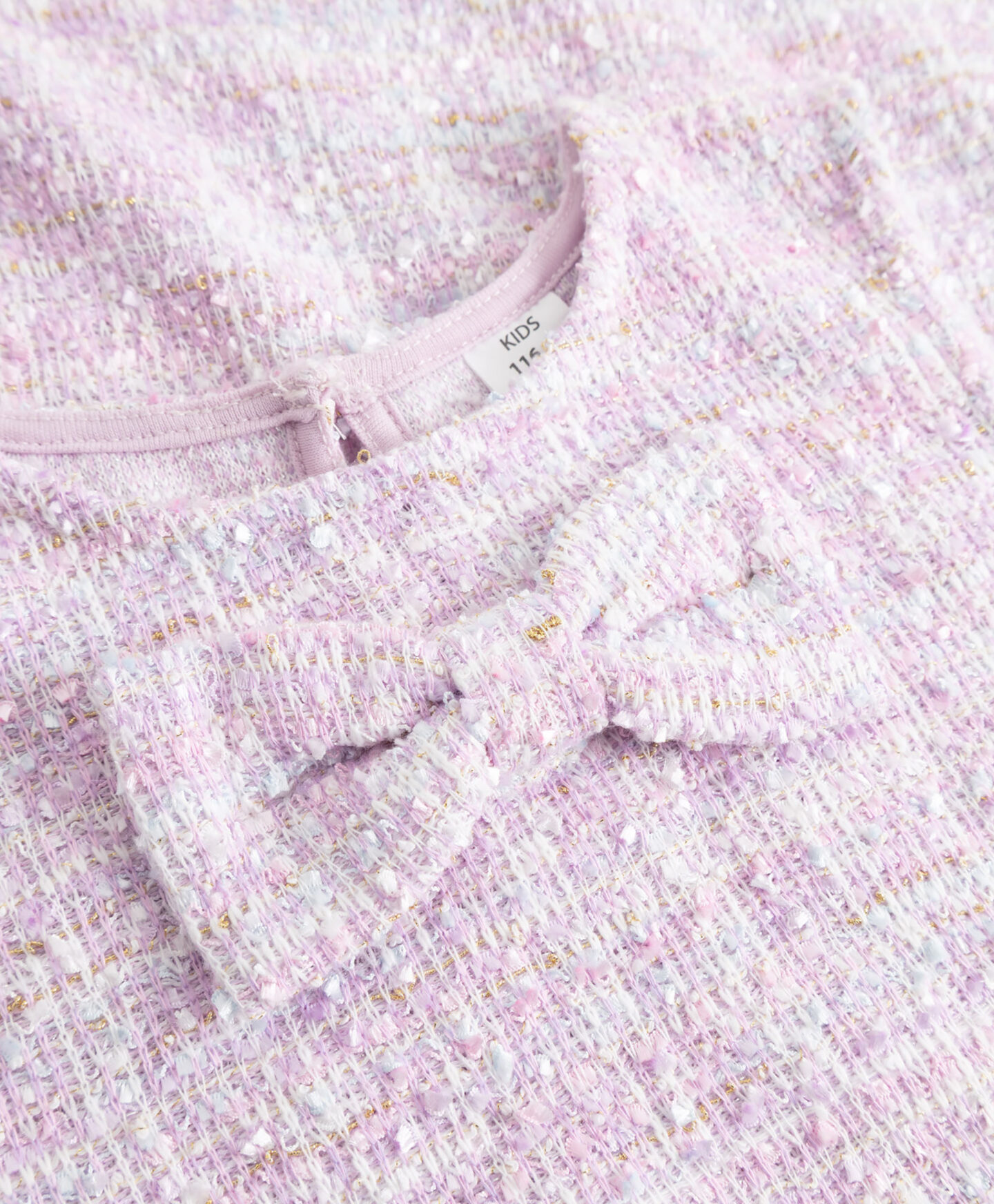 Haljina za djevojčice, s mašnom na izrezu, pravi je primjer bezvremenske elegancije. Jednostavan, blago „kockasti“ kroj omogućava udobno kretanje. Model bez rukava daje mnogo mogućnosti kombinovanja – ispod se može nositi elegantna bluza dugih rukava ili jednostavna majica. Prepoznatljiva, deblja bouclé struktura s diskretnim sjajnim zlatnim koncem daje trodimenzionalni efekat. Savršena je za posebne prilike.