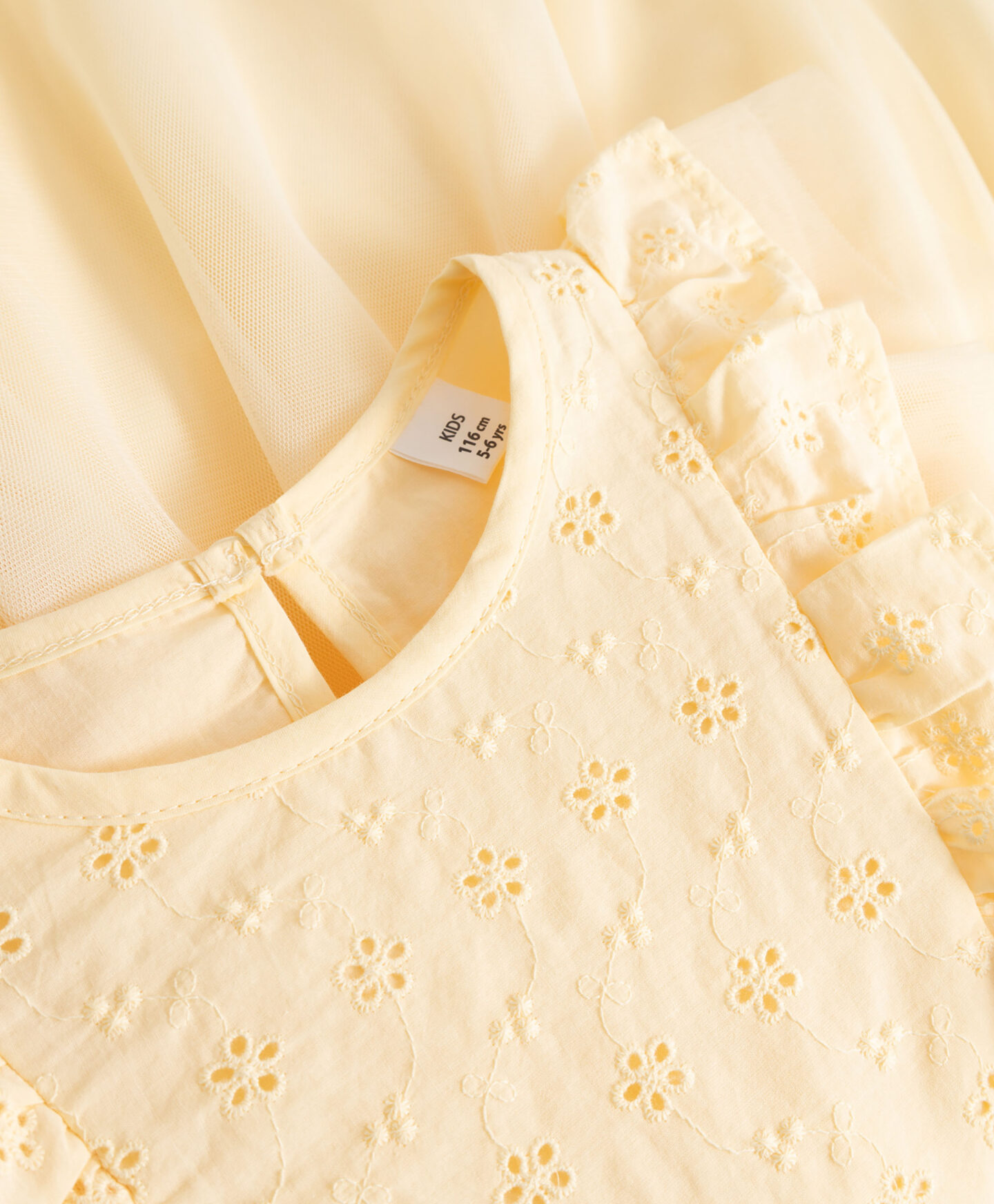 Pastelno žuta haljina za djevojčice učinit će da svaka djevojčica izgleda kao zraka sunca. Predivan gornji dio s perforiranim cvjetnim detaljima daje dozu elegantnog stila. Rukavi od tila u obliku leptira čine haljinu laganom i prozračnom. Til suknja je oličenje nježnosti i lakoće. Savršen izbor za sunčan i topao dan.