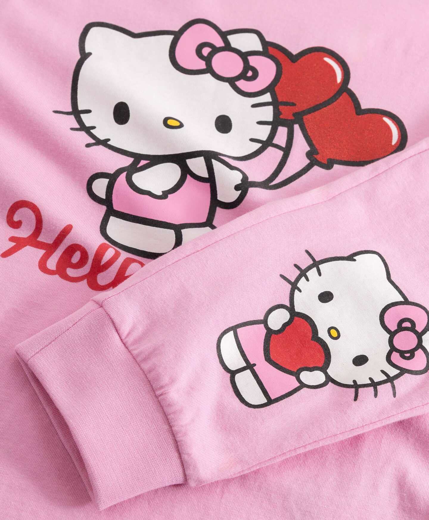 Hello Kitty pidžama za djevojčice, napravljena od 100% pamuka, sastoji se od majice dugih rukava i hlača u nježnoj rozoj boji. Mekan i prozračan materijal osigurava udoban san, dok klasični kroj omogućava slobodu kretanja. Savršena je za hladnije noći, kod kuće ili na putovanju.