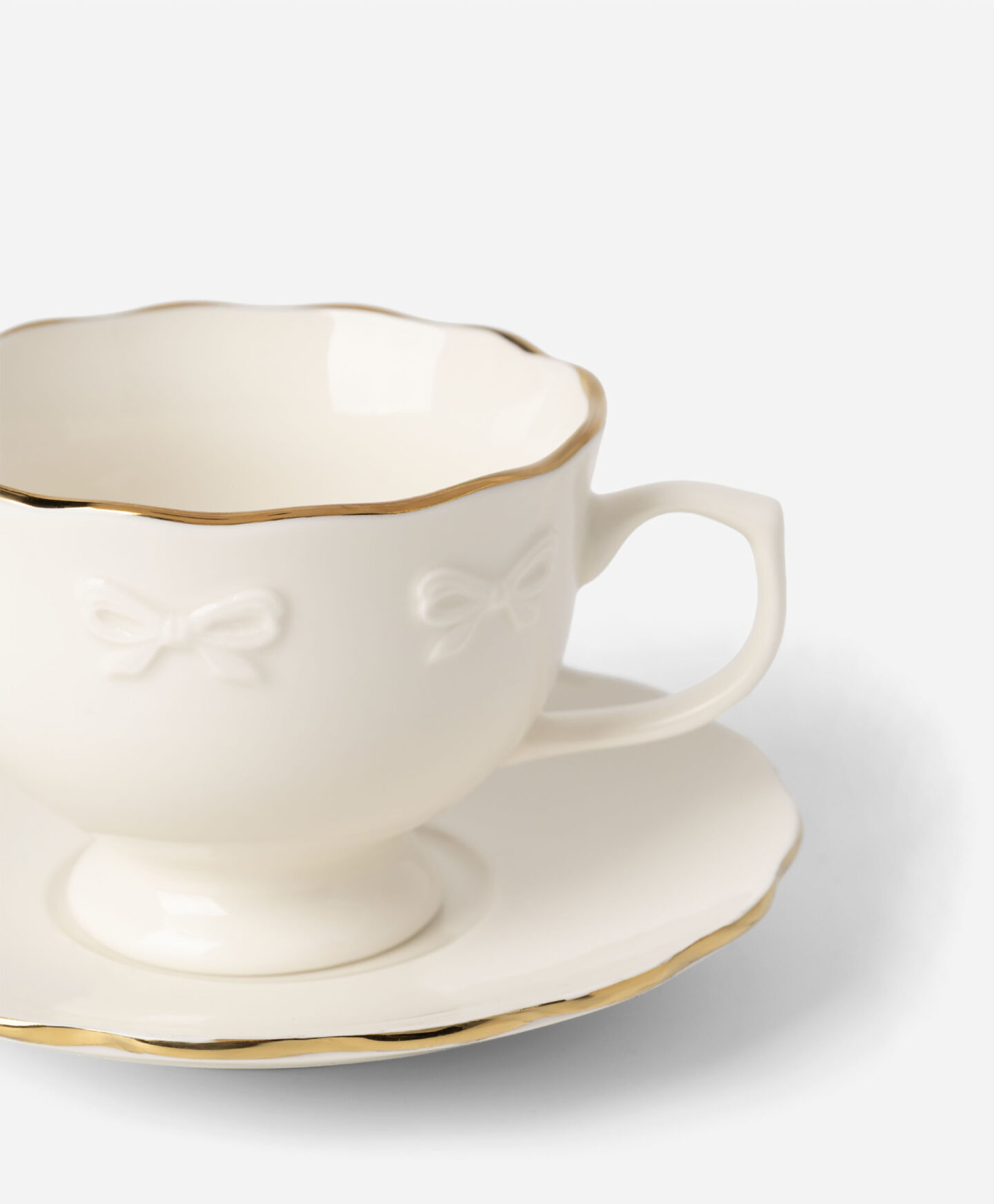Keramička šolja s tanjirićem elegantan je set savršen za posluživanje omiljenih napitaka poput kafe ili čaja. Zlatni rub i motiv mašne čine šolju posebno lijepom. Idealna je i kao poklon za sve ljubitelje toplih napitaka.