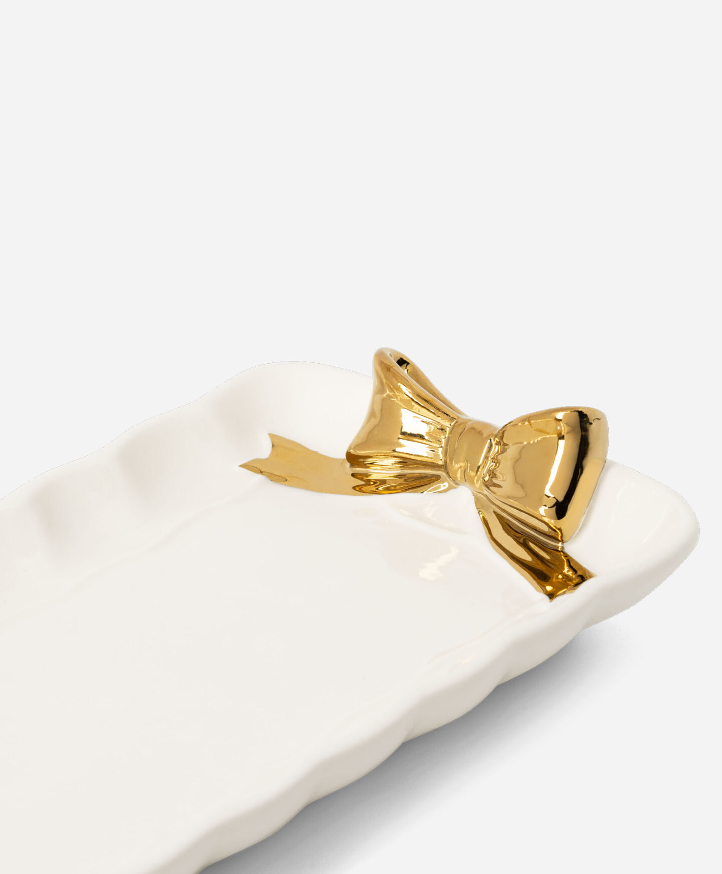 Keramički tanjir za serviranje kolača s ukrasnim zlatnim mašnama oličenje je elegancije i dobrog stila. Napravljen od izdržljive kamenine, nije samo lak za čišćenje, već i izuzetno lijep na stolu. Sjajna završna obrada reflektuje svjetlost, čineći tanjir centralnim dijelom aranžmana. Idealan je za posluživanje kolača, voća ili grickalica.
