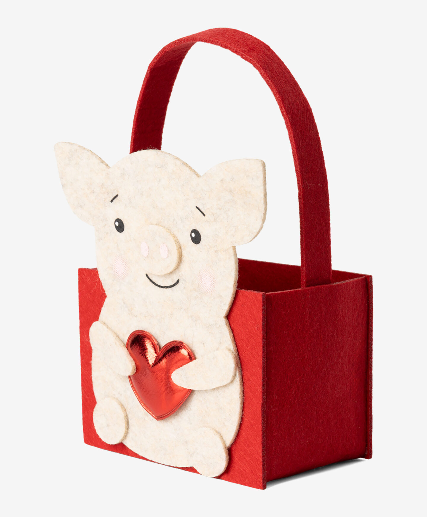 Korpa od filca s uzorkom svinje savršen je način da izmamite osmijeh i naglasite posebnost poklona. Predstavlja šarmantno pakovanje za poklon za Dan zaljubljenih, poput čokolada, mirisne svijeće, nakita ili druge romantične sitnice. U ponudi su dostupna tri dizajna.