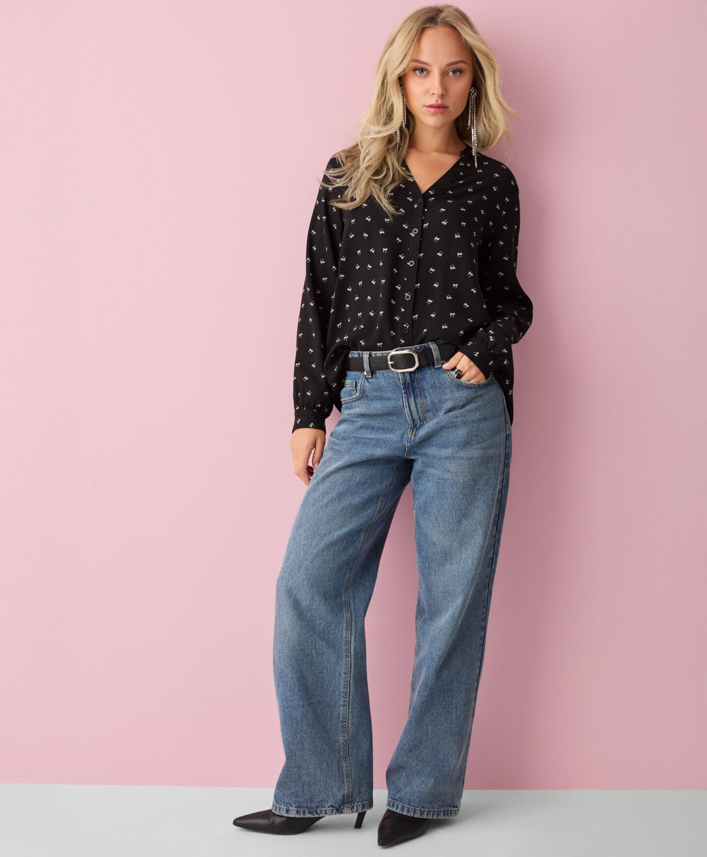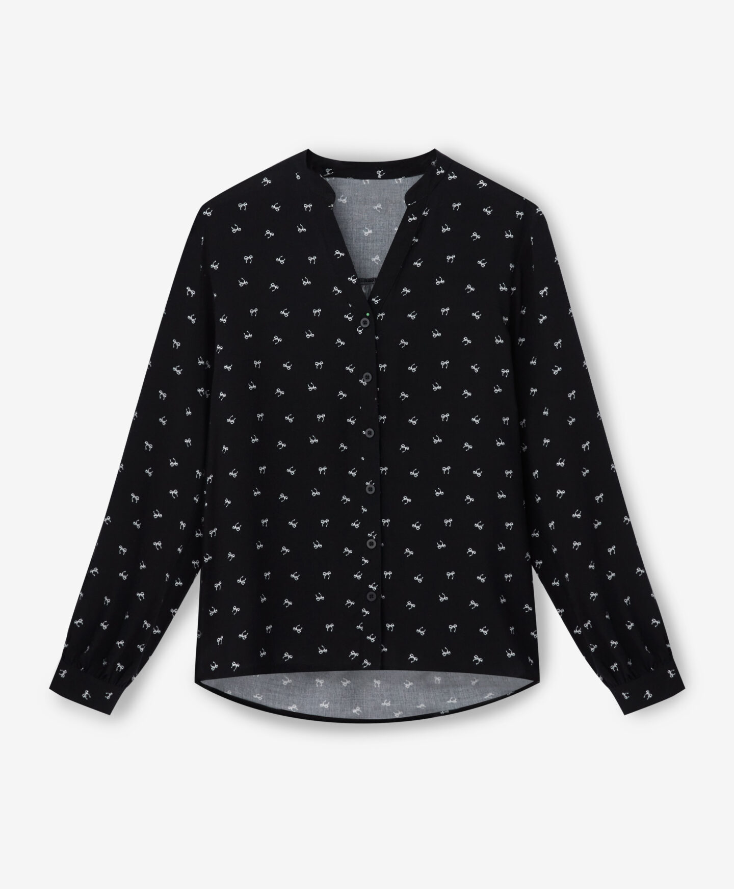 Košulja dugih rukava za žene, napravljena od 100% viskoze, ukrašena je suptilnim uzorkom mašne. Lagana, prozračna i romantična, pogodna je ne samo za svakodnevno nošenje već i za posebne prilike. Zahvaljujući prozračnom materijalu, savršeno se uklapa ispod sakoa, džempera ili kardigana.