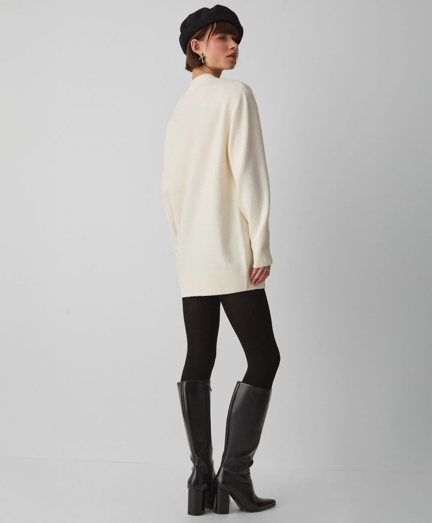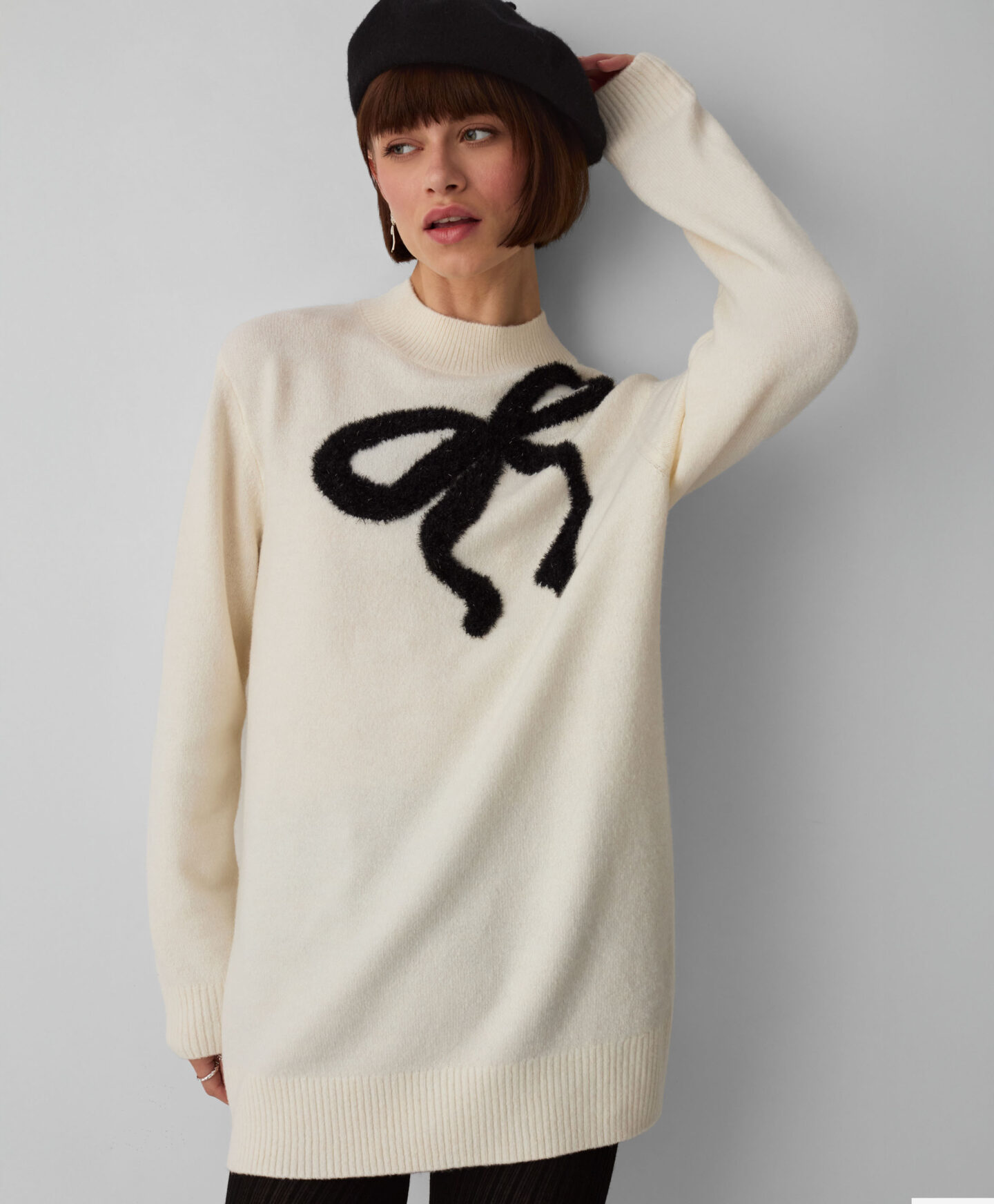 Krem tunika s mašnom i lureksom za žene savršeno će upotpuniti vašu jesenju garderobu. Duga, topla i elegantna, izgledat će odlično uz helanke ili deblje čarape. U kombinaciji s visokim čizmama ili gležnjericama stvara moderan izgled idealan za šetnju, posao ili druženje s prijateljima.