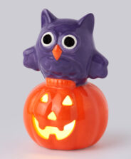Sova koja sjedi na LED bundevi šarmantan je ukras, savršen za Halloween. Bundeva isijava nježno svjetlo koje stvara ugodnu i magičnu atmosferu. Idealna je za ukras interijera, prozorskih daski ili kamina.