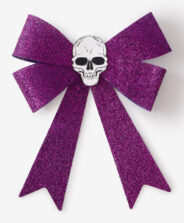 Ljubičasta mašna s lobanjom originalan je dodatak za Halloween. Spaja mračnu atmosferu s elegancijom. Napravljena od sjajnog materijala, prelijepo će se presijavati na svjetlosti svijeća. Odlično će poslužiti kao ukras na vratima, zavjesama ili kao ukras na stolu. U ponudi su dostupne i druge boje.