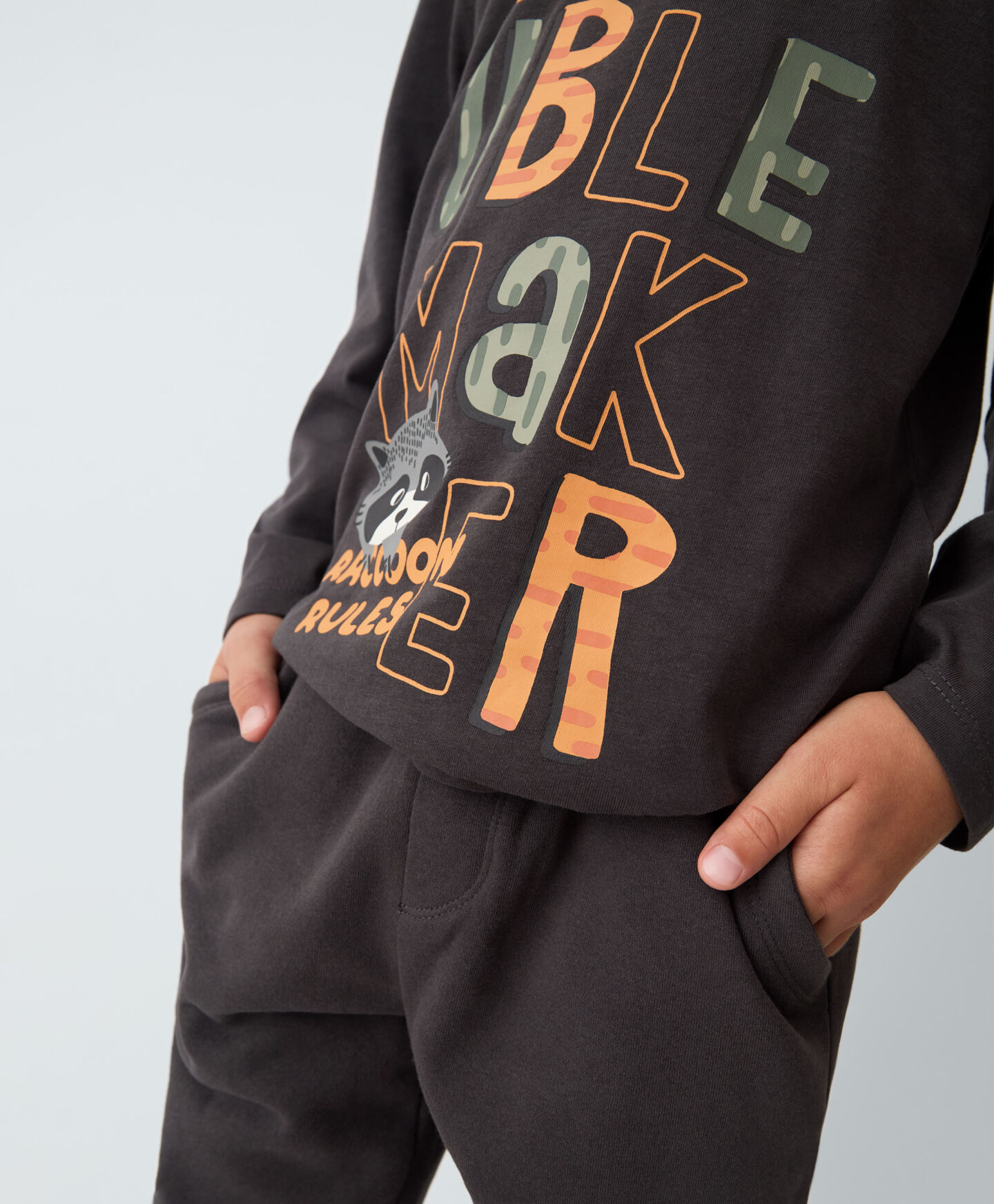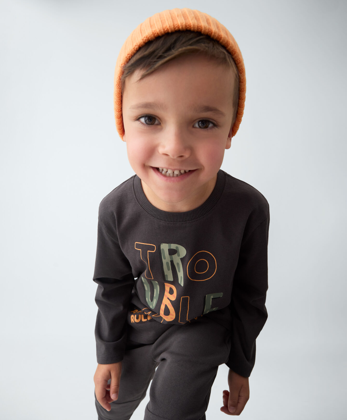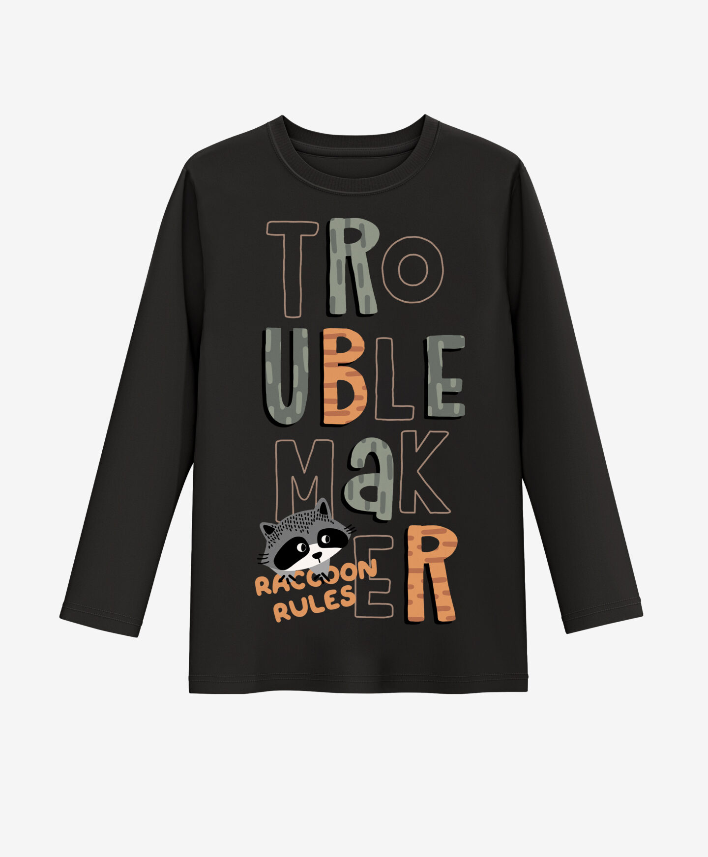Majica dugih rukava za dječake, napravljena od 100% pamuka, savršena je za hladnije dane. Tamne boje se odlično uklapaju u jesenju atmosferu, a grafika na prednjoj strani dodaje poseban karakter. Majica se lako kombinuje i s jeansom i s trenerkom. Mekan, koži prijatan materijal osigurat će udobnost vašem djetetu.