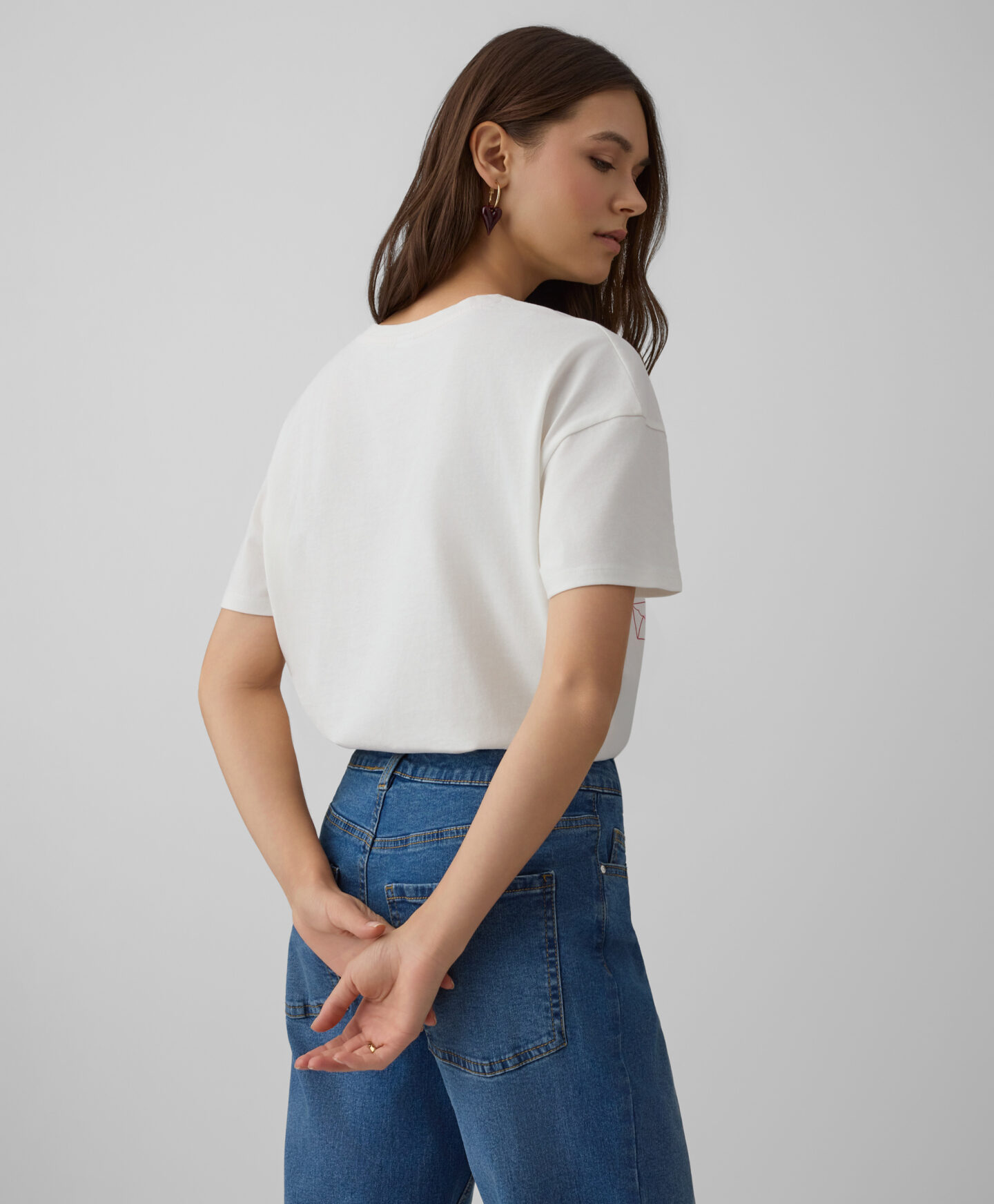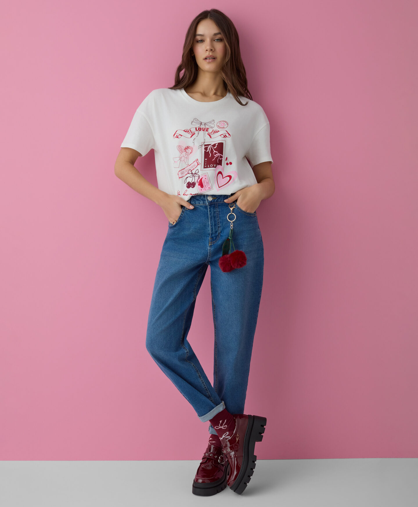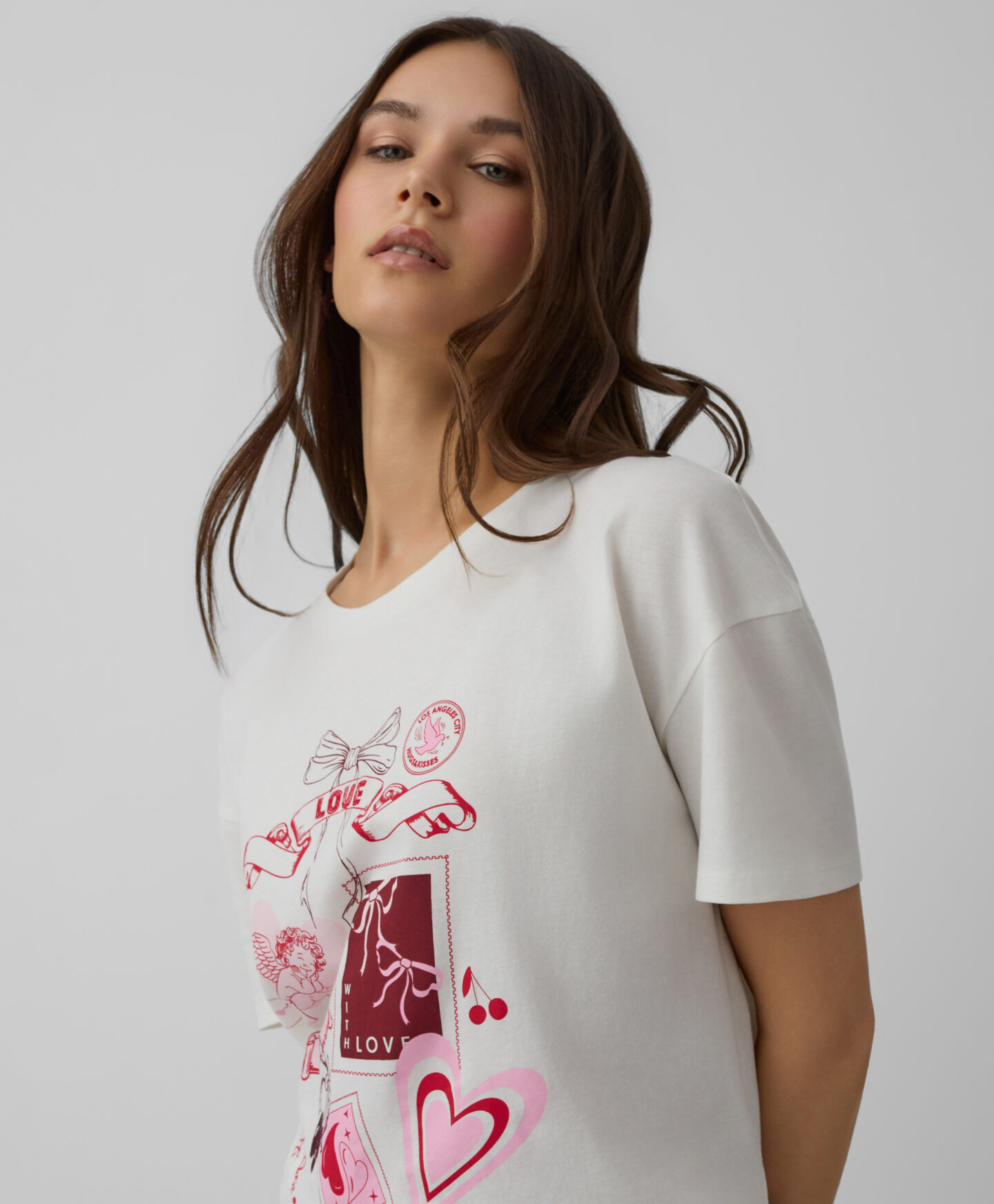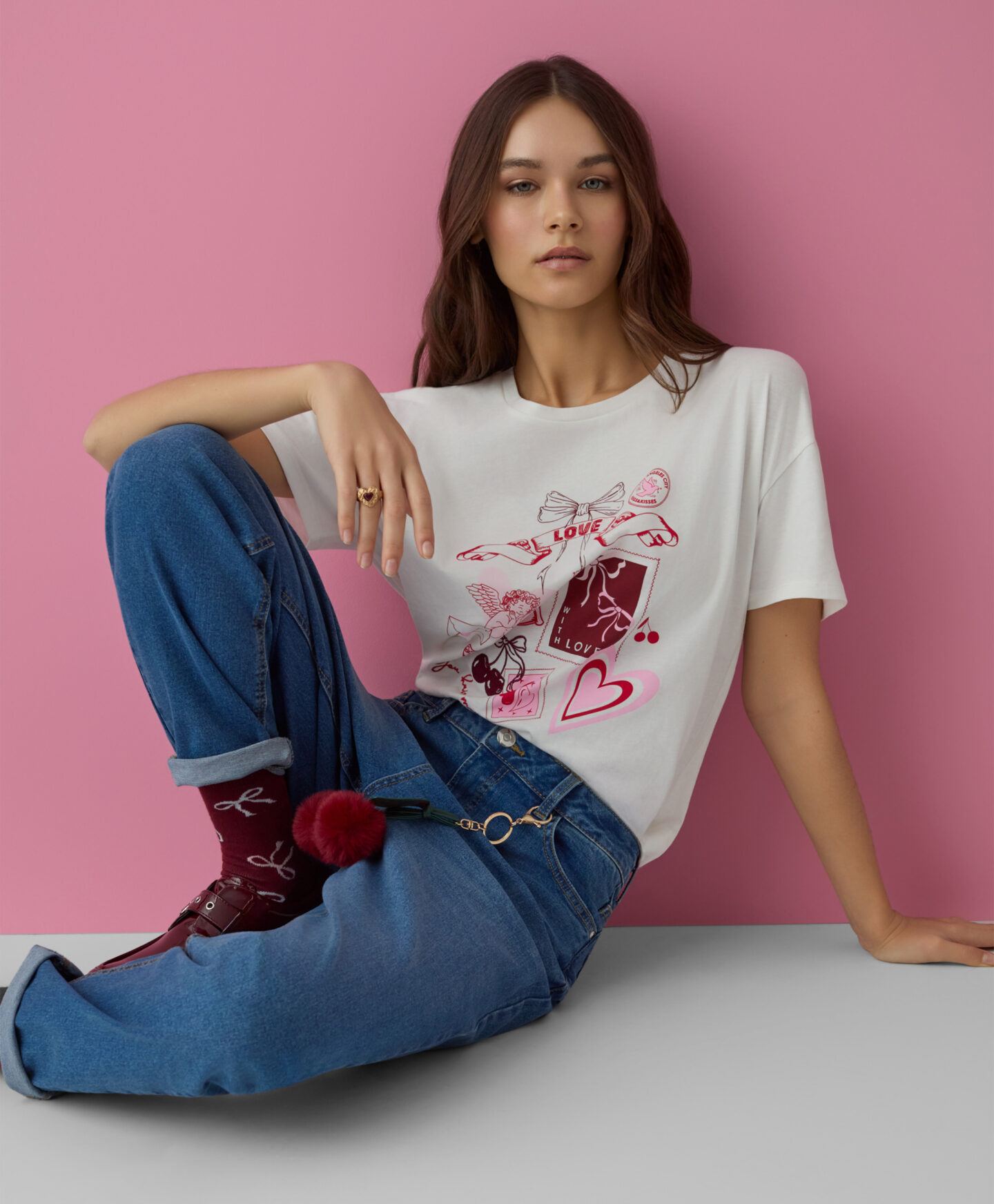 Majica kratkih rukava s printom za Dan zaljubljenih za žene, napravljena od 100% pamuka, odličan je izbor za svakodnevno nošenje. Majica je vrlo svestrana. Mekan i prozračan materijal osigurava udobnost, a simpatičan dizajn na prednjem dijelu dodaje romantičan dodir svakom outfitu.