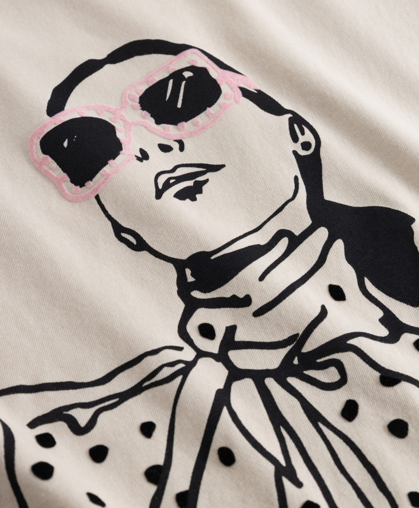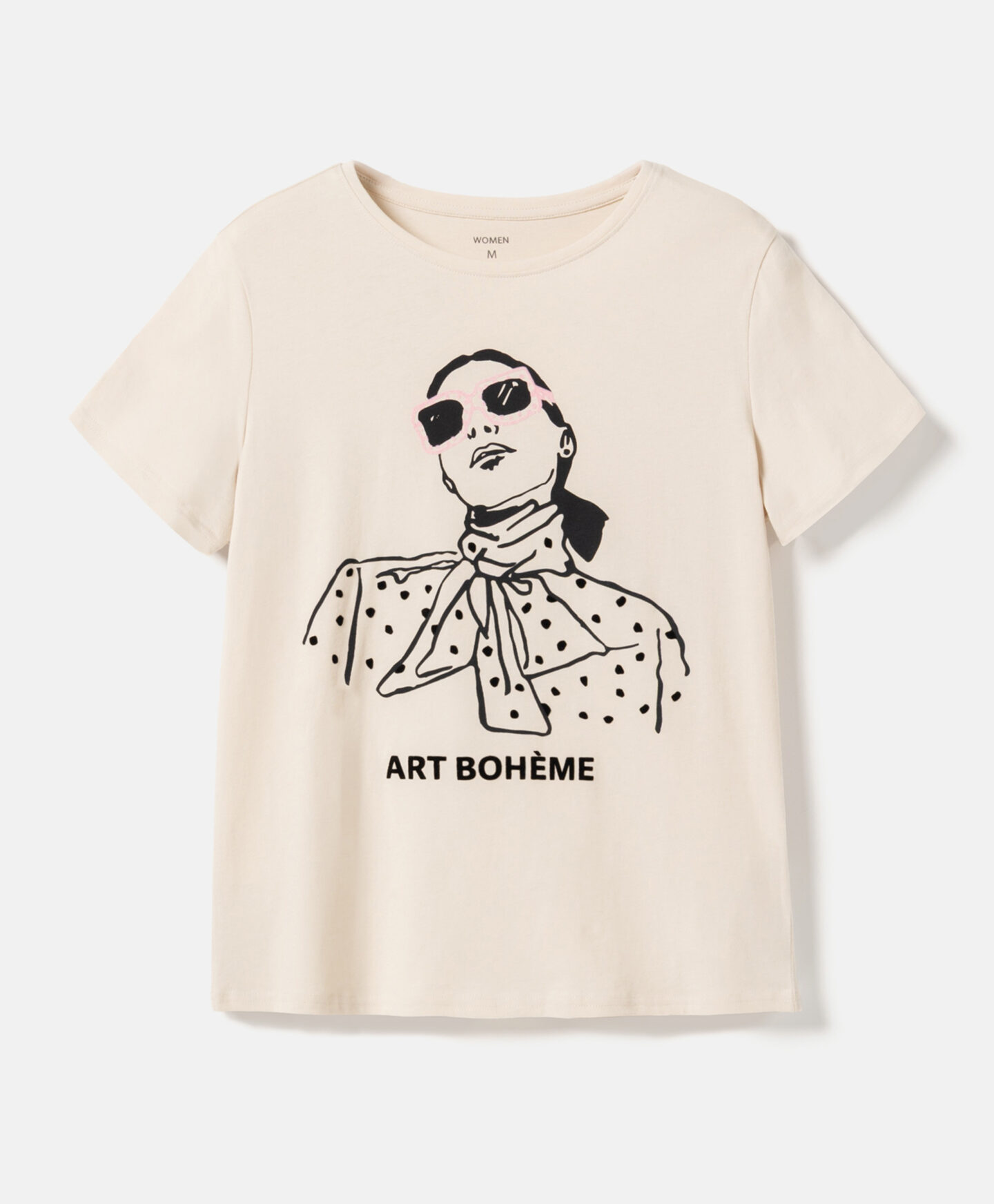 Majica kratkih rukava s printom za žene, napravljena od 100% pamuka, moderan je izbor za one koji vole jedinstvene dizajne. Prirodni pamuk pruža ugodan osjećaj na koži i prozračnost, čineći majicu savršenom za razne kombinacije.