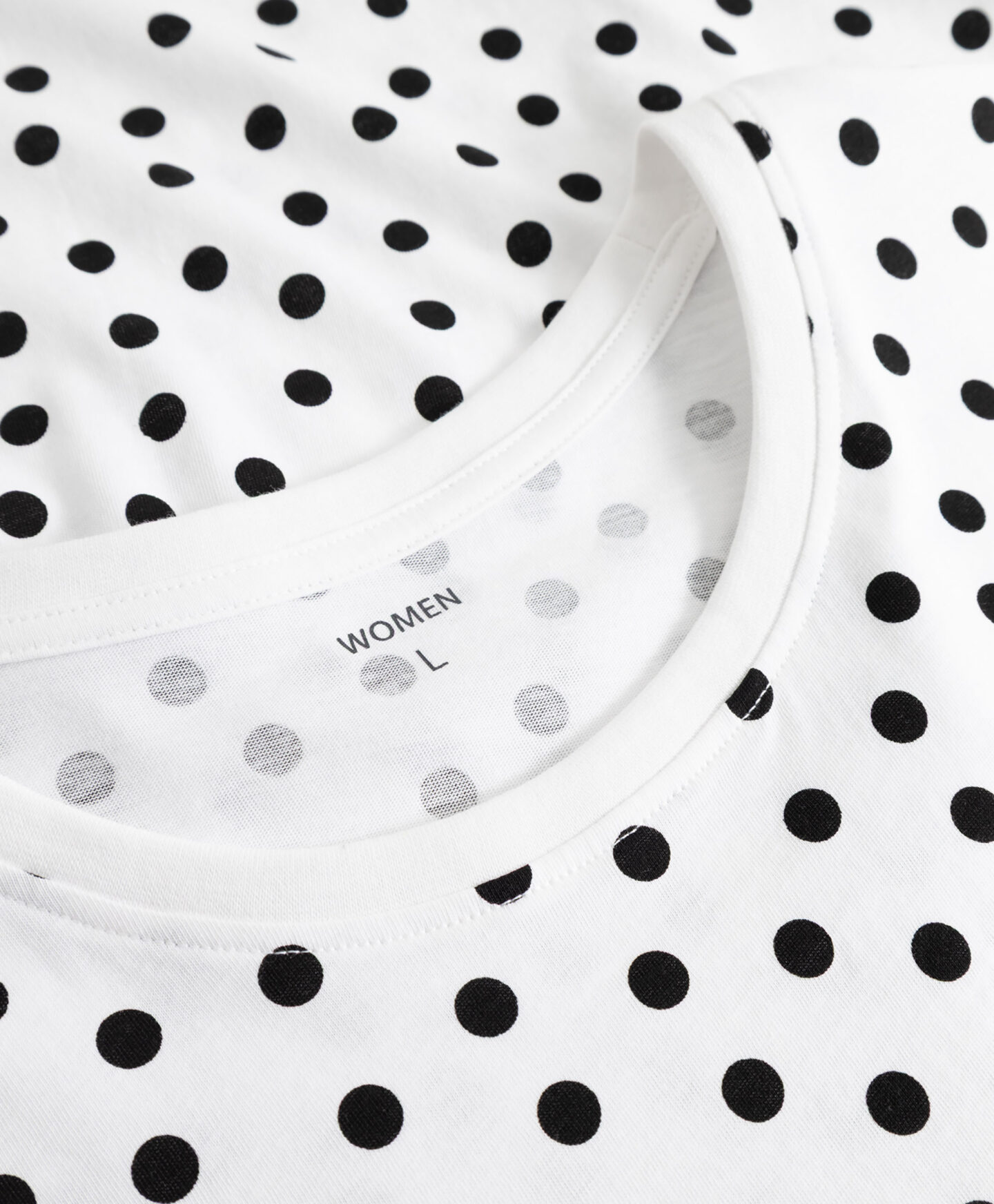 Majica s tačkicama za žene, napravljena od 100% pamuka, odlično će poslužiti za kancelariju ili opuštanje kod kuće. Lagana je i prozračna. Kratki rukav čini je savršenom kako u slojevitom outfitu s jaknom, džemperom ili duksericom, tako i kada se nosi samostalno u prvim toplim danima. Izgleda odlično u kombinaciji s jeansom, chinos hlačama ili trenerkom. Bezvremenski uzorak s tačkicama savršeno će upotpuniti vaš ormar.