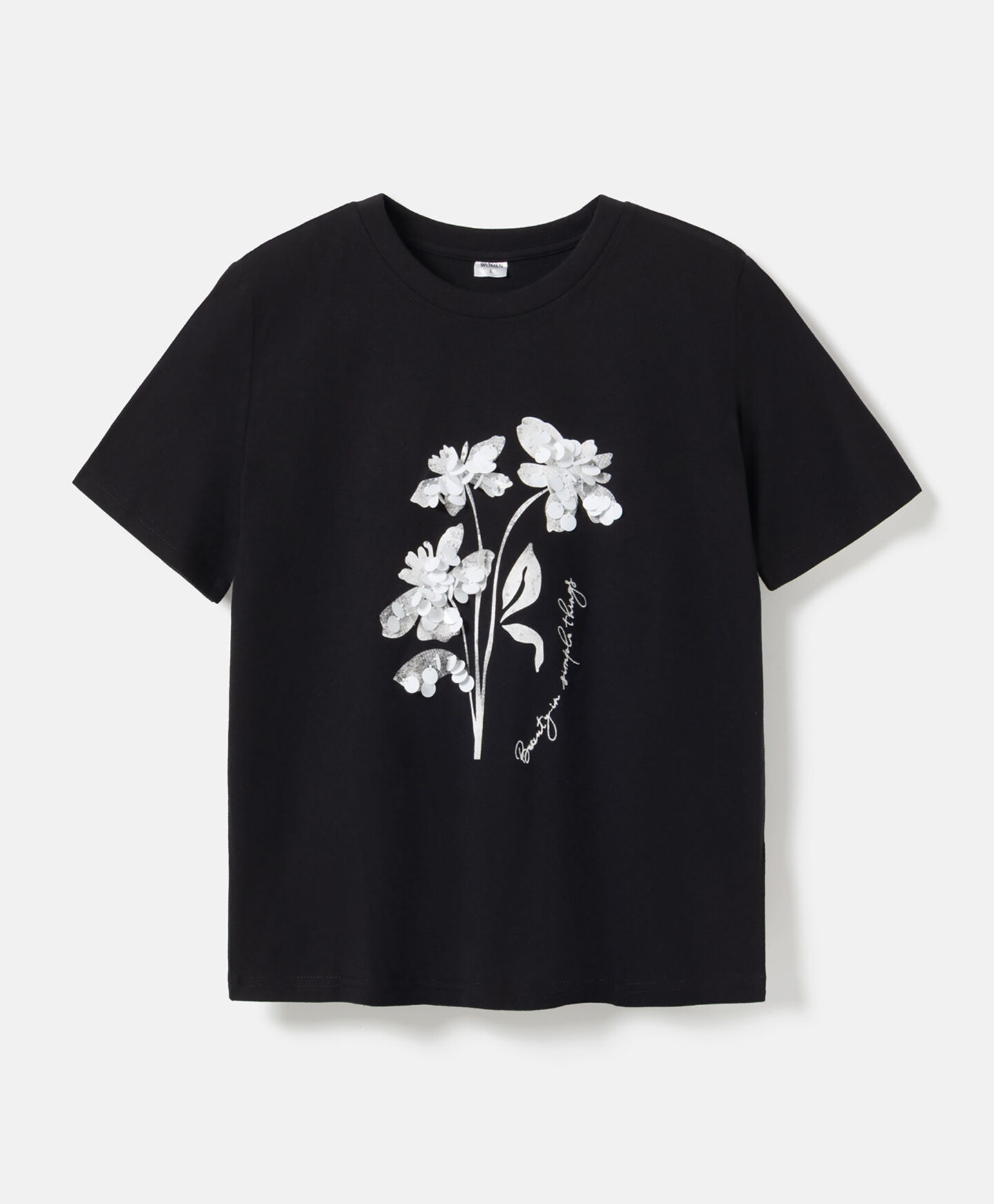 Majica s aplikacijom od šljokica za žene, napravljena od 100% pamuka, zasjat će u svakoj kombinaciji. Klasičan kroj, sjajna uzorak na prednjem dijelu i univerzalna boja stvaraju stilsku cjelinu pogodnu za različite prilike. Majica se ističe ispod sakoa i savršeno dopunjuje kombinaciju s elegantnom suknjom. Mekan materijal osigurava udobnost tokom nošenja.
