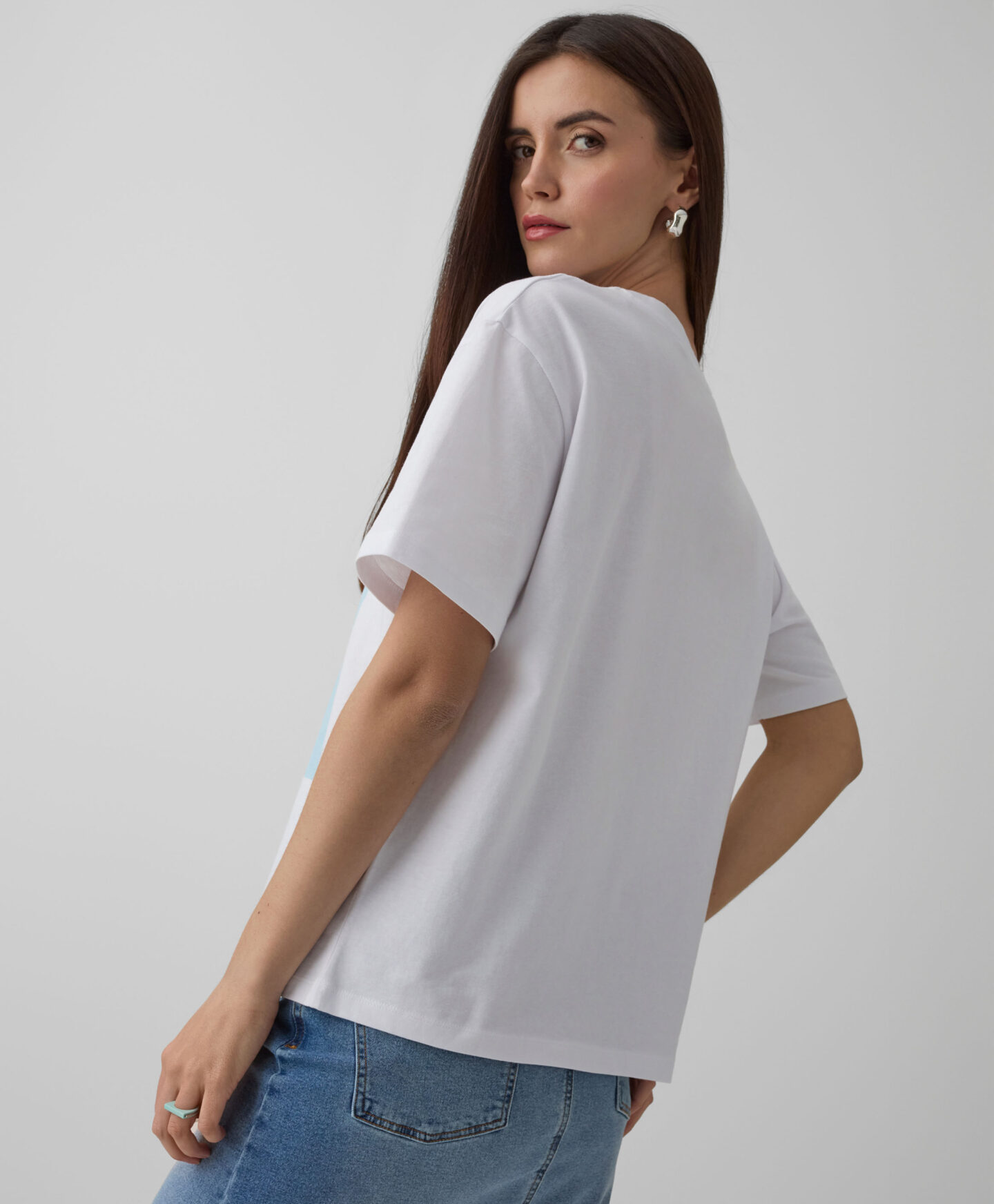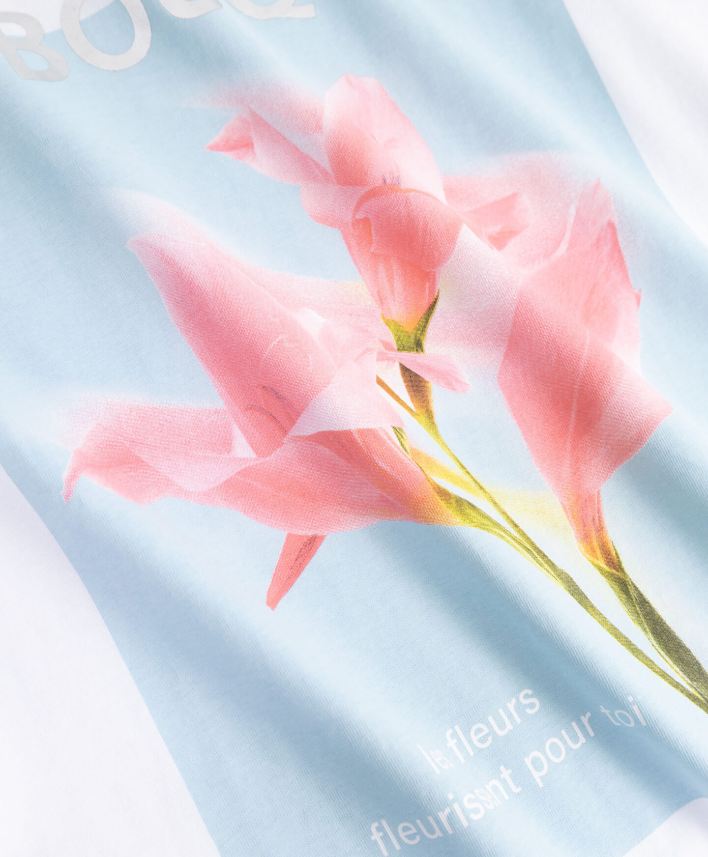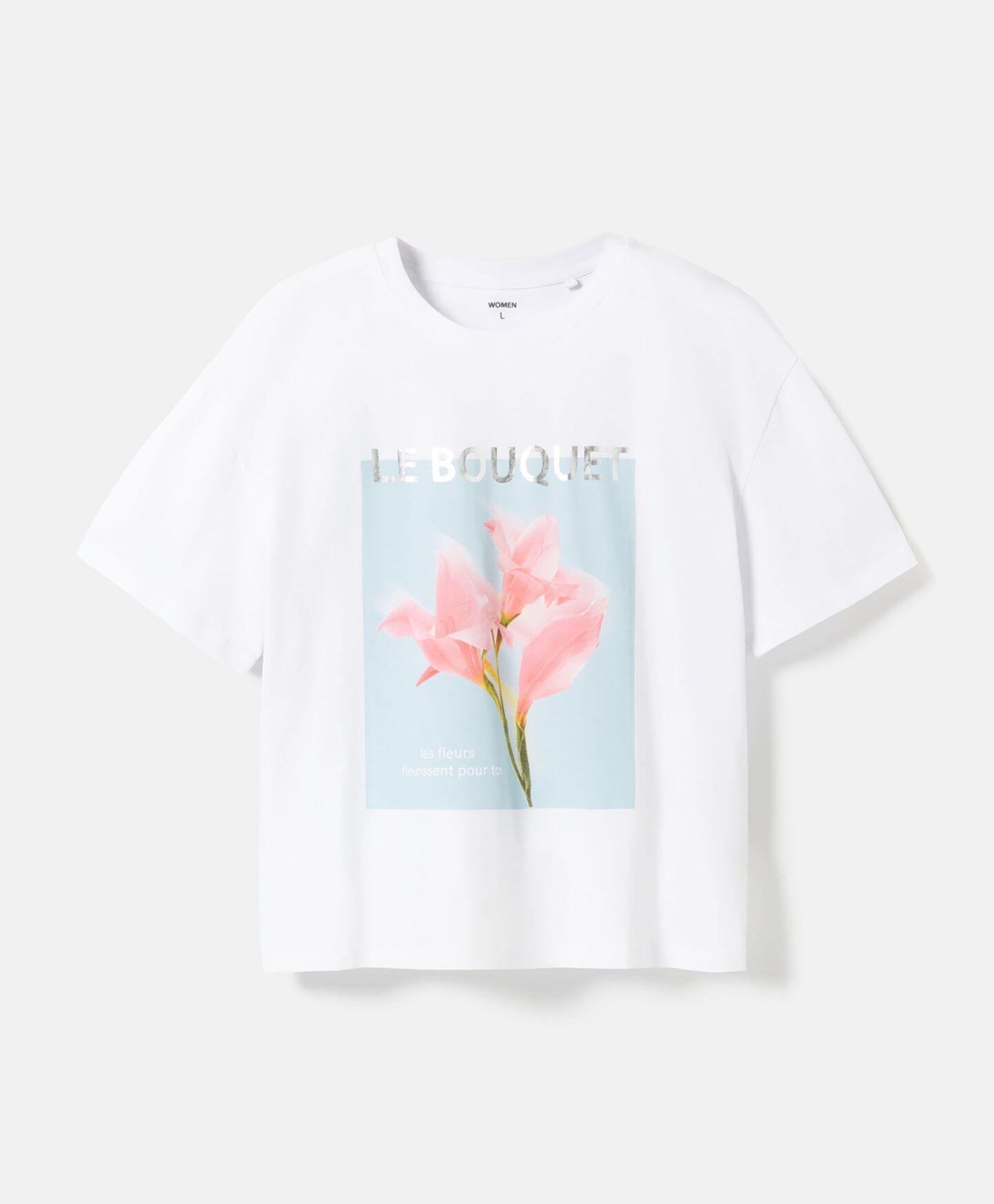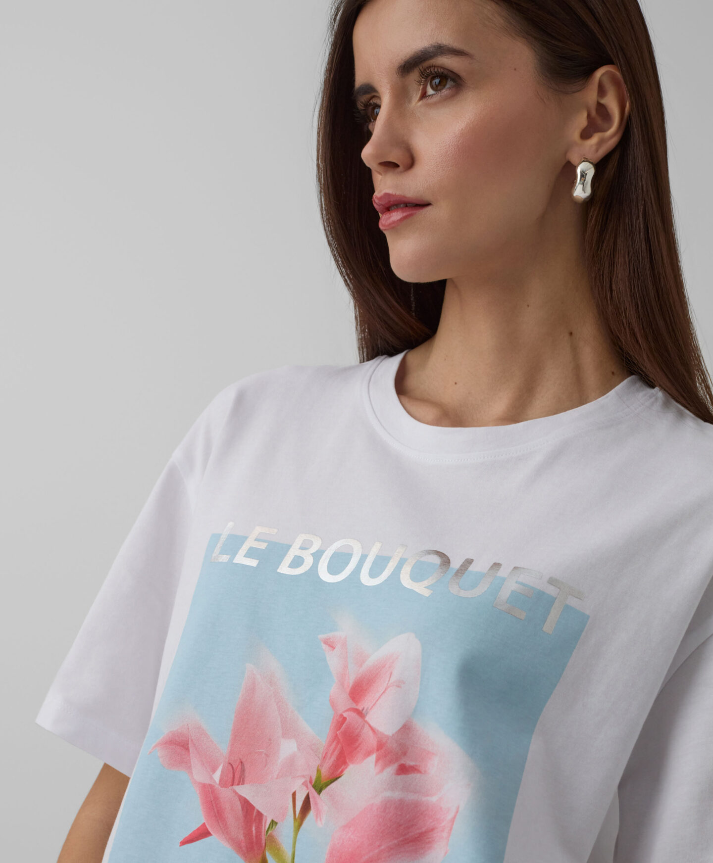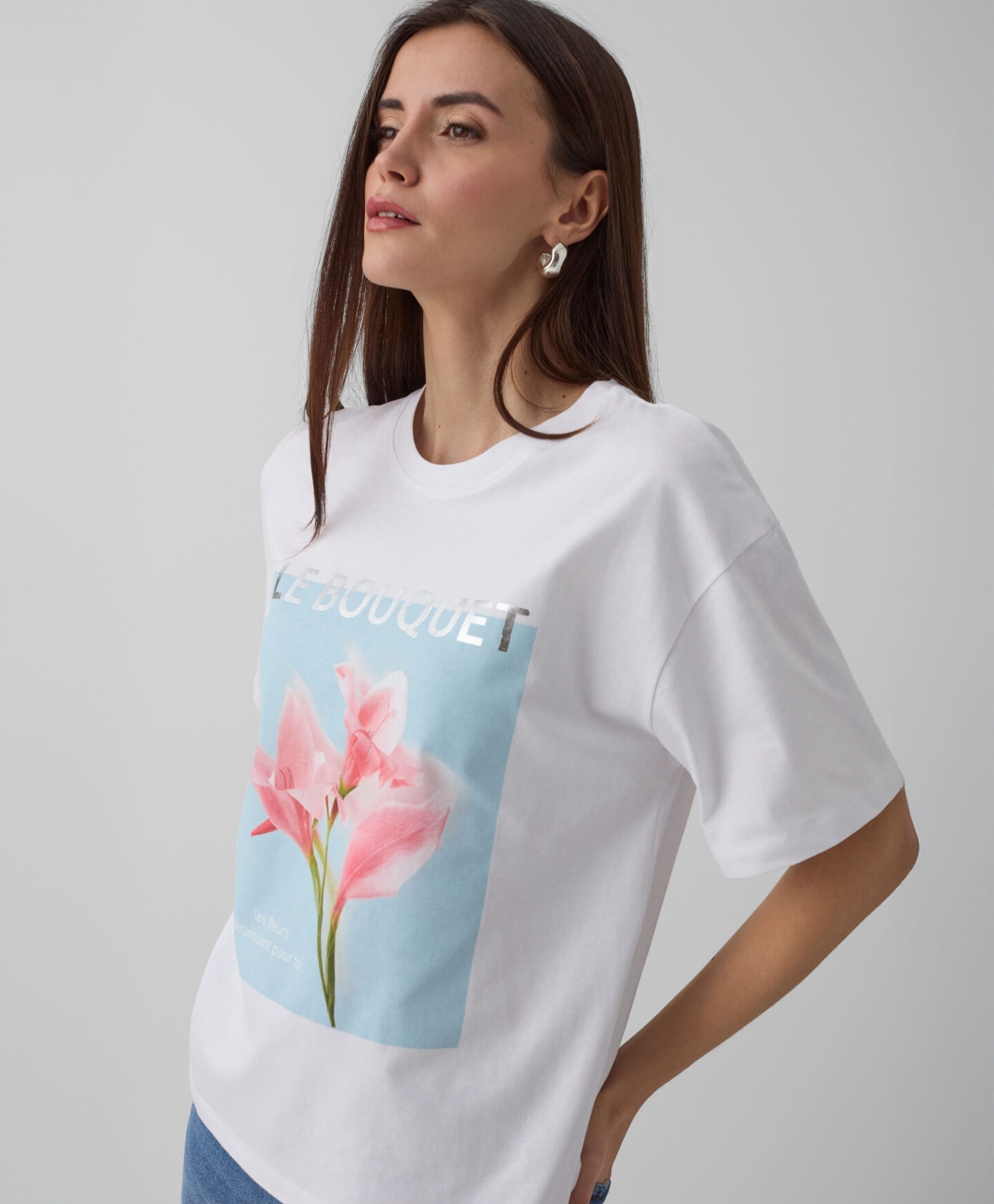 Majica s uzorkom cvijeća za žene, napravljena od 100% pamuka, unosi svježinu u svaku garderobu. Mekana je, prijatna na dodir i omogućava koži da diše. Print na prednjem dijelu privlači pažnju i daje majici poseban karakter. Savršeno se kombinuje s klasičnim jeansom za svakodnevne prilike.