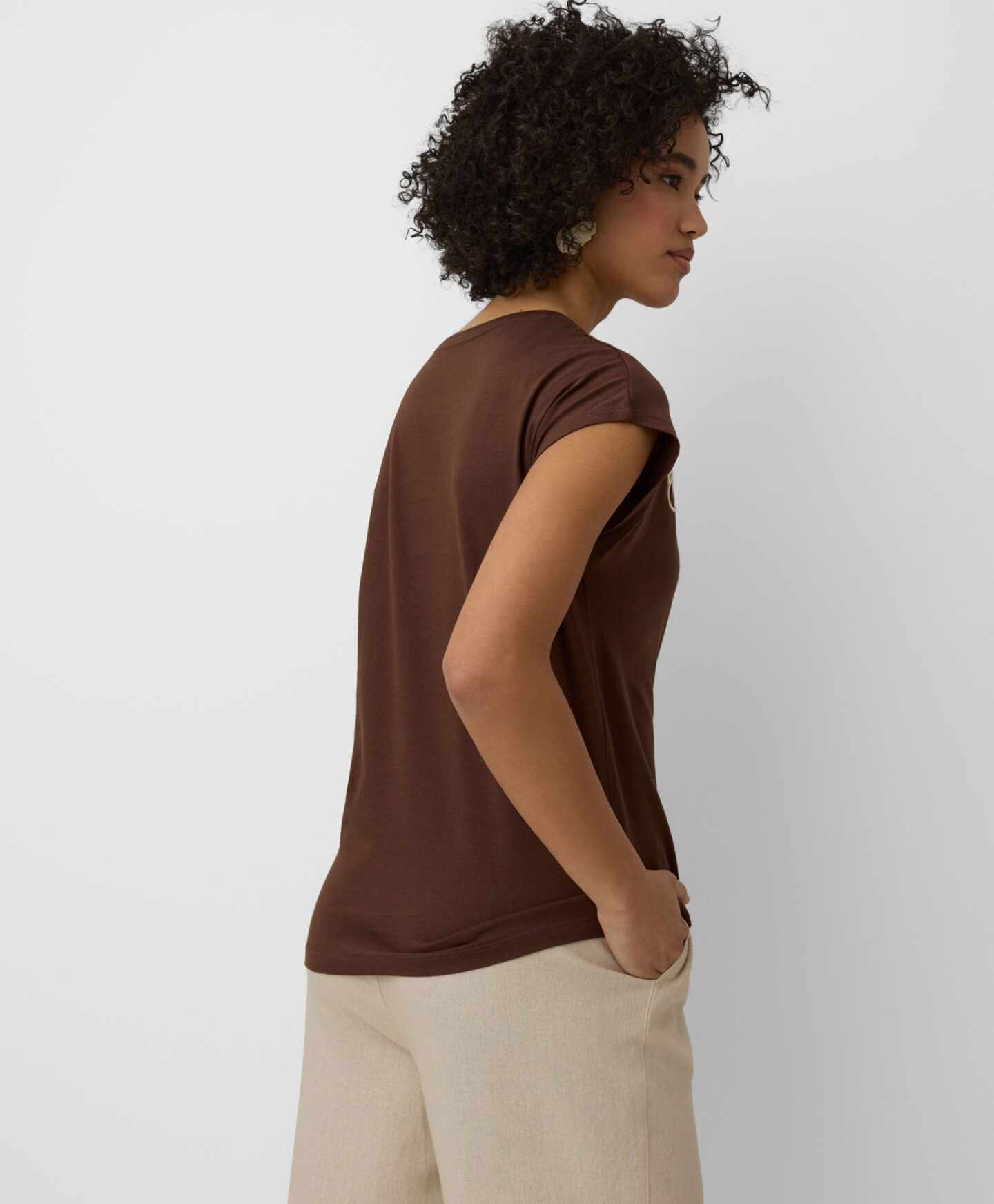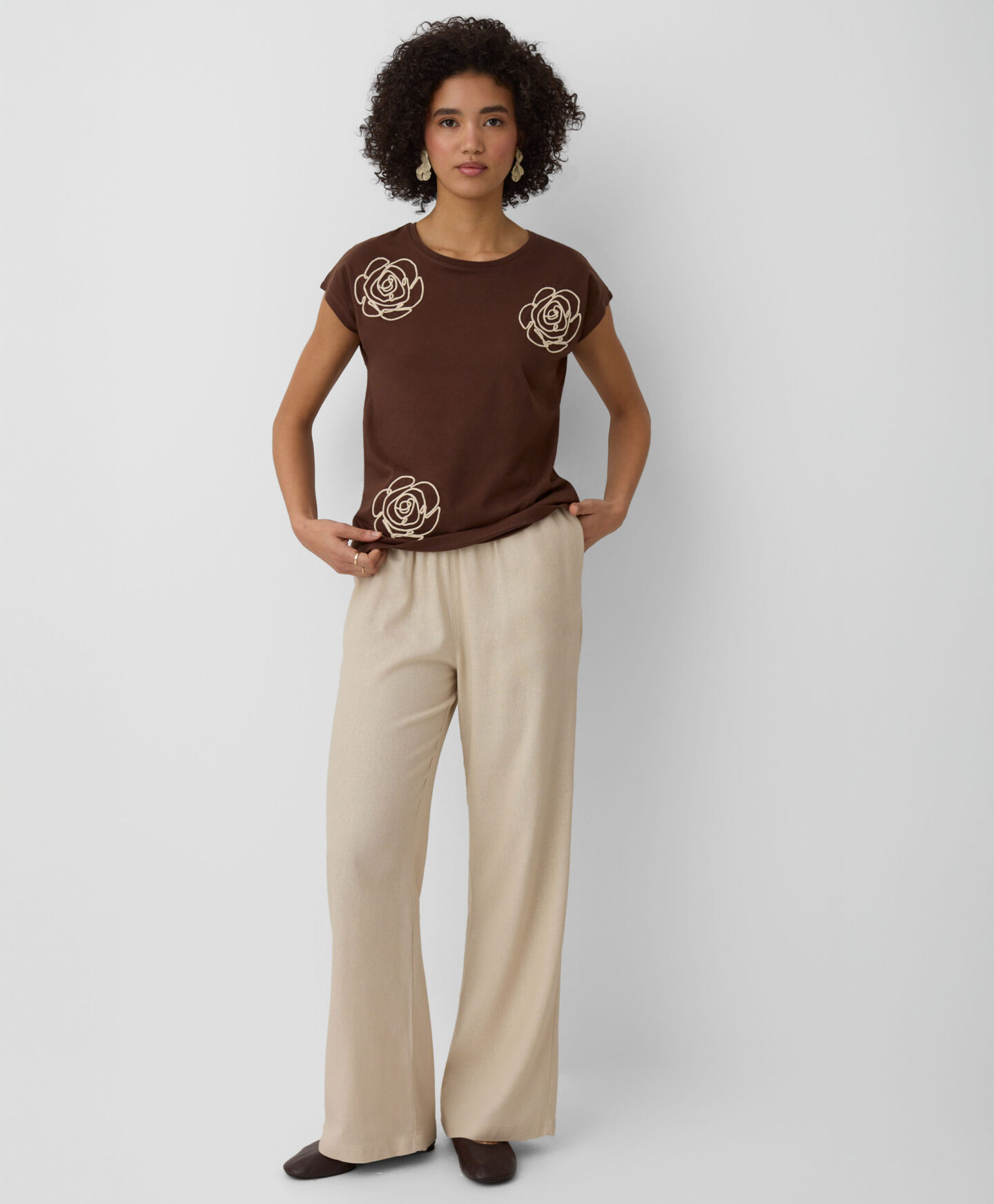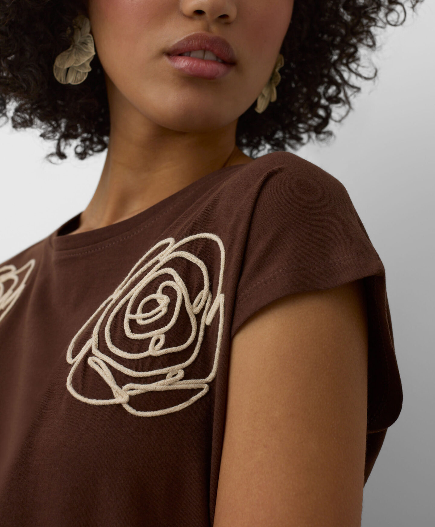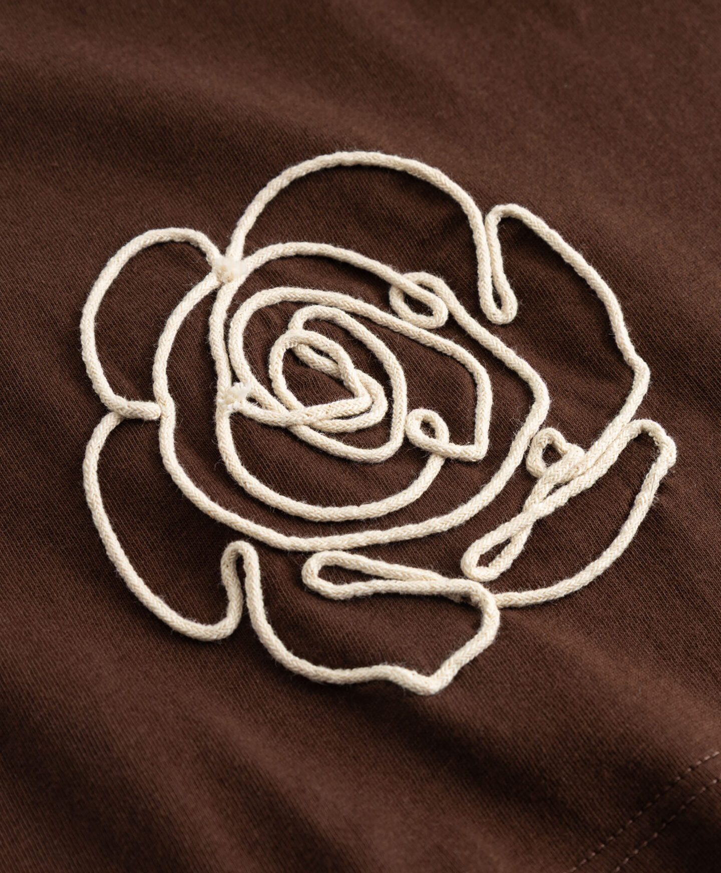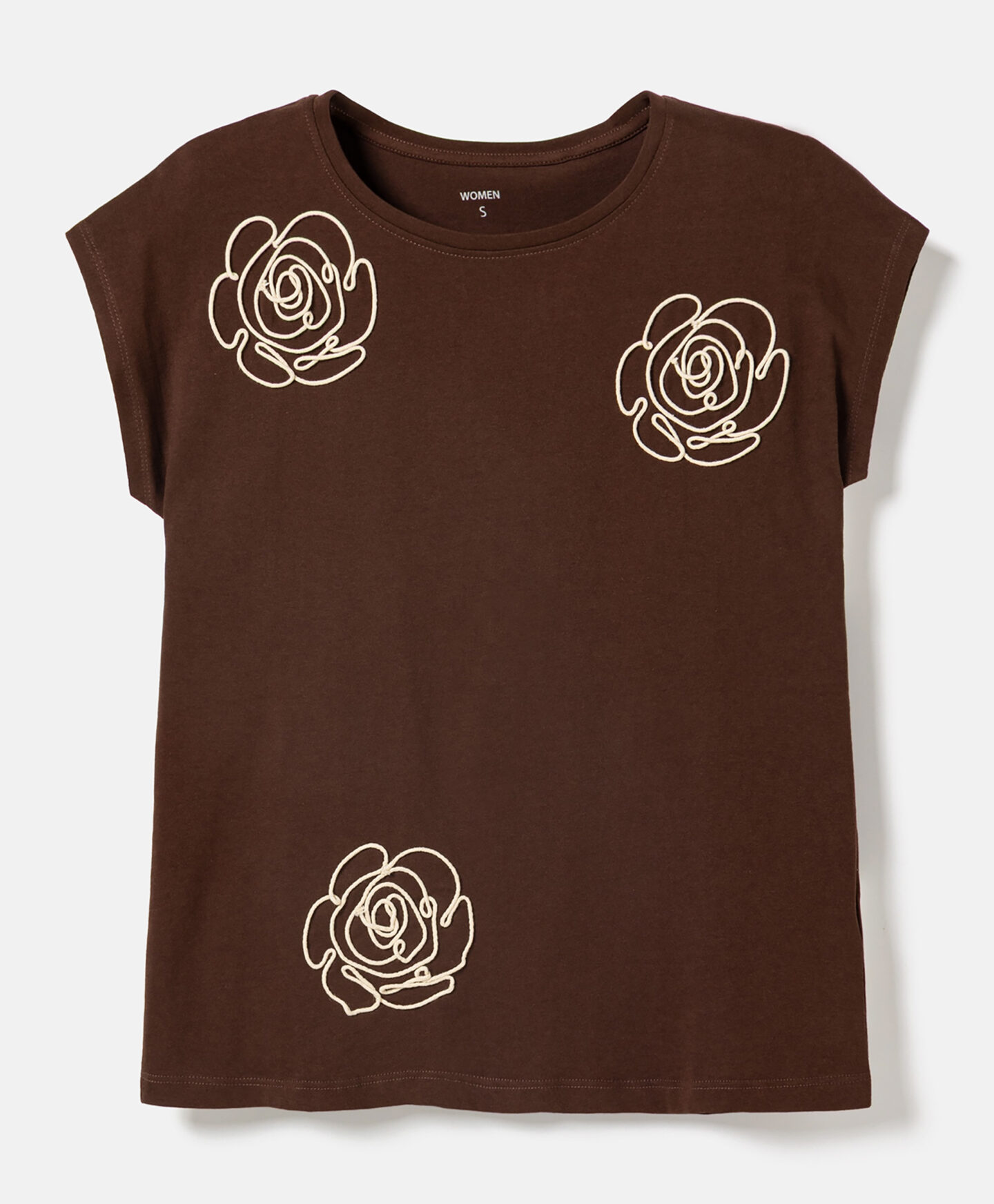 Majica s cvjetnim printom na prednjem dijelu za žene, napravljena od 100% pamuka, pravi je komad koji privlači pažnju. Bež ruže lijepo se ističu na smeđoj podlozi, dodajući dašak elegancije. Mekani pamuk omogućava koži da diše, čineći je savršenom za slojevito oblačenje ili nošenje samostalno.