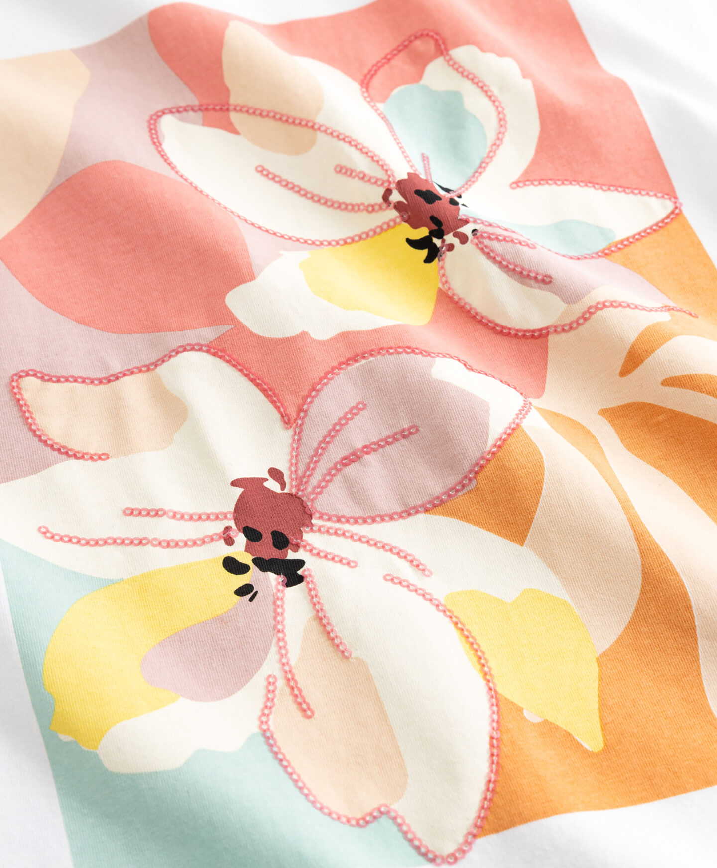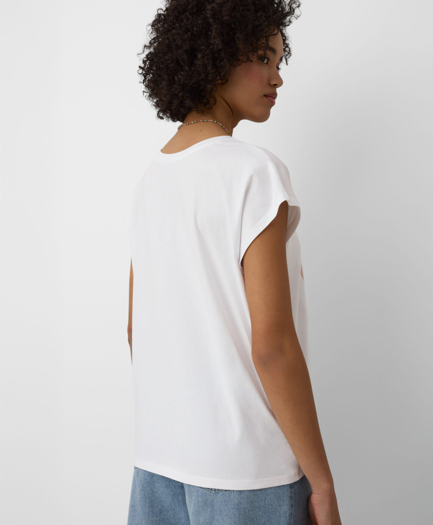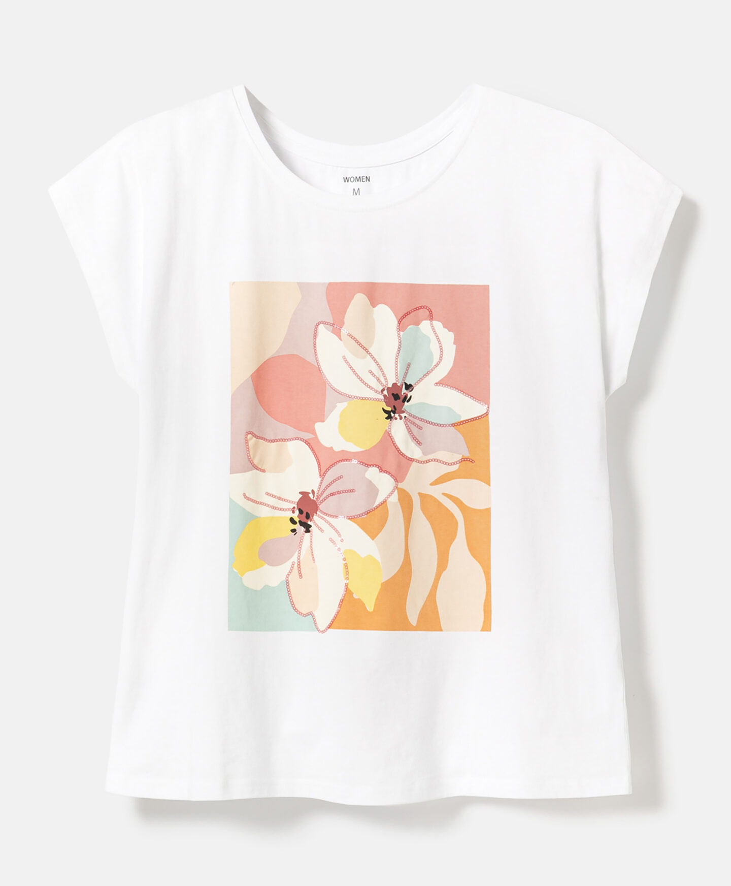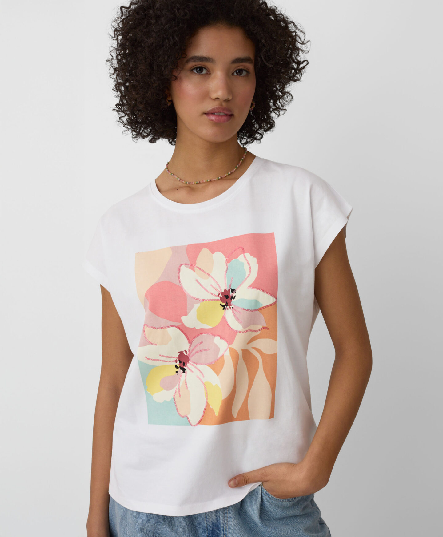 Majica za žene, s visokim udjelom pamuka i dodatkom elastina, lijepo pristaje figuri. Grafika s cvijetom ukrašena šljokicama privlači pažnju. Udobna je, prozračna i omogućava koži da diše. Savršena je za kombinovanje s omiljenim jeansom, trenerkama ili elegantnim hlačama.