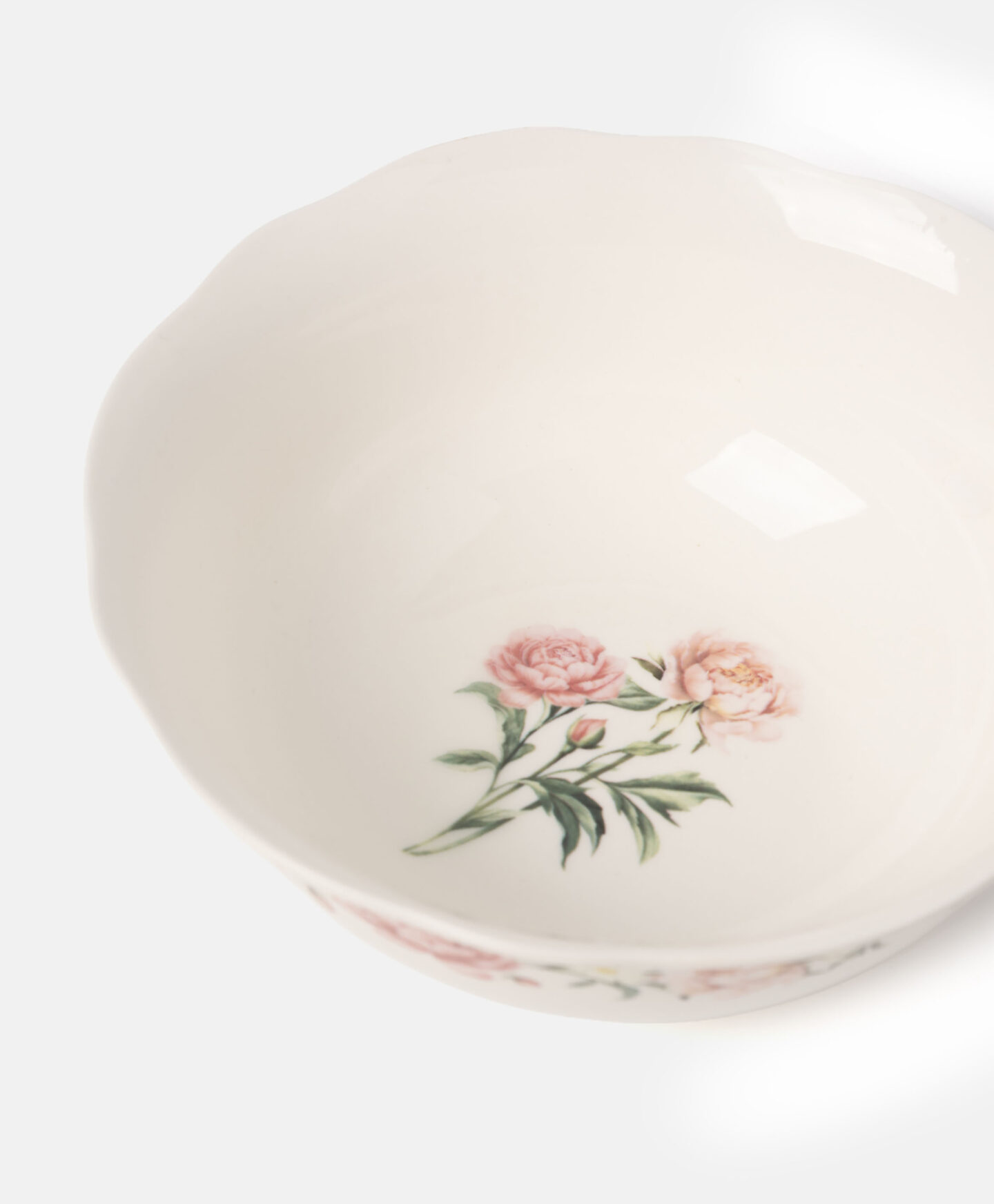Mala keramička zdjela s cvjetnim uzorkom očarava svojim dizajnom. Napravljena je od New Bone China porcelana s kremasto bijelim sjajem. Odličan je izbor za elegantno posuđe po razumnoj cijeni. U ponudi su dostupni i odgovarajući tanjiri i čajnik.