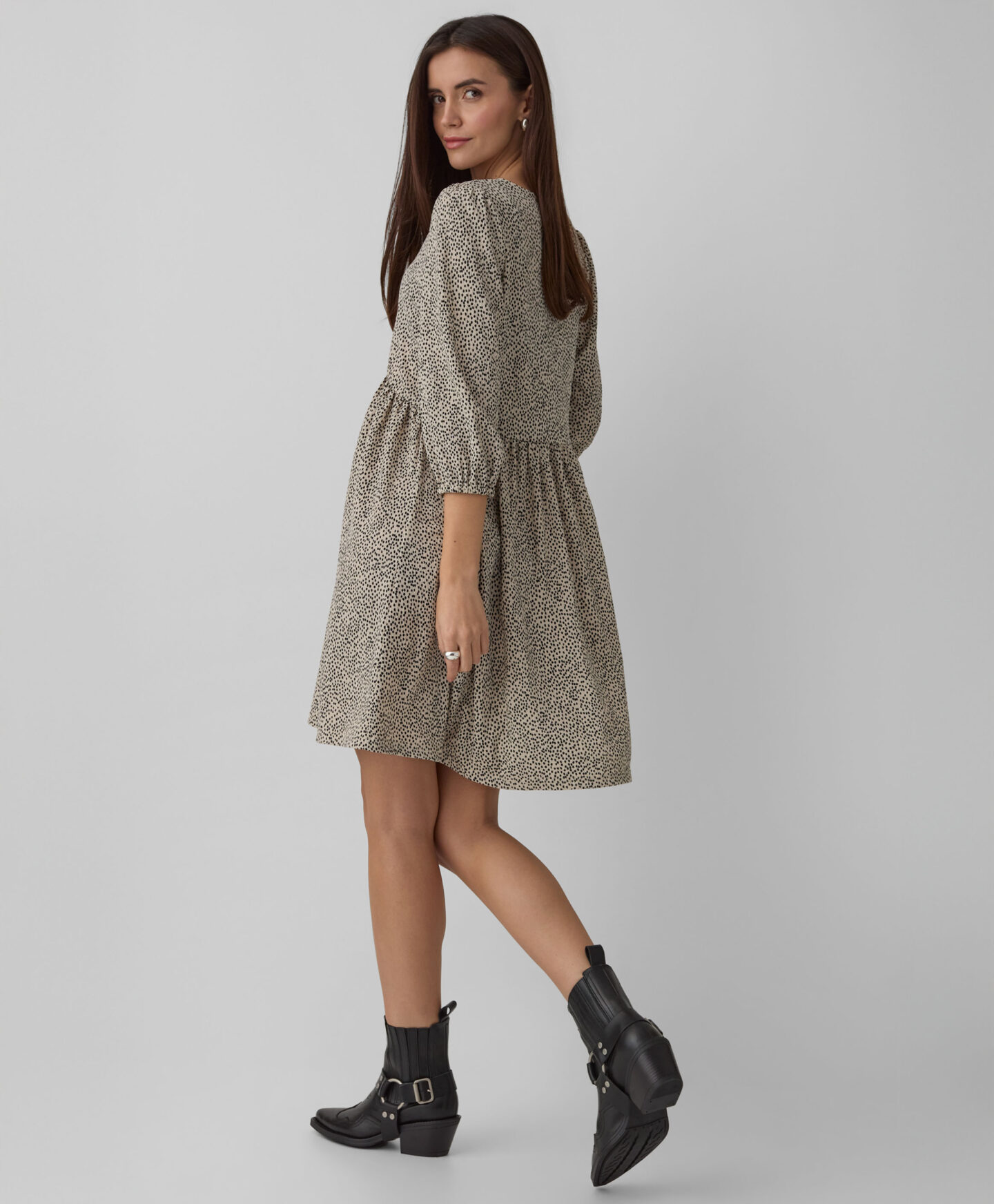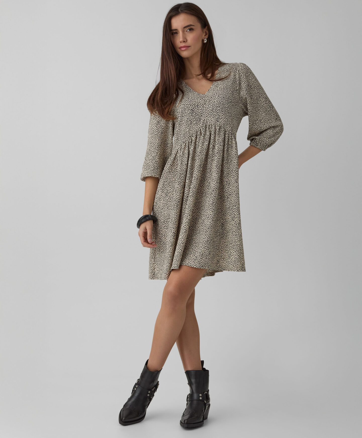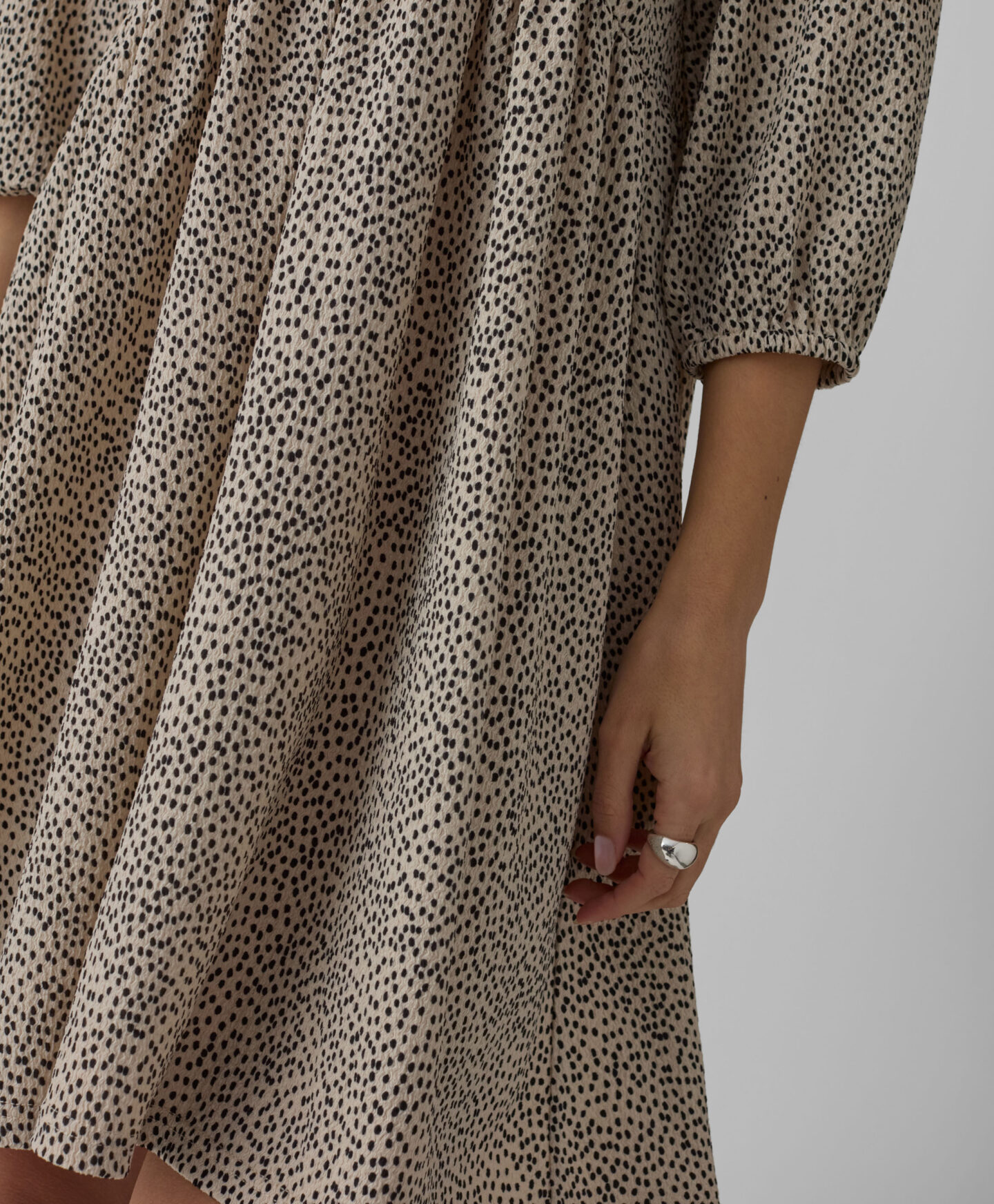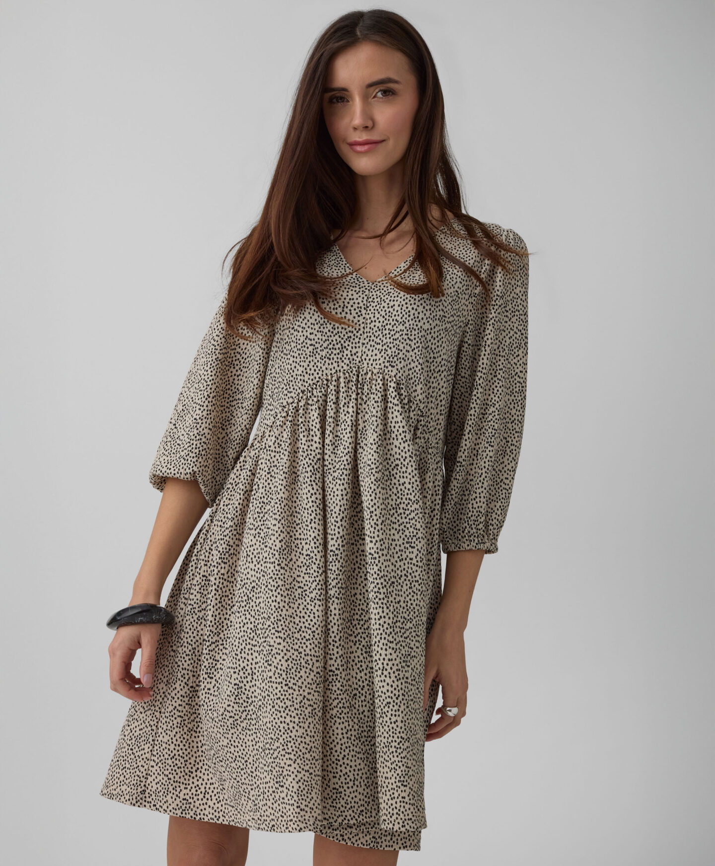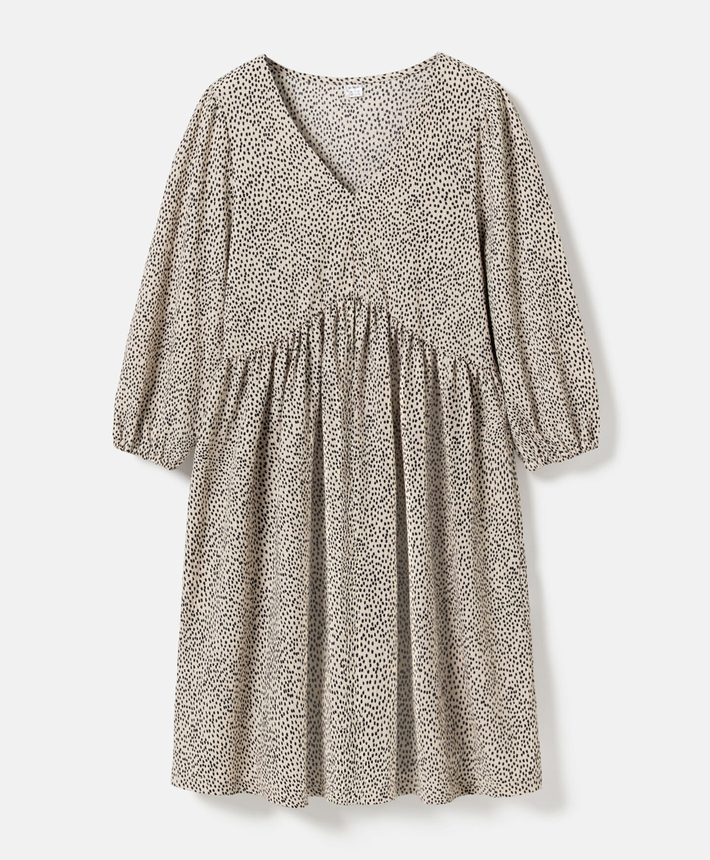 Naborana haljina za žene ističe se nepravilnim uzorkom. Karakteristični nabori stvaraju trodimenzionalnu formu koja lijepo oblikuje siluetu. Nježan V-izrez naglašava vrat i daje lakoću cijelom izgledu. Mekani materijal osigurava udobnost tokom cijelog dana. Haljina se može kombinovati sa sportskom obućom, baletankama ili čizmama.