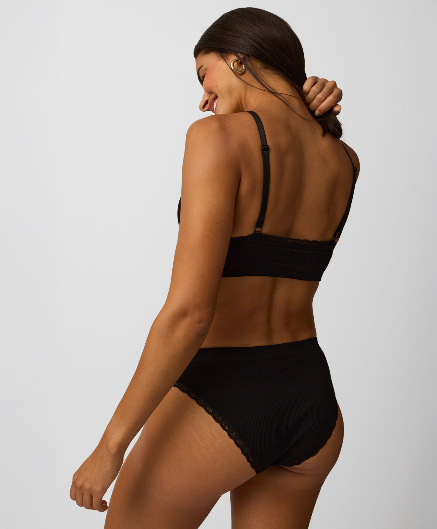 Pakovanje od 2 komada crnih bikini gaćica s čipkom savršeno je za ljubiteljice romantičnog donjeg veša. Senzualna čipka budi maštu, ali je jednako pogodna i za svakodnevno nošenje. Bikini kroj pruža potpuno prekrivanje i udobnost, a istovremeno naglašava ženske obline.