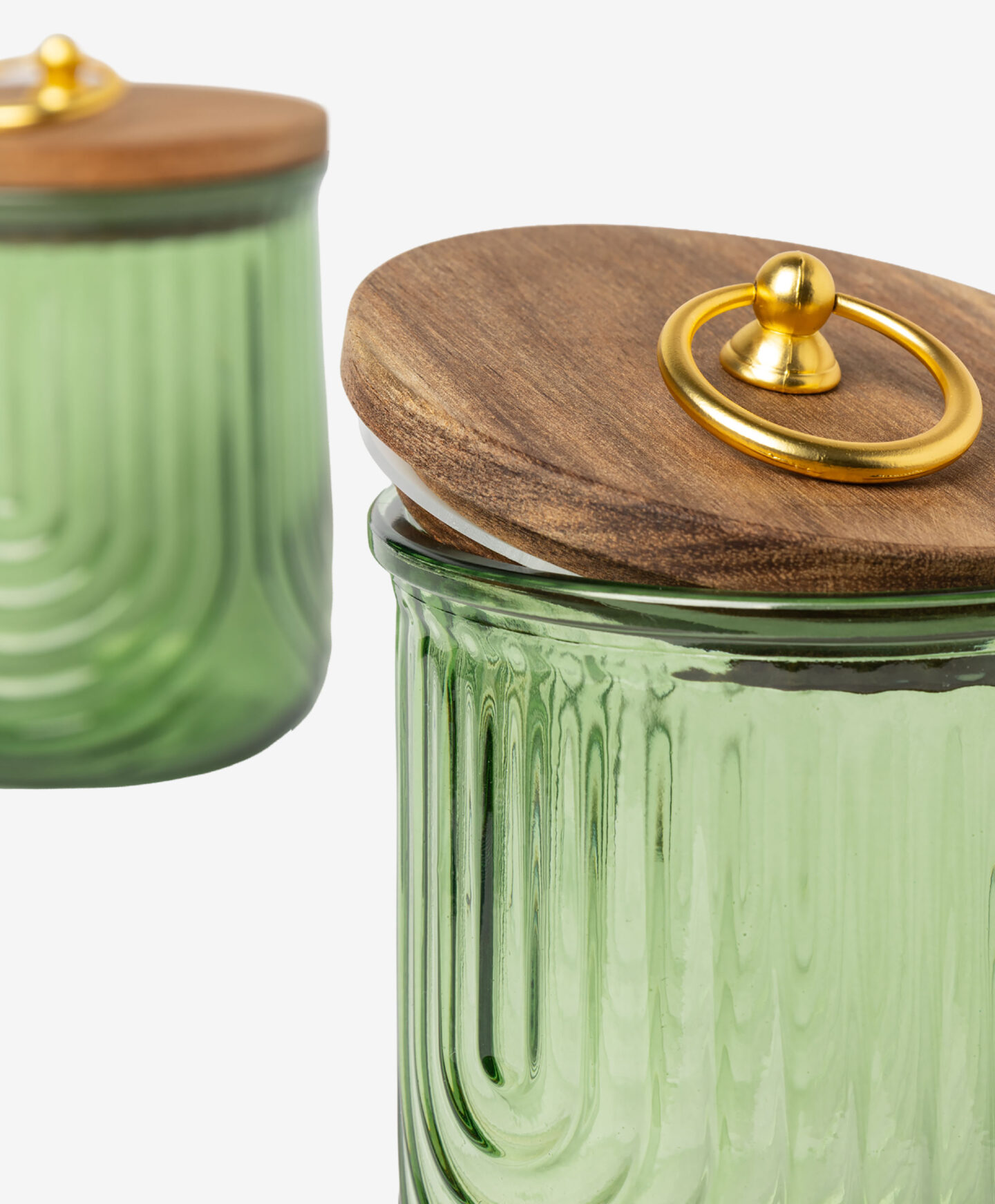 Pakovanje od 2 tegle idealno je rješenje za one koji cijene funkcionalnost u kombinaciji s estetikom. Tegle od rebrastog stakla nisu samo praktične, već služe i kao elegantan ukrasni element u kuhinji ili kupatilu. Drveni poklopac dodaje prirodan šarm i savršeno zatvara sadržaj, čuvajući proizvode svježima.