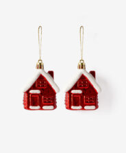 Ukrasi u obliku kućica unose prazničnu toplinu u svaki dom. Pakovanje od dvije crvene kućice s bijelim krovovima podsjeća na snijegom prekrivene kolibe koje divno reflektuju svjetlost lampica. Zahvaljujući čvrstoj izradi i praktičnim kukicama, lako se kače na grane i stvaraju skladan, šarmantan ukras.