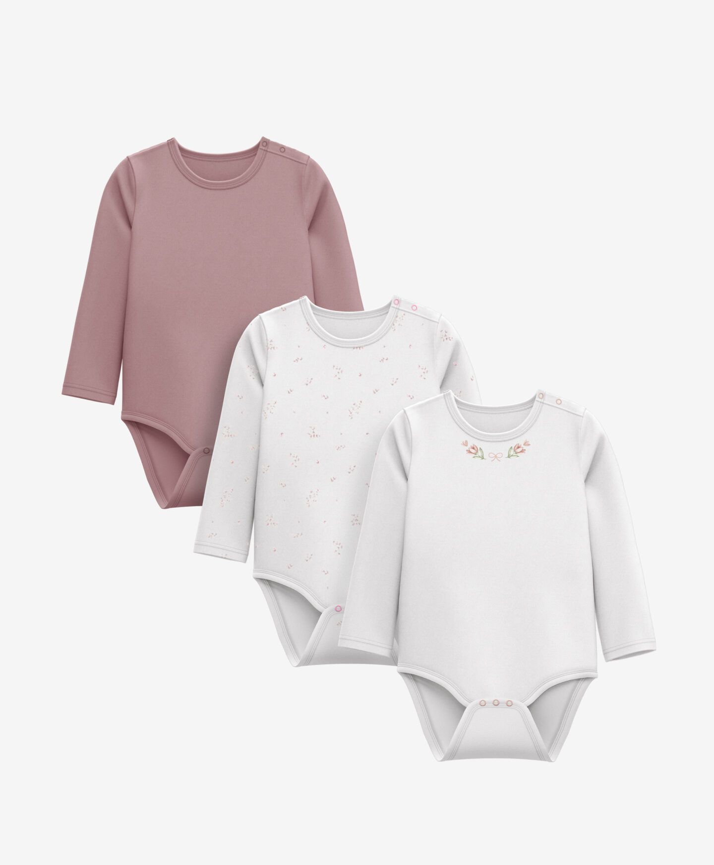 Pakovanje od 3 bodija s uzorkom cvijeća za bebe-djevojčice, napravljeni od 100% pamuka, namijenjeno je malim ljubiteljicama prirode. Presladak print s cvijećem izmamiti će osmijeh na lice svake djevojčice. Bodiji su napravljeni od pamuka, što ih čini prozračnim, mekanim na dodir i udobnim za nošenje. Praktično kopčanje olakšava brzo presvlačenje pelena i oblačenje. U ponudi su dostupni različiti uzorci.