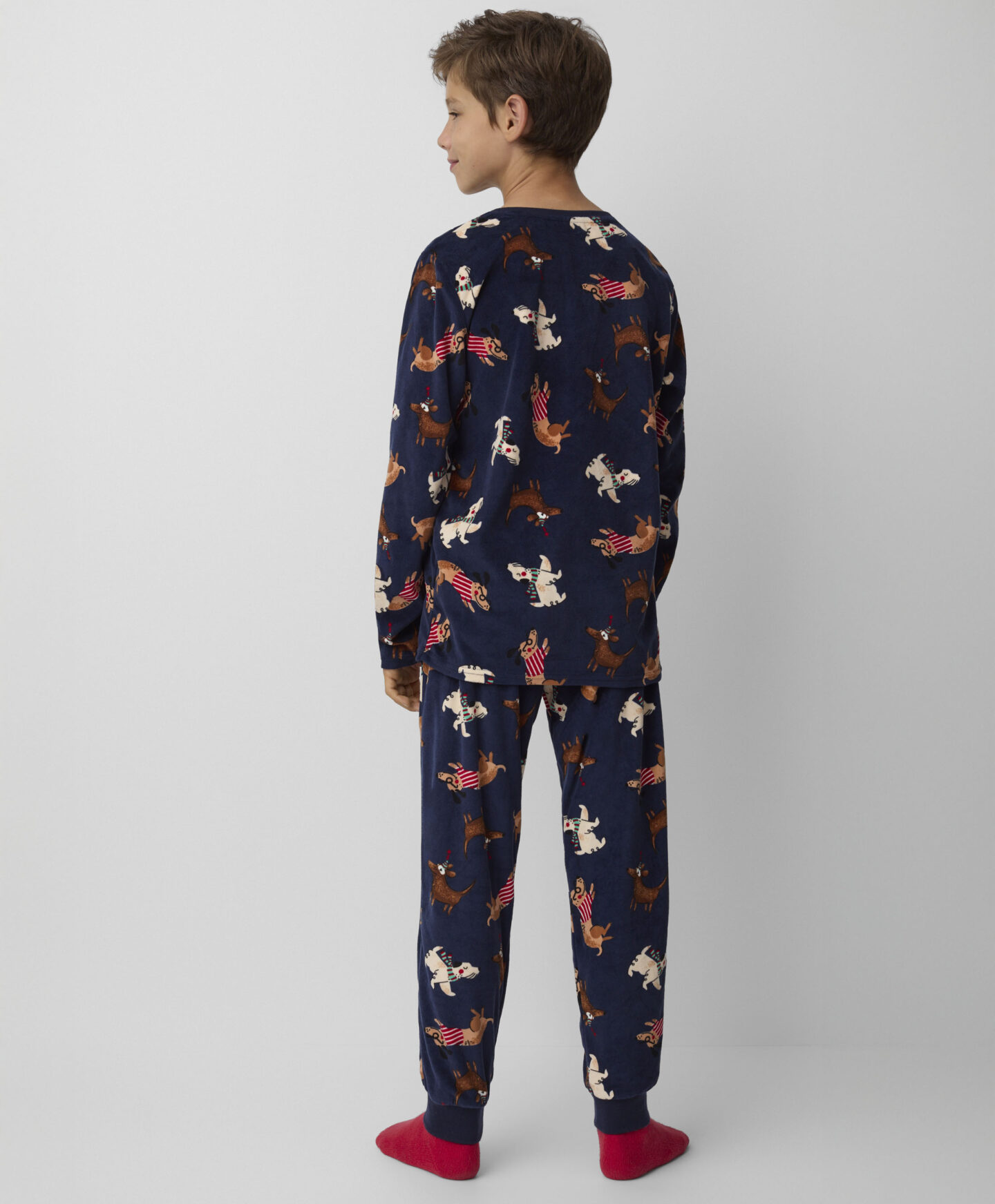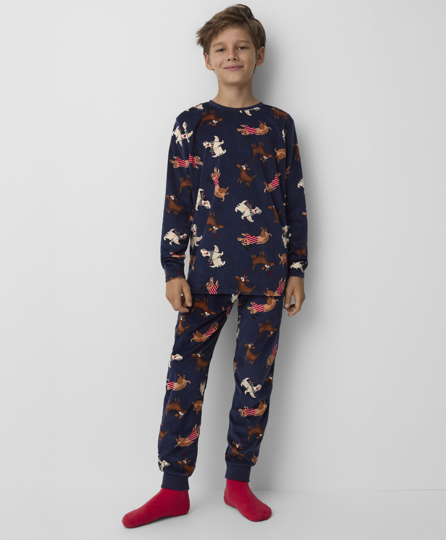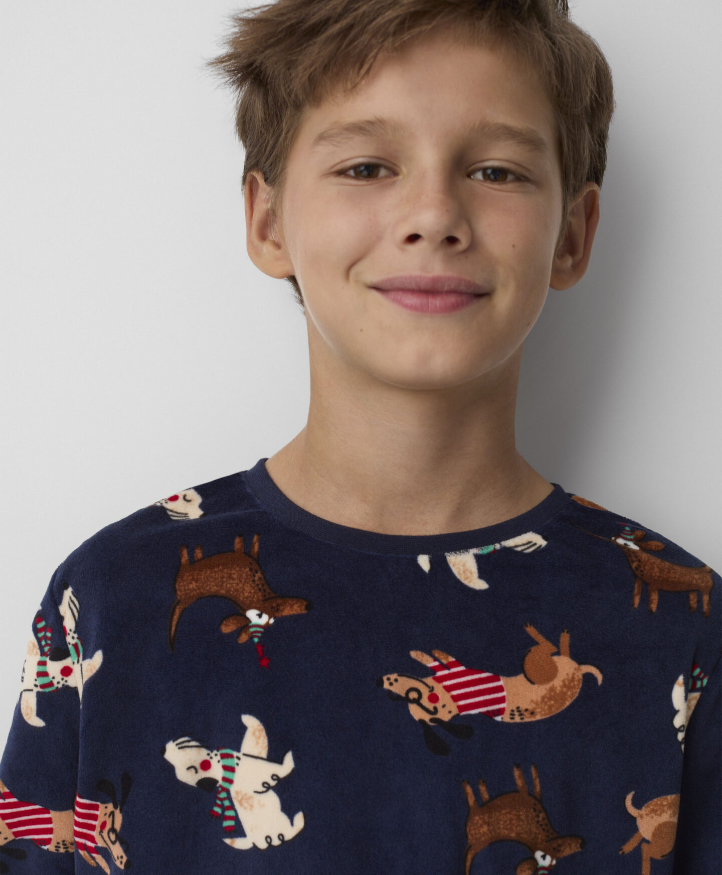 Plišana pidžama s psima za dječake pruža udobnost tokom spavanja i slobodu kretanja. Napravljena od mekanog i prijatnog pliša, idealna je za hladnije noći. Garantuje toplinu i ugodnost. Razigrani motivi s psima učinit će da je svaki dječak rado obuče prije spavanja.
