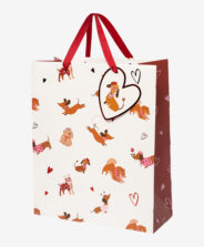 Poklon vrećica s uzorkom psića i privjeskom u obliku srca pruža simpatičan i poseban način pakovanja poklona. Idealna je za razne prilike i posebno će obradovati ljubitelje životinja. Set uključuje mali privjesak za ličnu poruku.