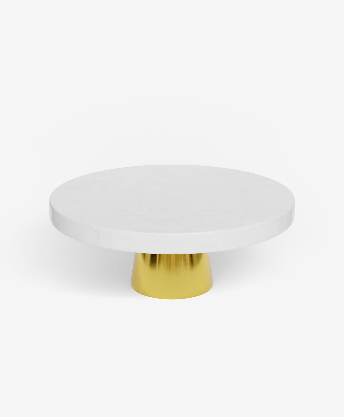 Poslužavnik od mramora ističe kolače i grickalice na povišenoj osnovi. Kombinacija kamenog tanjira i metalnog postolja stvara elegantan akcenat na prazničnom stolu. Zahvaljujući uzdignutoj formi, štedi prostor i dodaje urednost postavci. Idealan za torte, kolače i voće.