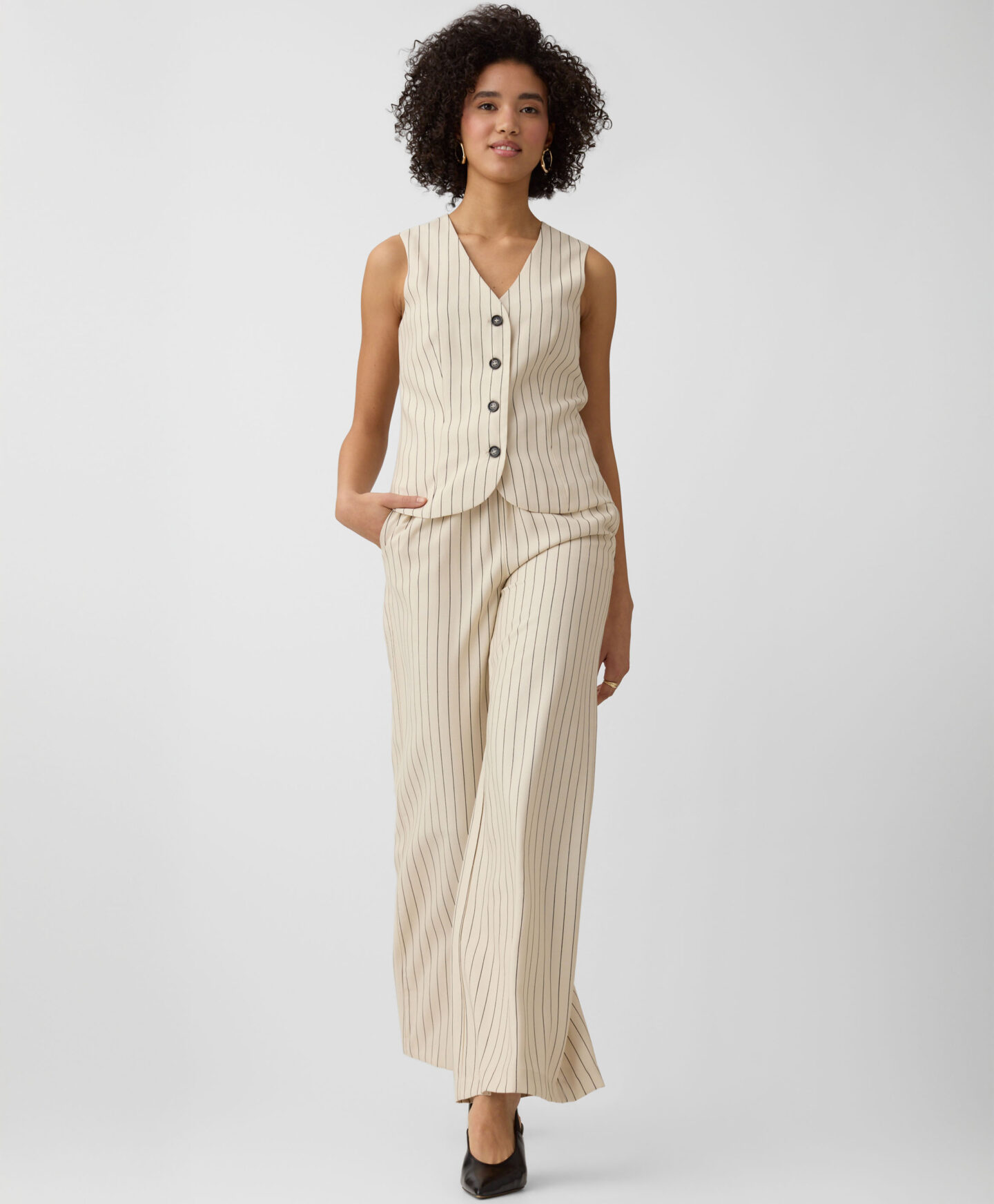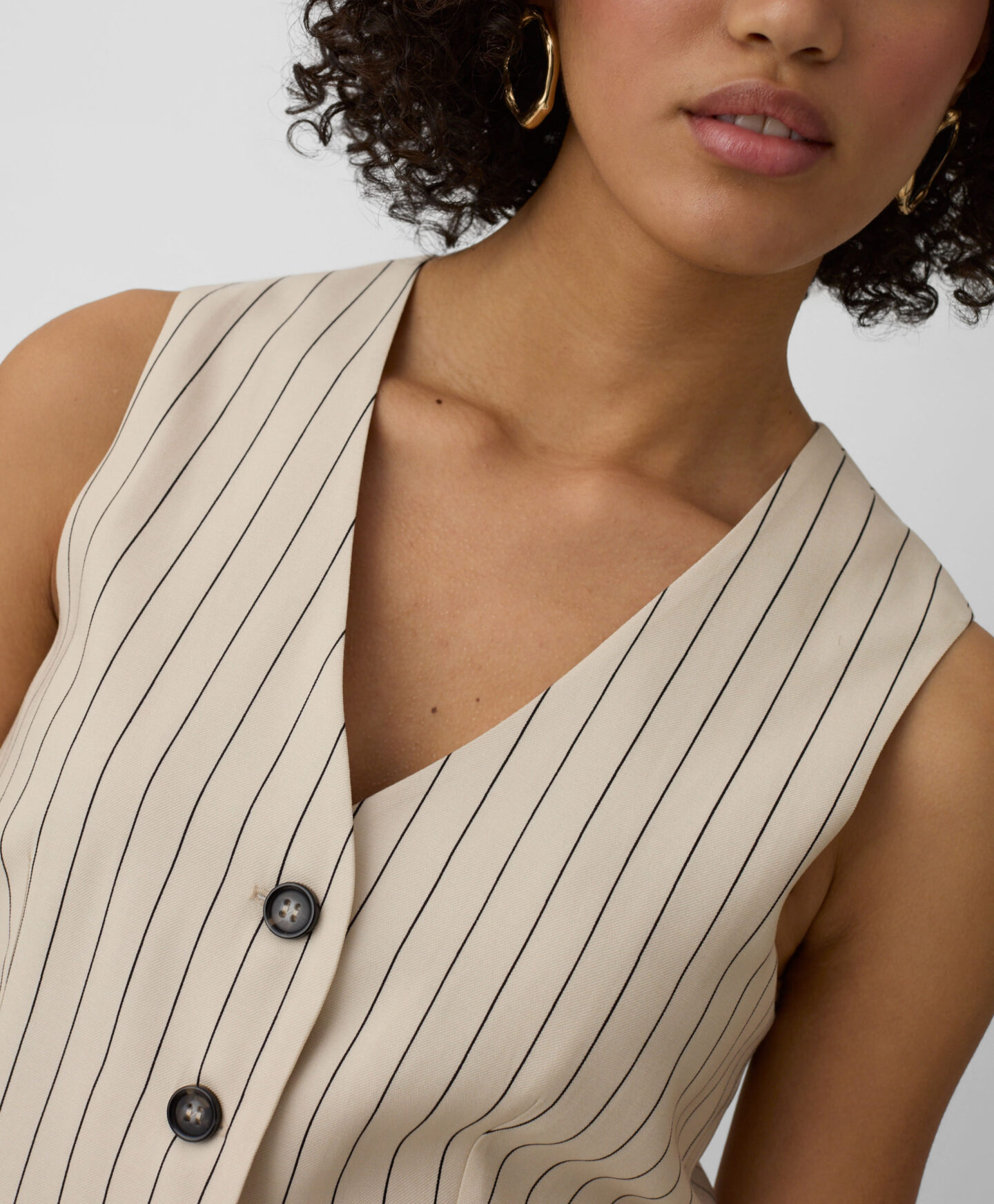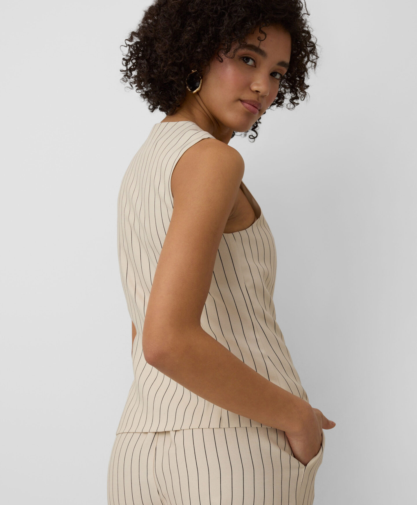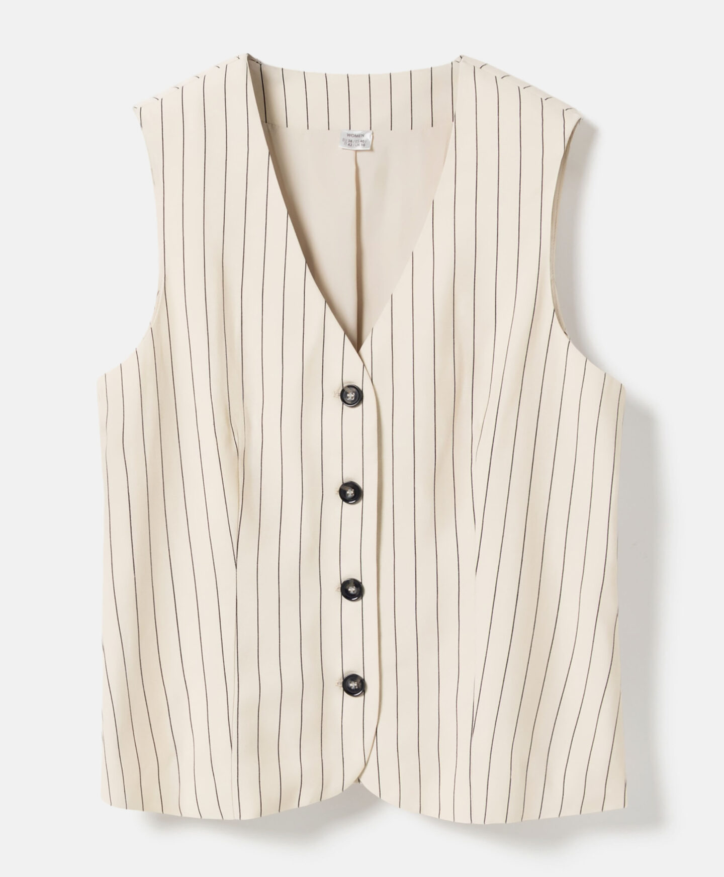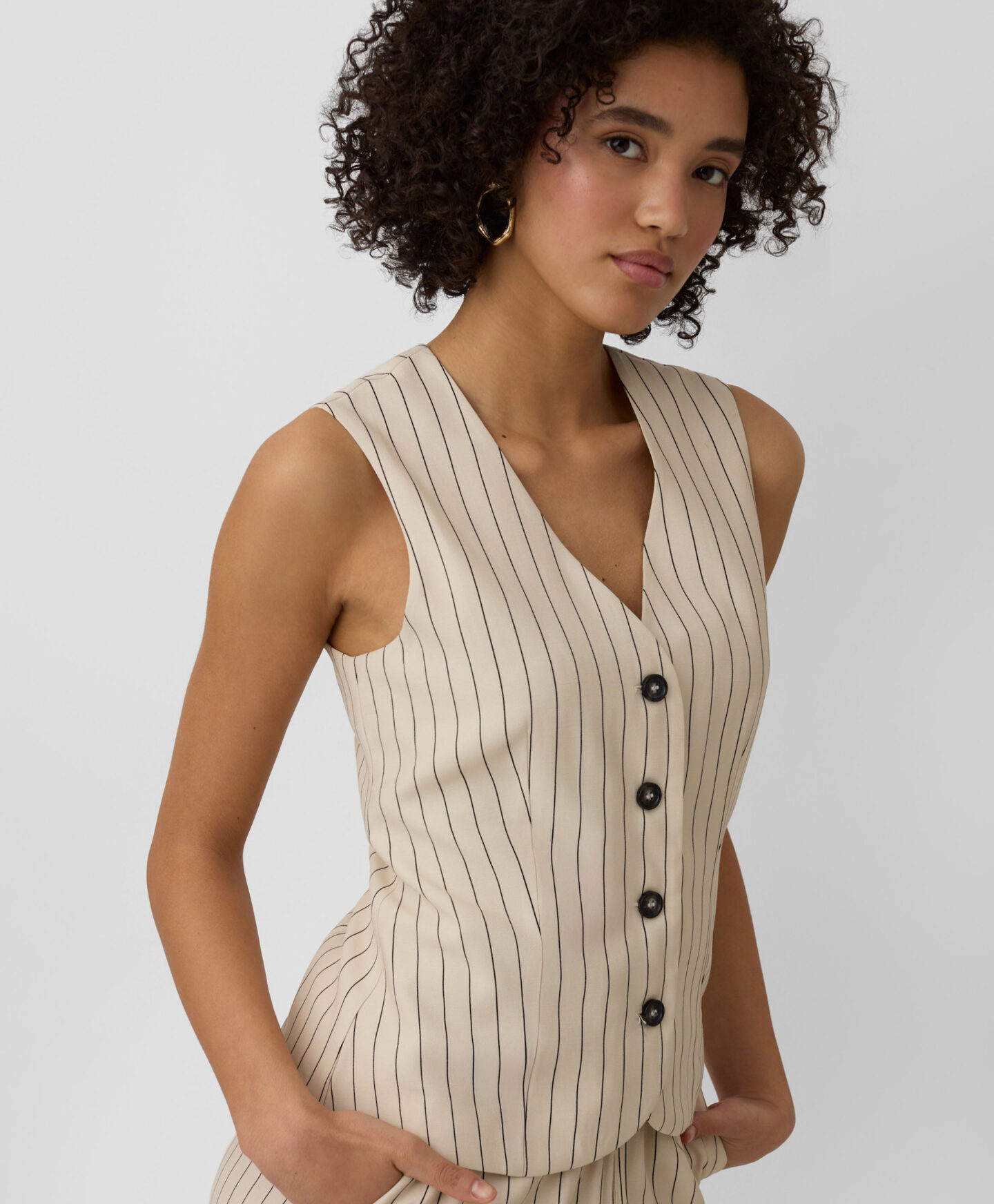 Prugasti prsluk za žene savršeno se slaže s hlačama istog uzorka. Visok udio viskoze čini ga laganim, prozračnim i savršenim za tople dane. Prigušene boje čine ga veoma svestranim za stilizovanje.