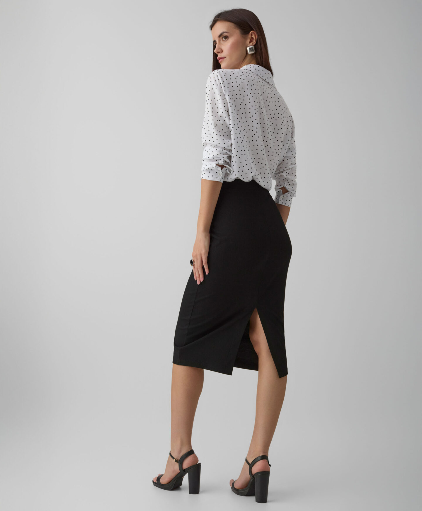 Prugasta suknja s prorezom neizostavan je komad garderobe. Odlično izgleda uz klasičnu majicu, ali i uz elegantnu košulju. Univerzalna boja omogućava brojne uspješne kombinacije. Prednji prorez naglašava figuru i vizuelno izdužuje noge. Suknja je lagana, prijatna na dodir i otporna na pranje.