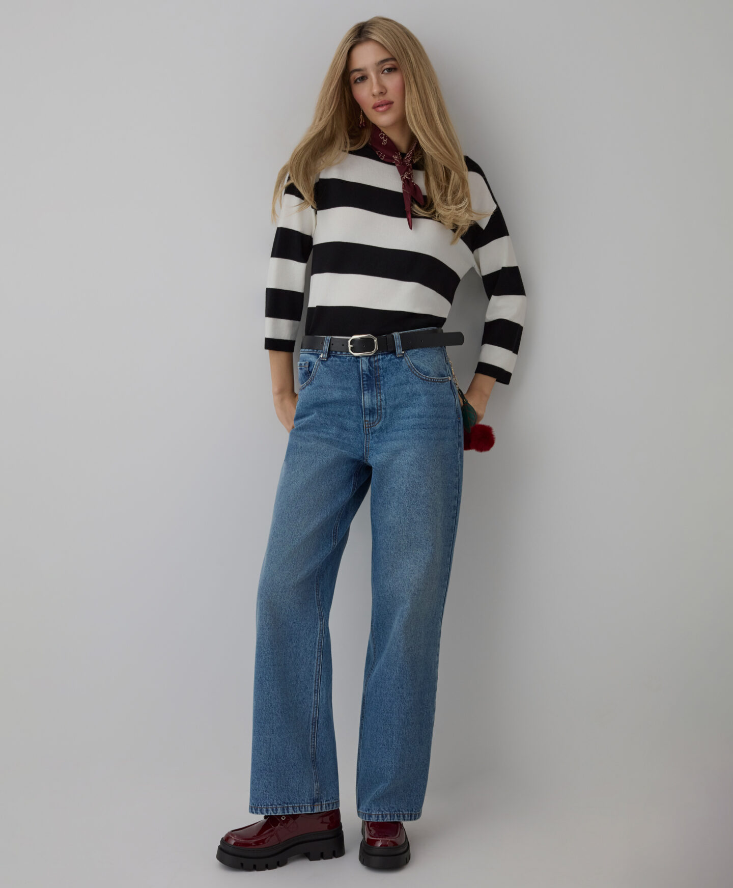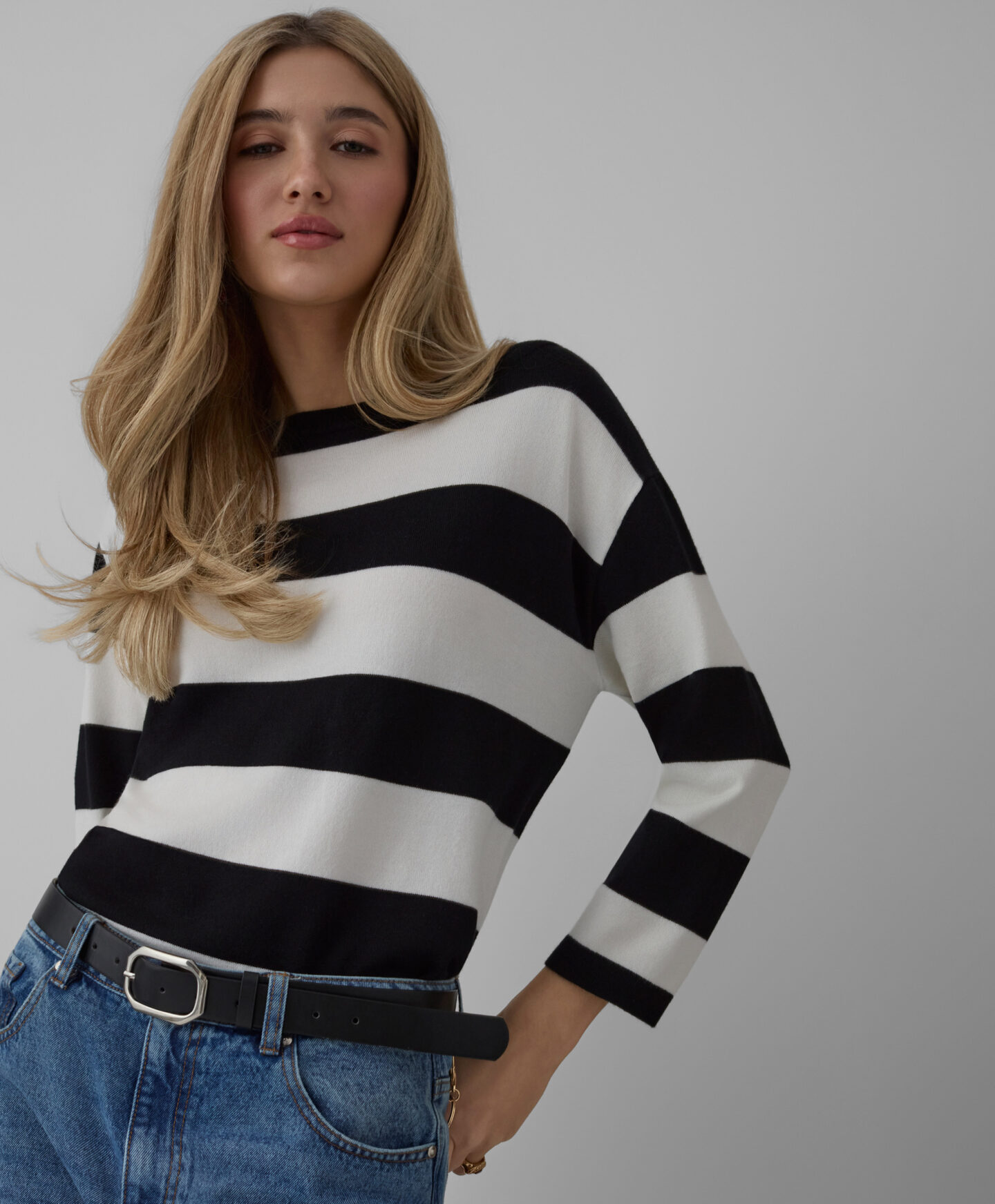 Prugasti džemper za žene ističe se svojim jedinstvenim krojem. Dodatak viskoze čini džemper mekanim i prozračnim, pružajući udobnost tokom cijelog dana. Kimono stil daje mu poseban karakter i osigurava slobodu kretanja.