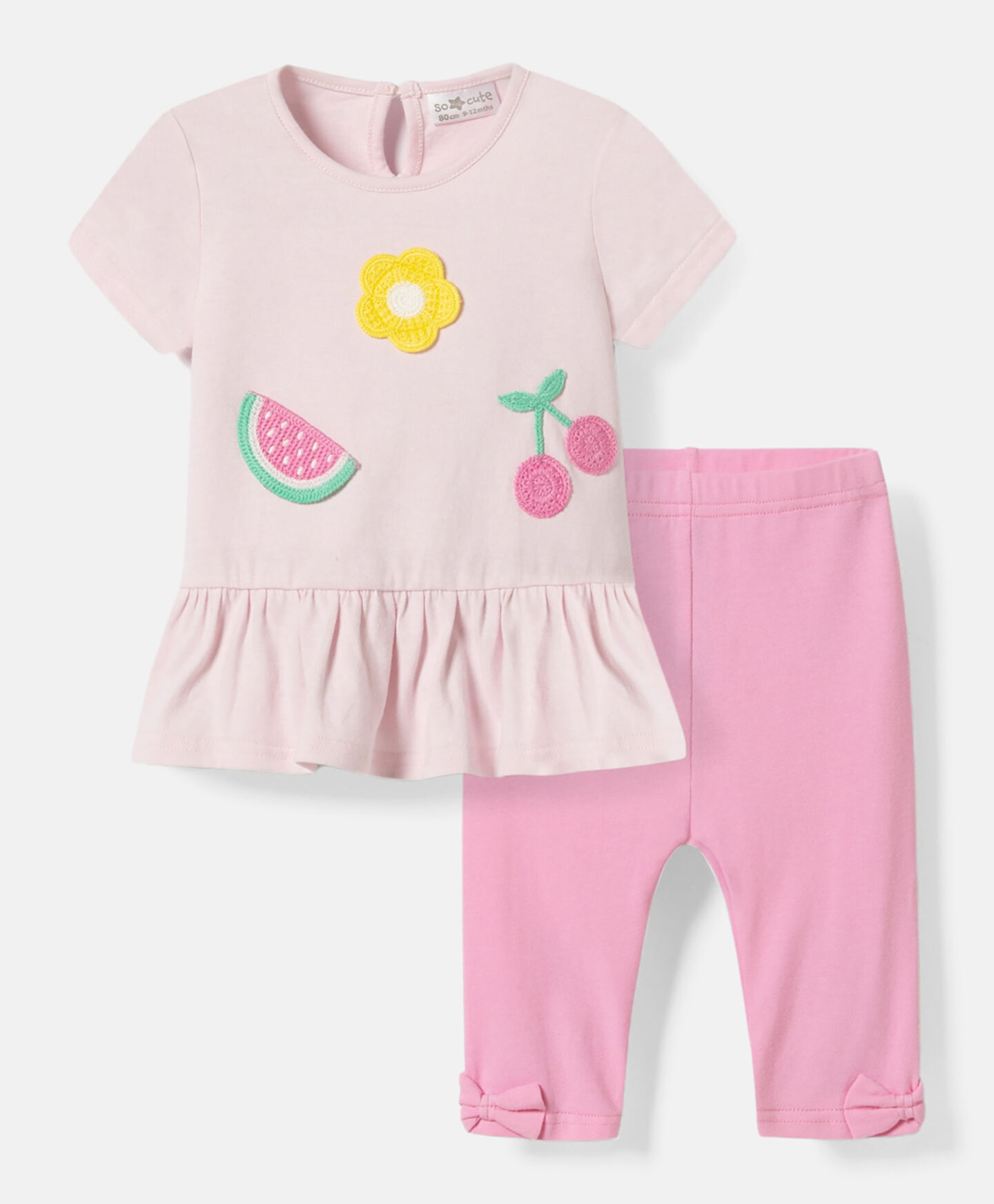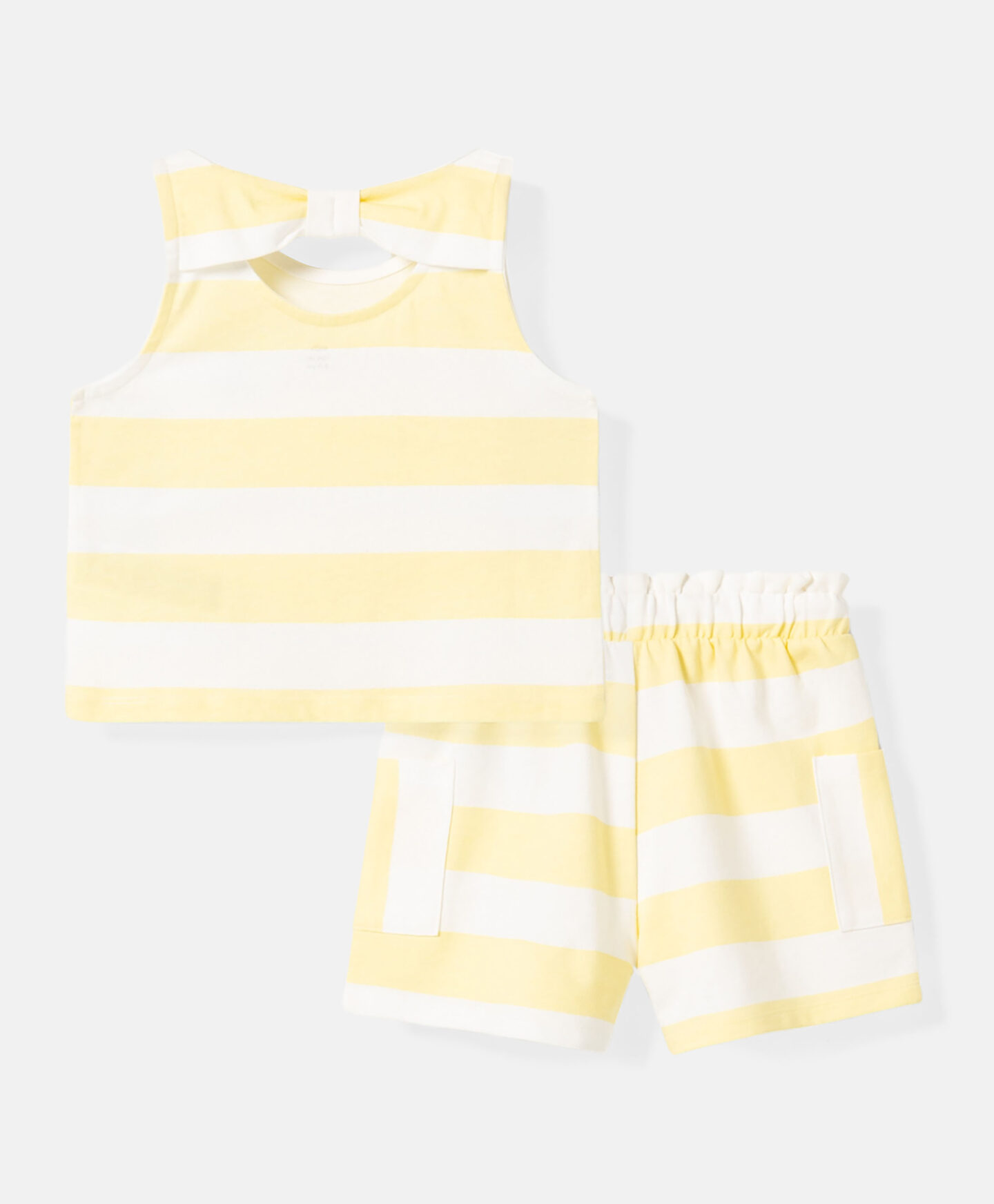 Prugasti set za djevojčice praktična je ljetna kombinacija spremna za nošenje. Set uključuje usklađeni top i šorc, a pruge daju svjež, moderan i razigran izgled. Izrađen od 100% pamuka, omogućava koži da diše i u toplim danima.