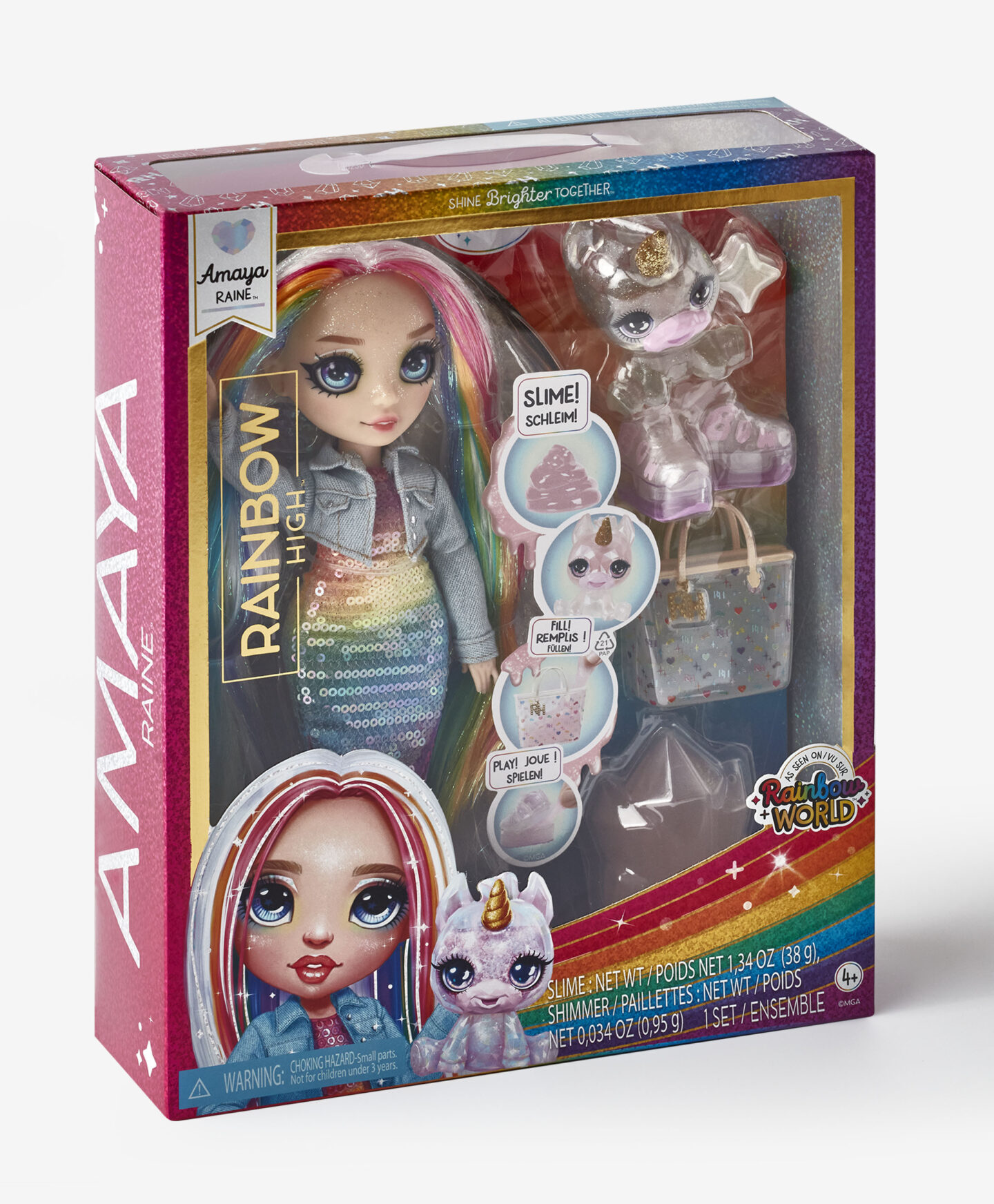 Rainbow High Amaya Raine očarava svojom dugom, šarenom kosom i prepoznatljivim „rainbow“ stilom. Njena odjeća sjaji u mnoštvu nijansi i detalja, a uz nju dolaze i dodaci poput kućnog ljubimca ili ljigavca, koji igru čine još zabavnijom. Vrijeme provedeno s njom potiče maštu i bezbroj načina za kreativno izražavanje.