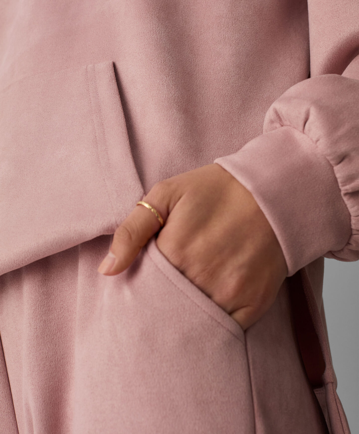 Roze antilop hlače s džepovima za žene predstavljaju moderan i udoban izbor za svaki dan. Mekane su, prijatne na dodir i idealne za jesenje šetnje. Prigušena nijansa roze savršeno se slaže s duksericom s kapuljačom iz iste kolekcije. U ponudi su dostupni različiti dezeni.