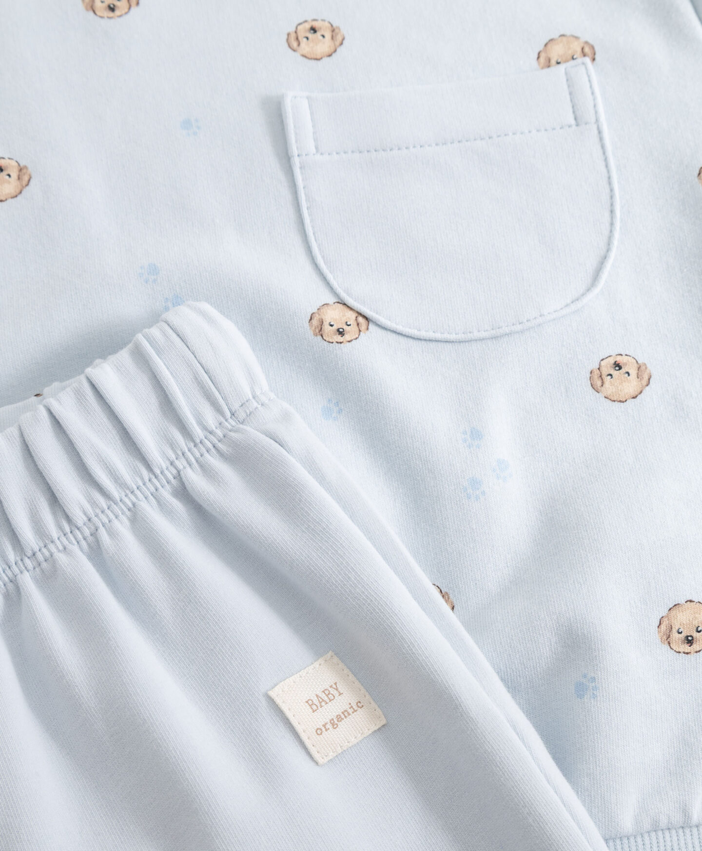 Set za bebe-dječake sastoji se od majice i hlača s motivom psa. Suptilna plava boja savršeno će se uklopiti u bebinu garderobu. Elastične ranfle na oba dijela osiguravaju toplinu i udobnost. Mekani materijal s visokim udjelom pamuka idealan je za nošenje od prvih dana života.